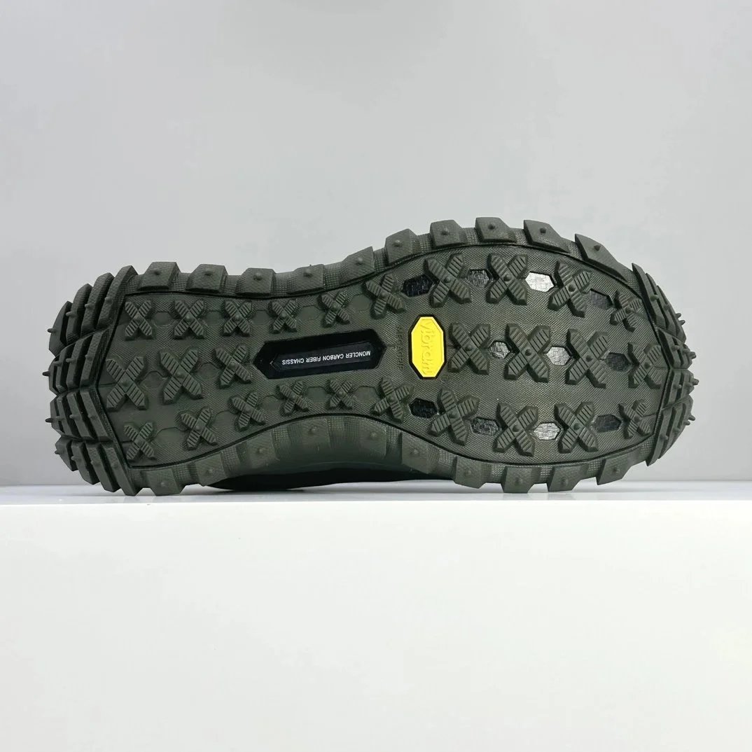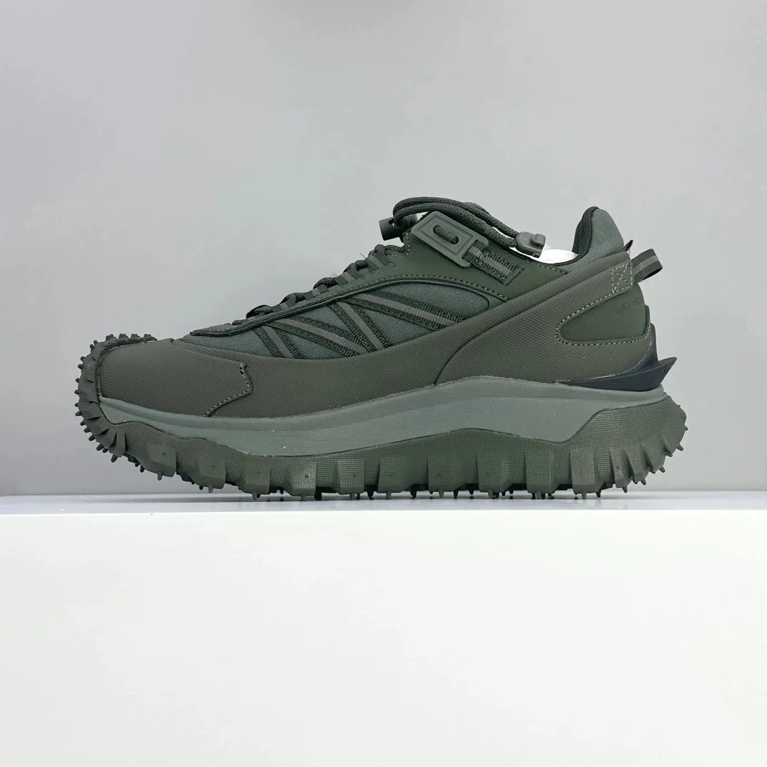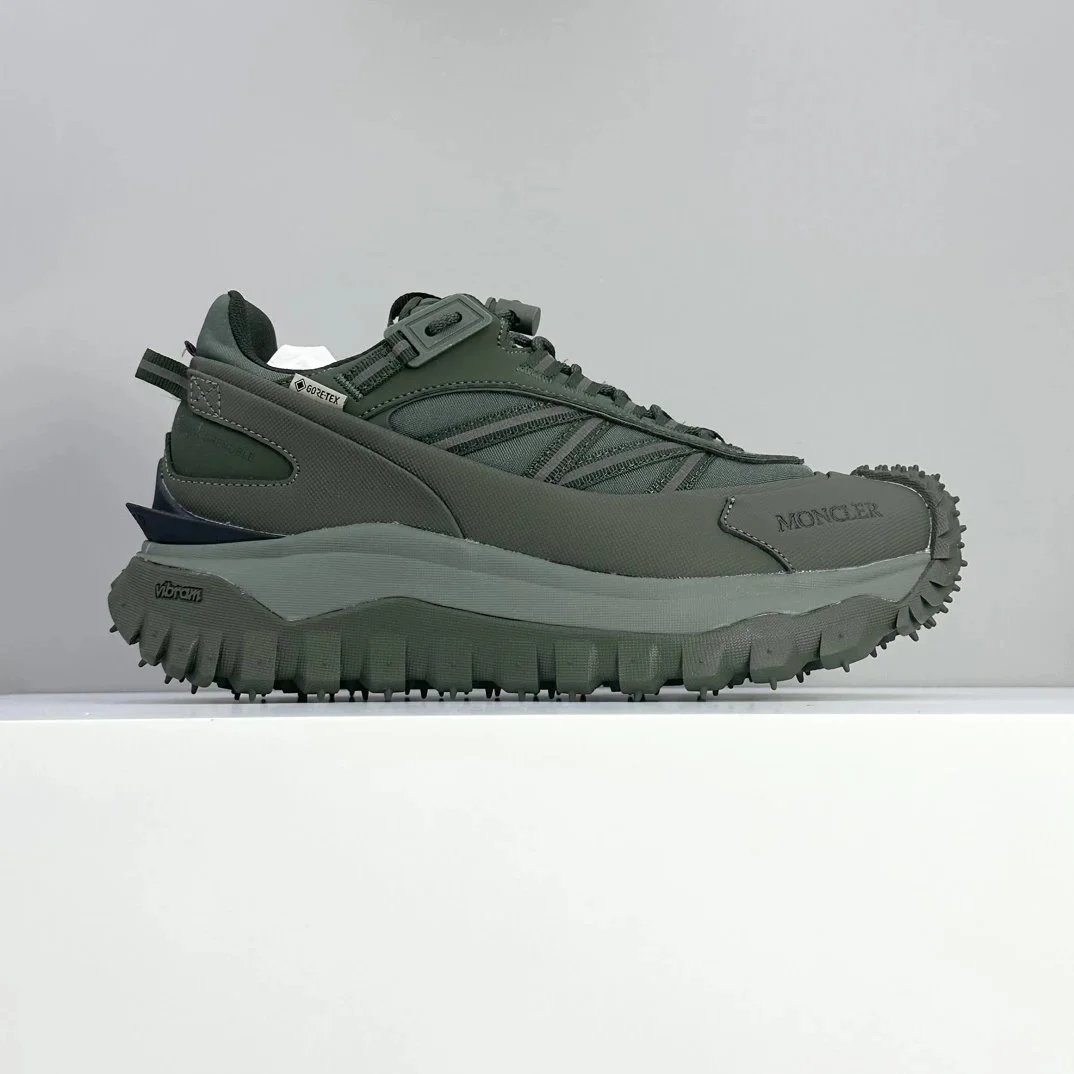 Moncler's rugged green hiking sneaker features GORE-TEX waterproofing and a durable Vibram outsole for superior traction on trails.
