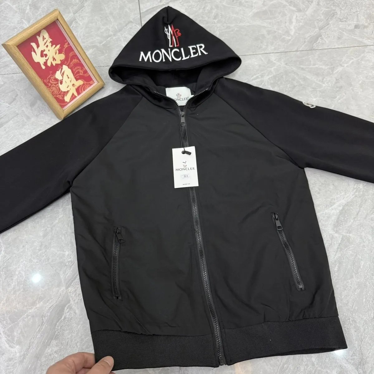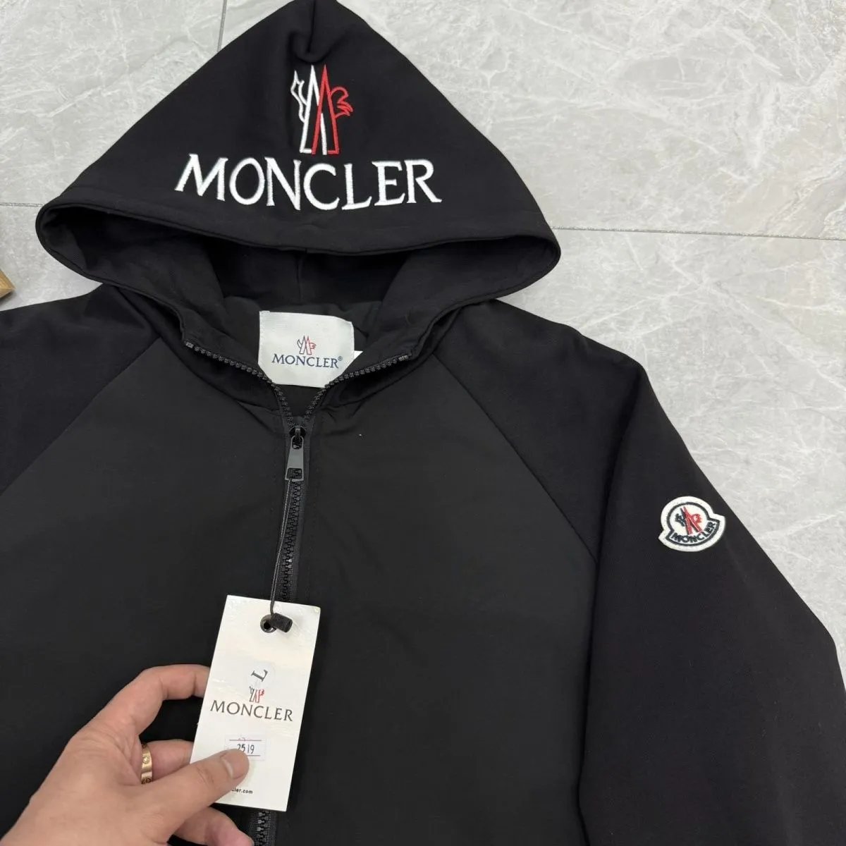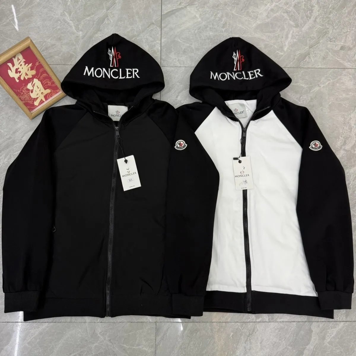 Luxury Moncler hooded zip-up jackets in sleek black and bold black-white colorways. Perfect for casual wear with premium branding and functional design.