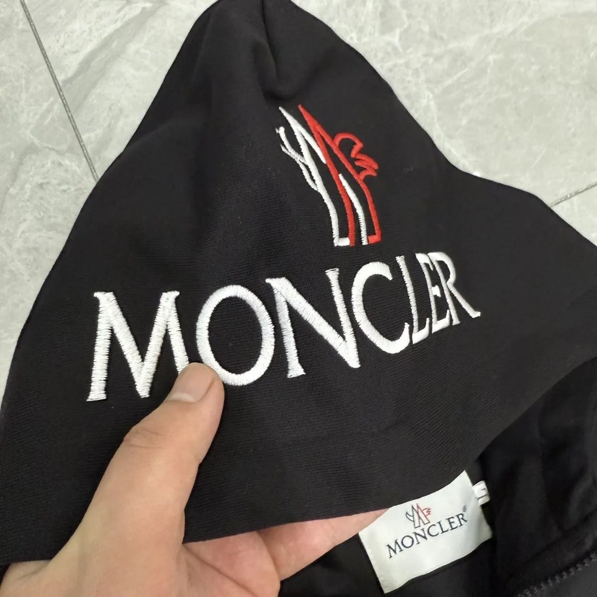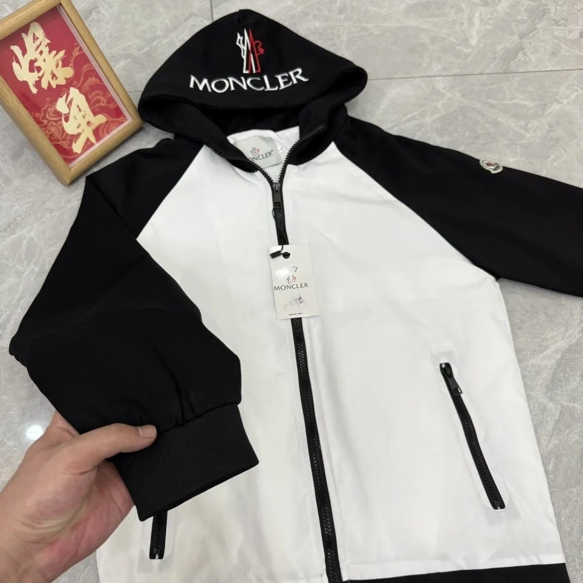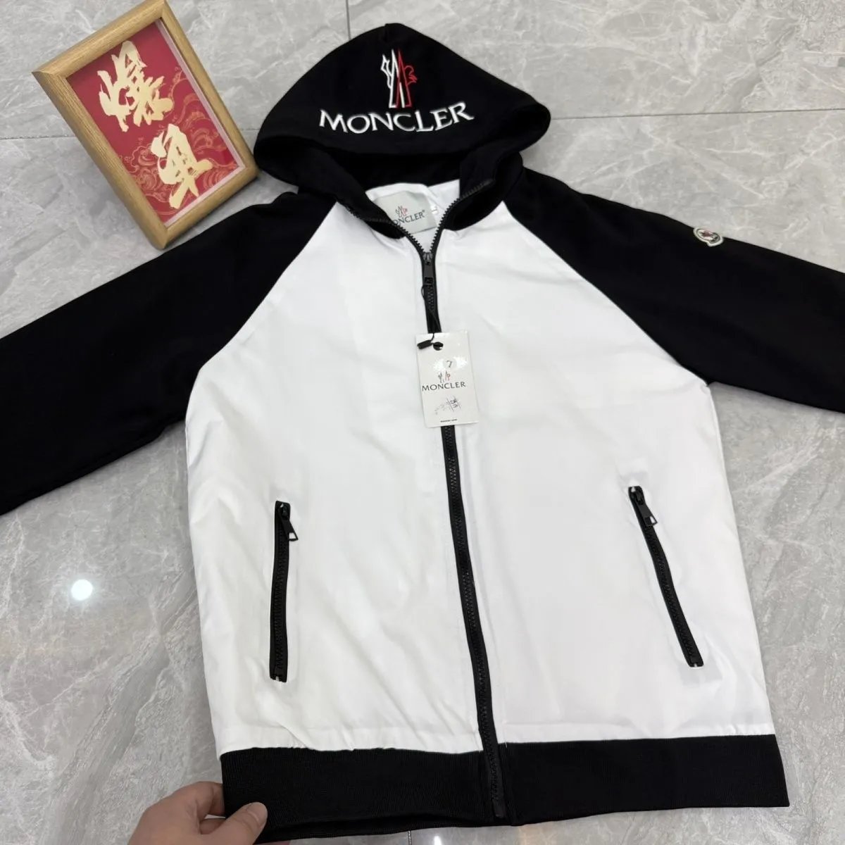Luxury Moncler hooded zip-up jackets in sleek black and bold black-white colorways. Perfect for casual wear with premium branding and functional design.