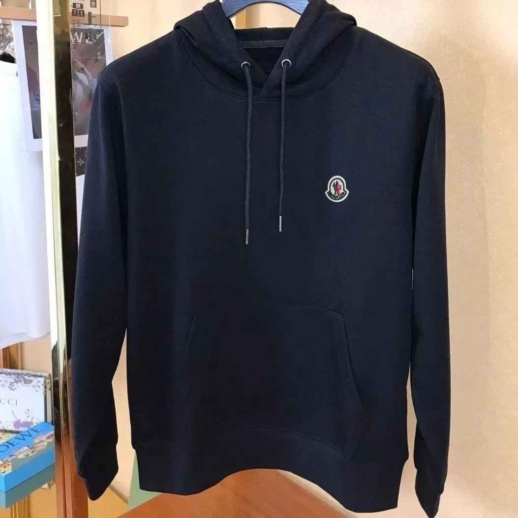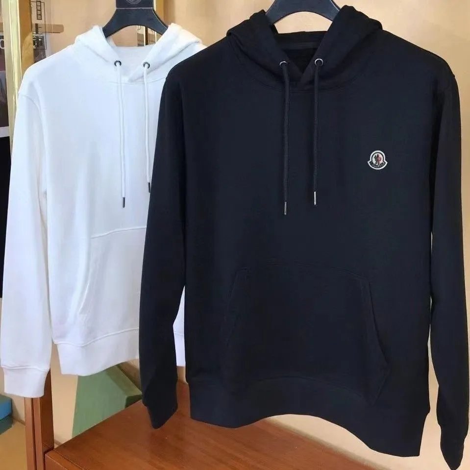Premium Moncler hoodies in black and white featuring the iconic embroidered logo patch. Soft, comfortable, and stylish for everyday wear.