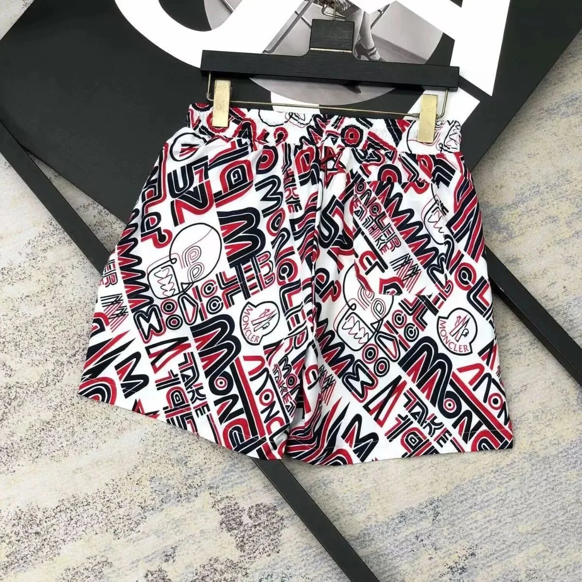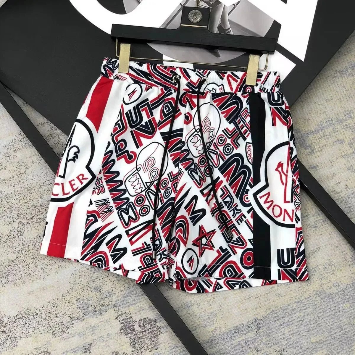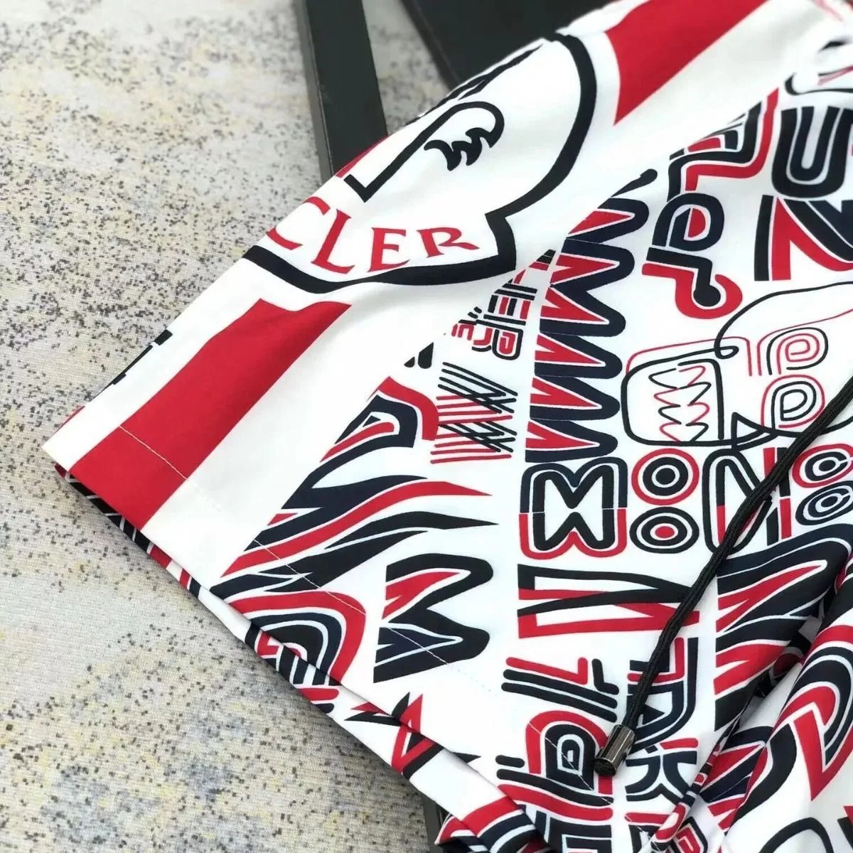 Stylish Moncler printed drawstring shorts featuring a bold black and white graphic design with brand logos and abstract patterns. Perfect for a modern, fashion-forward look.