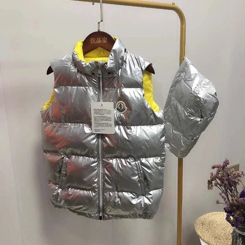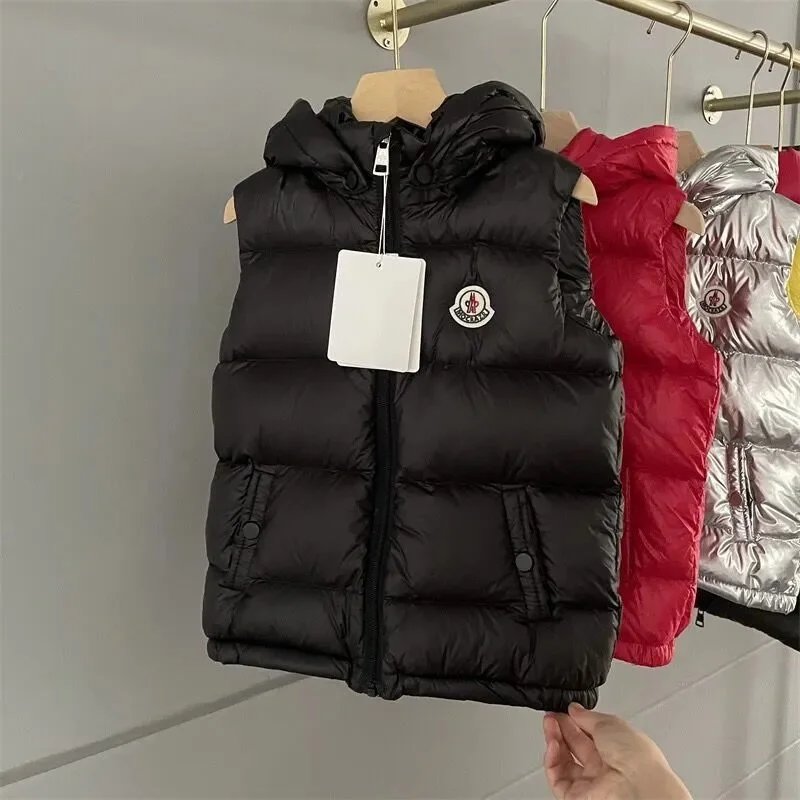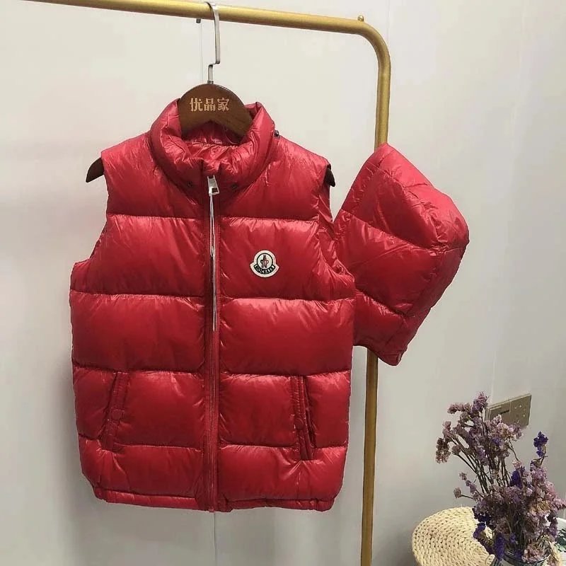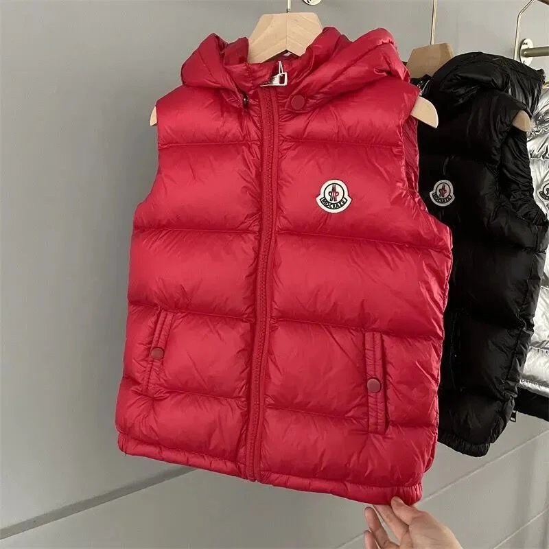 Premium Moncler red quilted down vest featuring a hood and front zipper closure. Ideal for cold weather, this lightweight yet warm vest combines style and functionality.