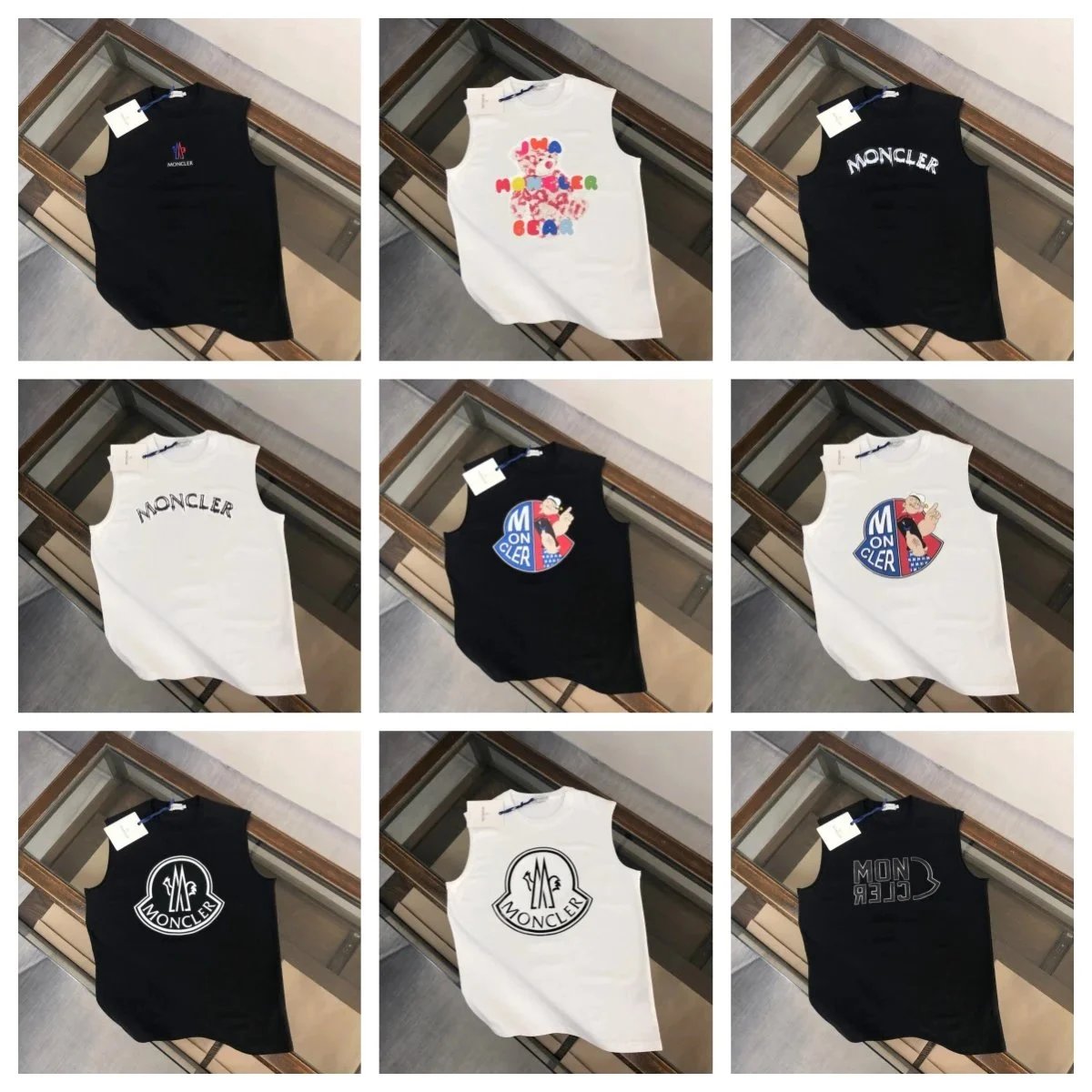 Discover Moncler’s collection of sleeveless t-shirts featuring bold logo prints and playful character designs in black and white. Perfect for casual or streetwear looks.