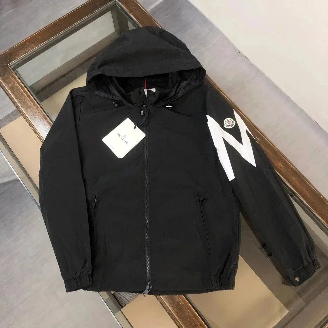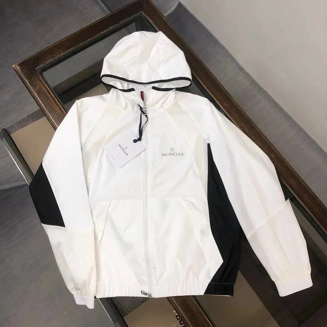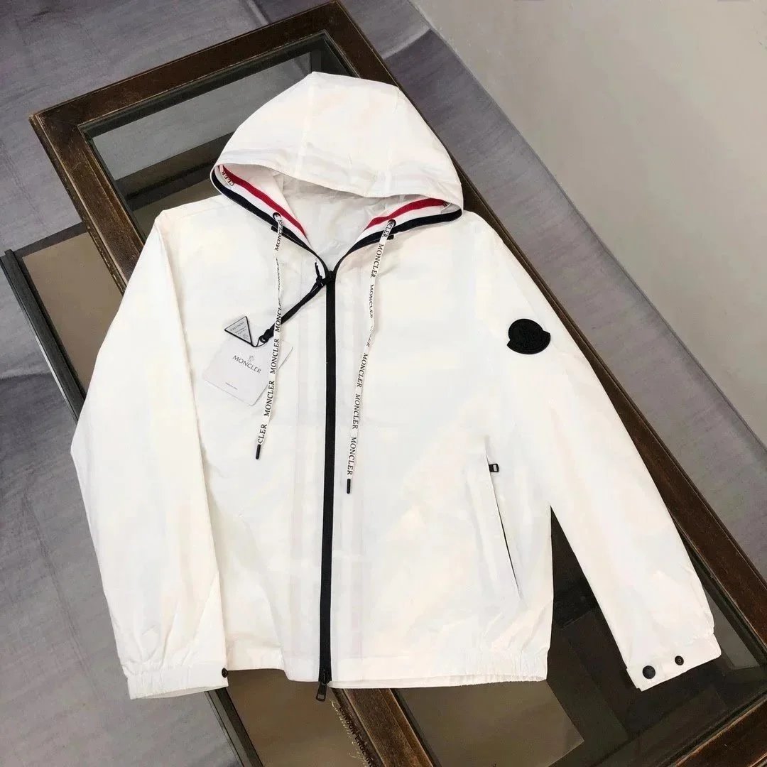 Stylish Moncler white hooded jacket featuring a bold black M logo on the sleeve and premium detailing. Perfect for casual wear with a sporty, luxurious touch.