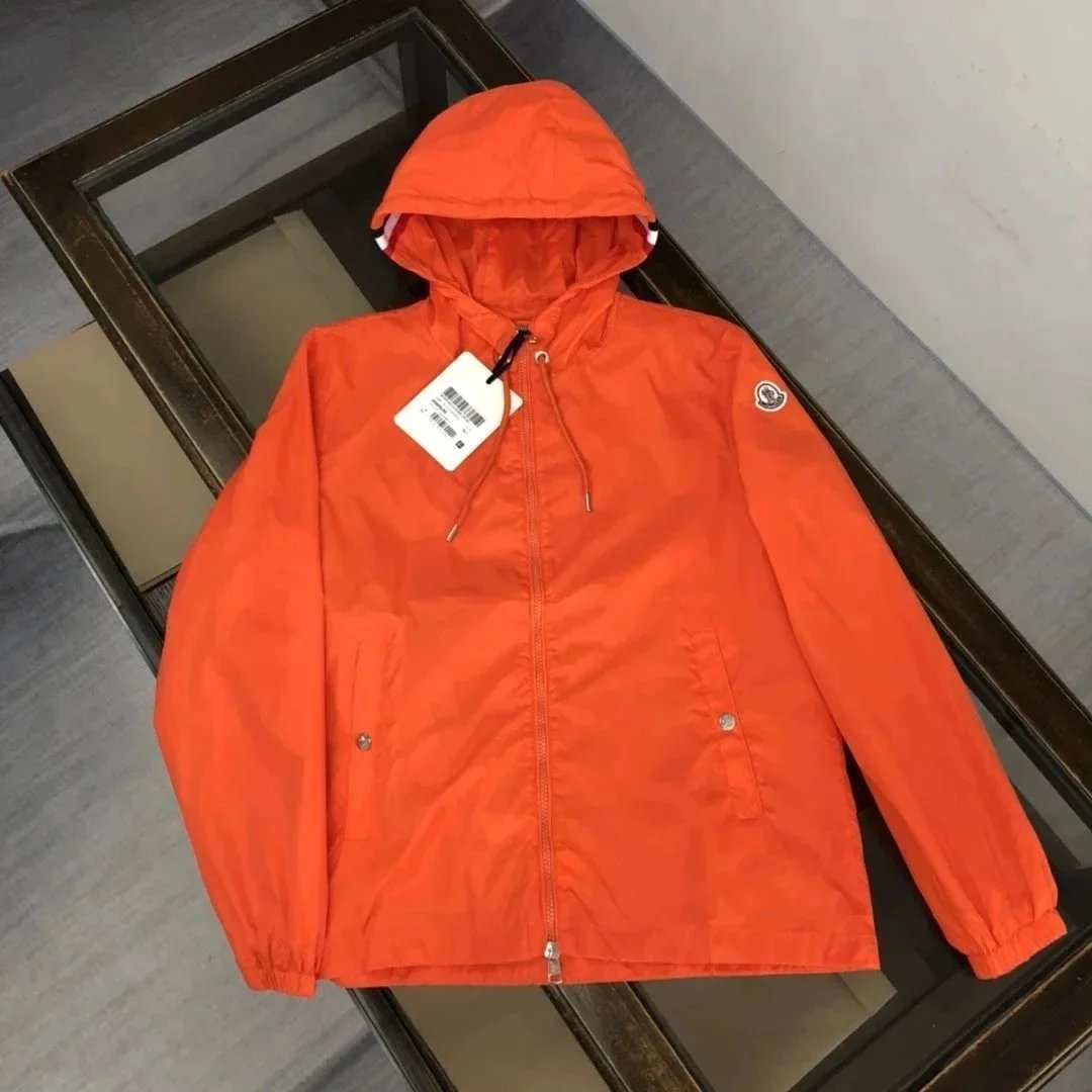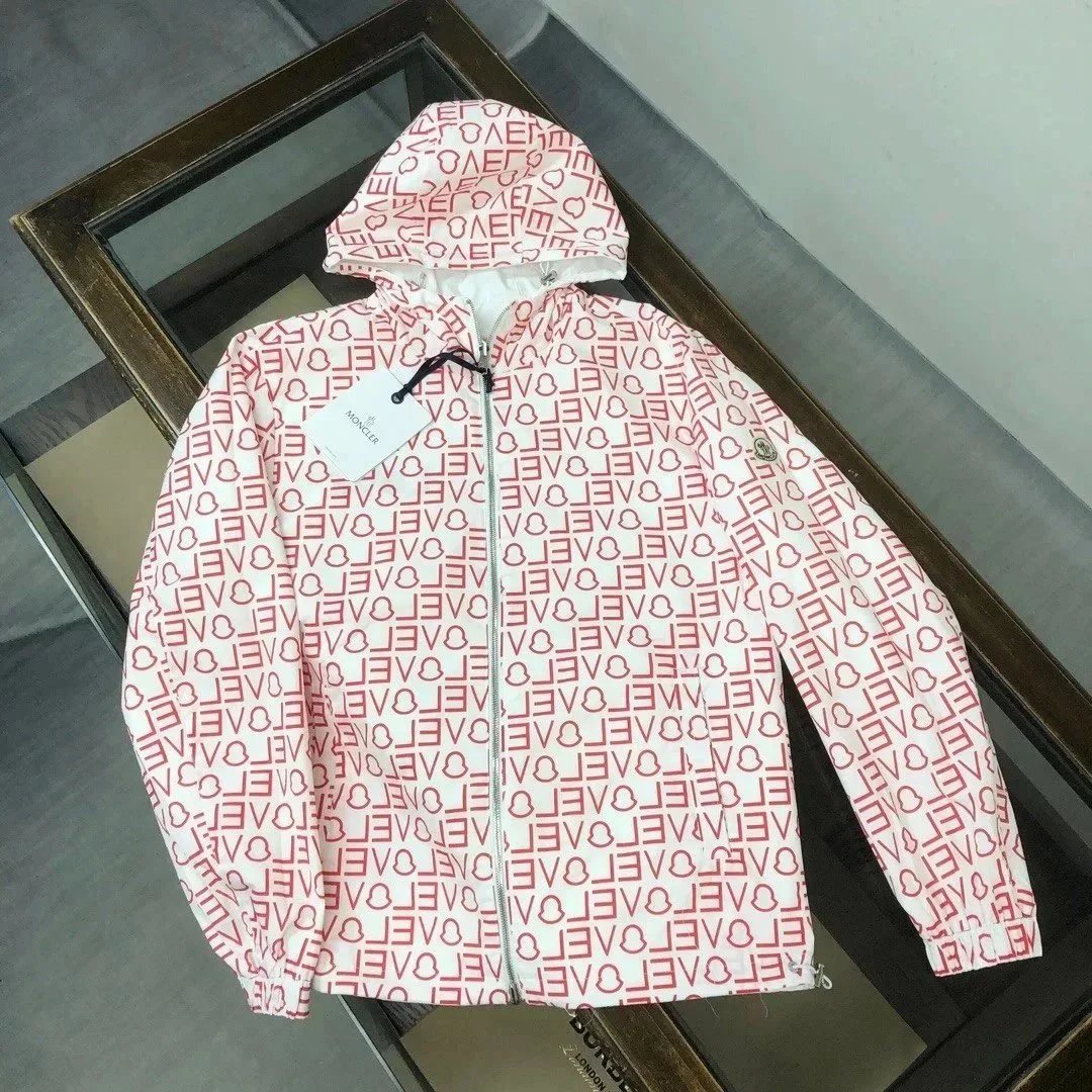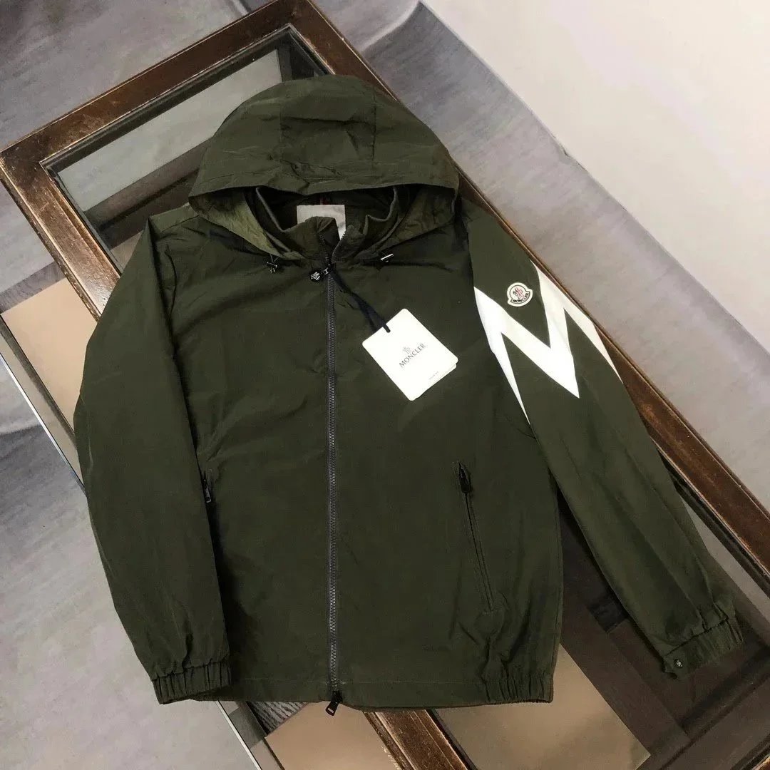 Stylish Moncler white hooded jacket featuring a bold black M logo on the sleeve and premium detailing. Perfect for casual wear with a sporty, luxurious touch.