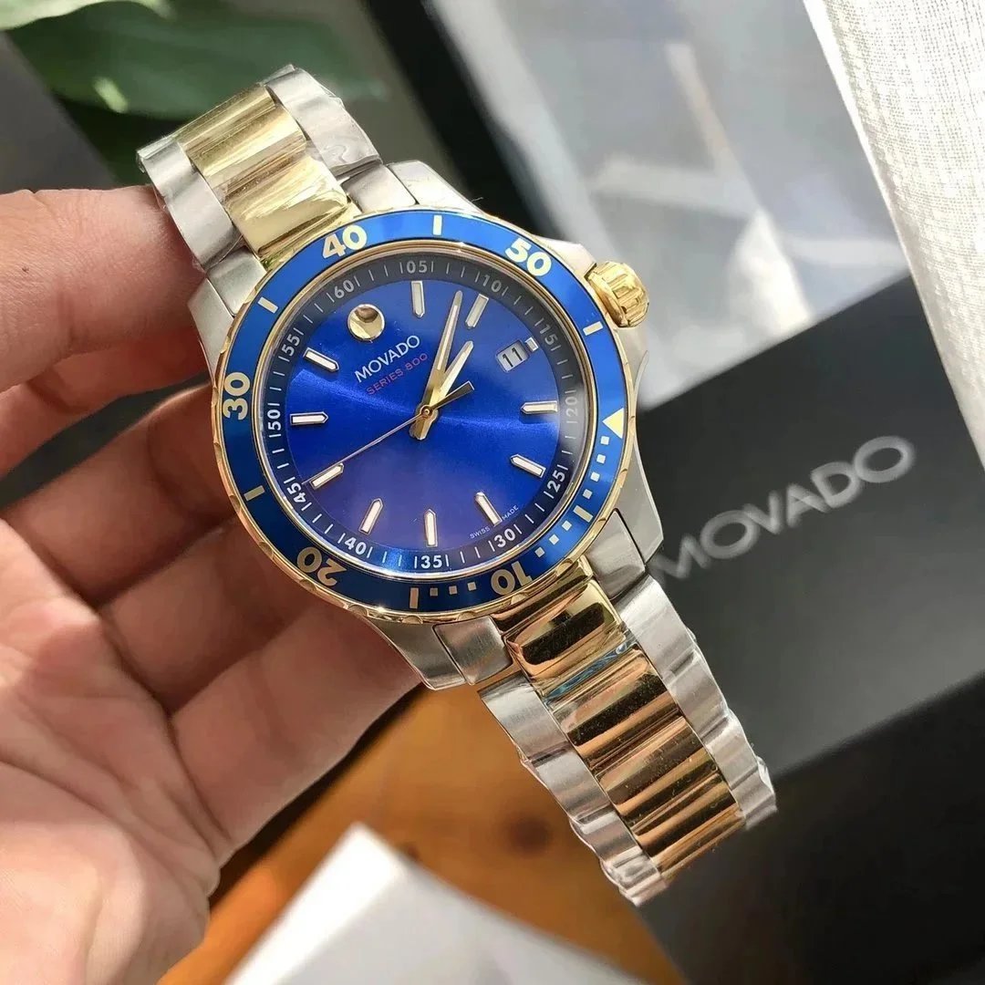 Elegant Movado Series 800 men's watch featuring a sleek black dial, gold and silver two-tone bracelet, and a durable stainless steel case. Perfect for timeless style and precision.