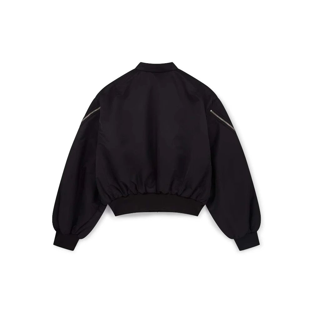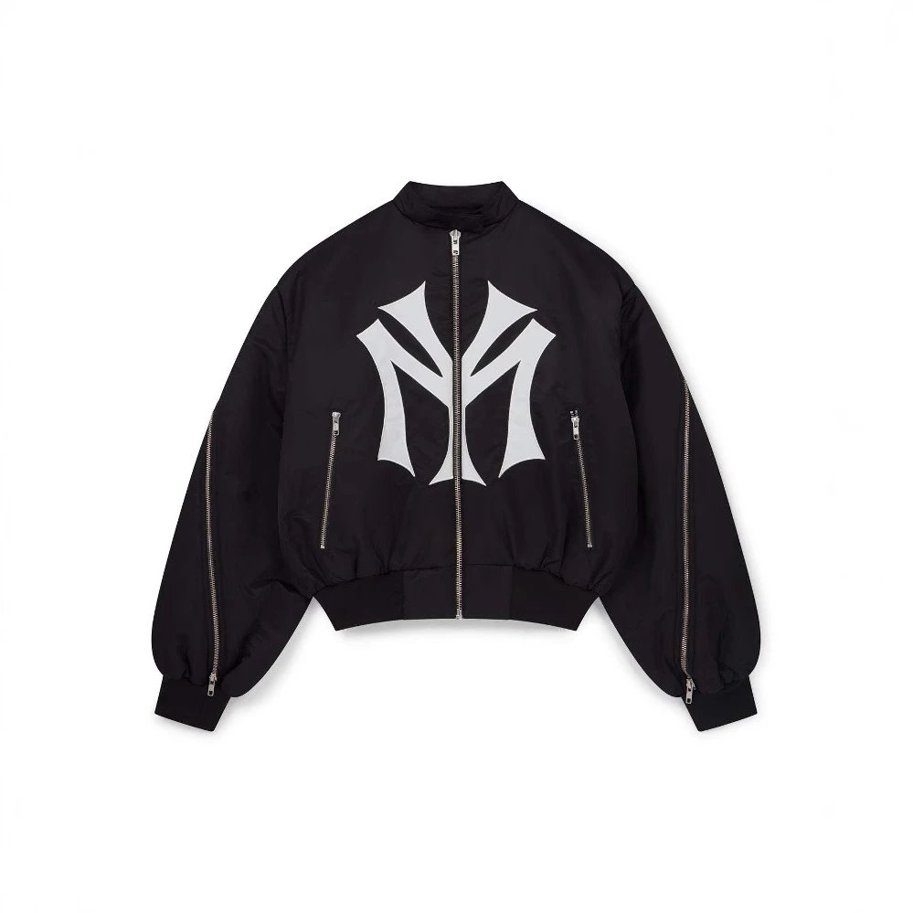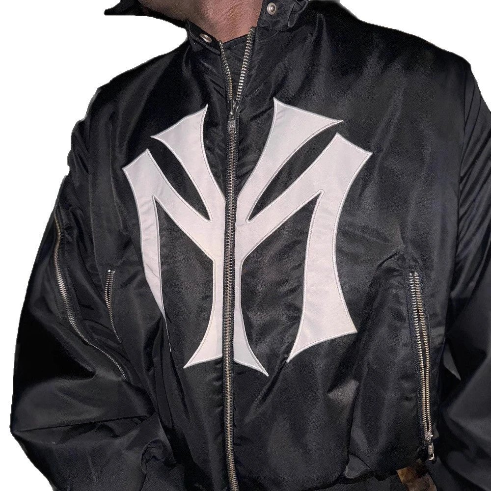 Stylish black bomber jacket featuring the iconic New York Yankees 'NY' logo in bold white. Perfect for fans and fashion-forward looks.