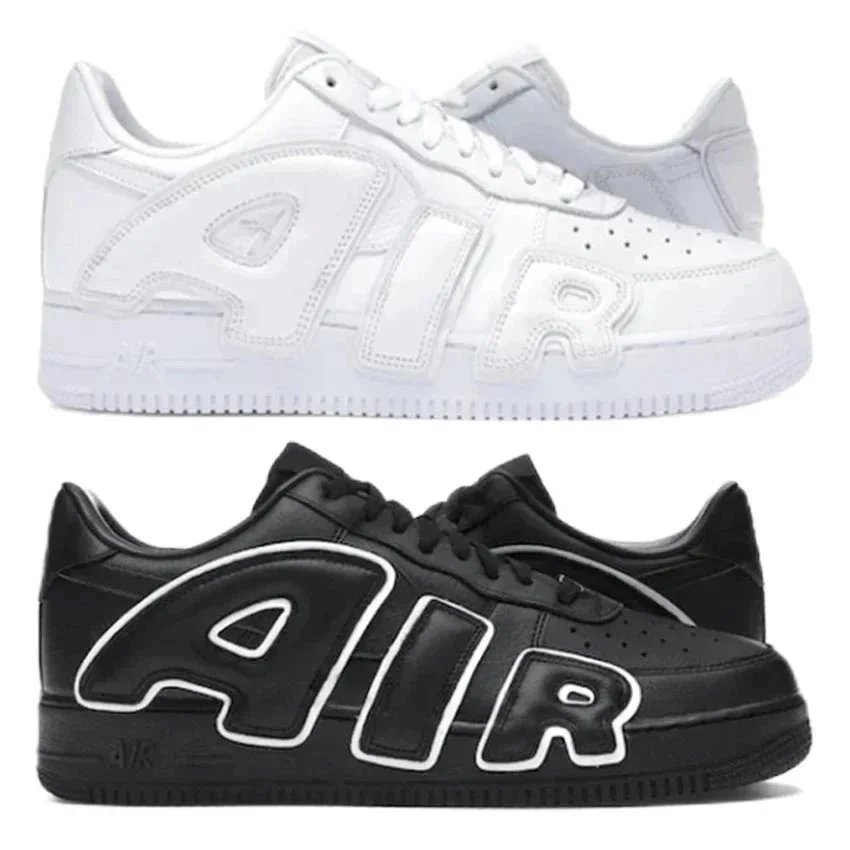 Classic Nike Air Force 1 sneakers featuring bold 'AIR' logo detailing in white and black colorways. Designed for comfort and style with signature silhouette and premium materials.