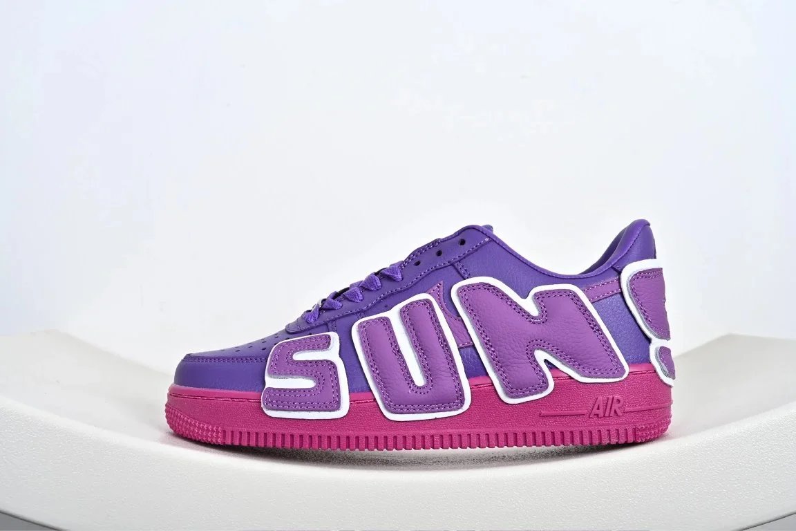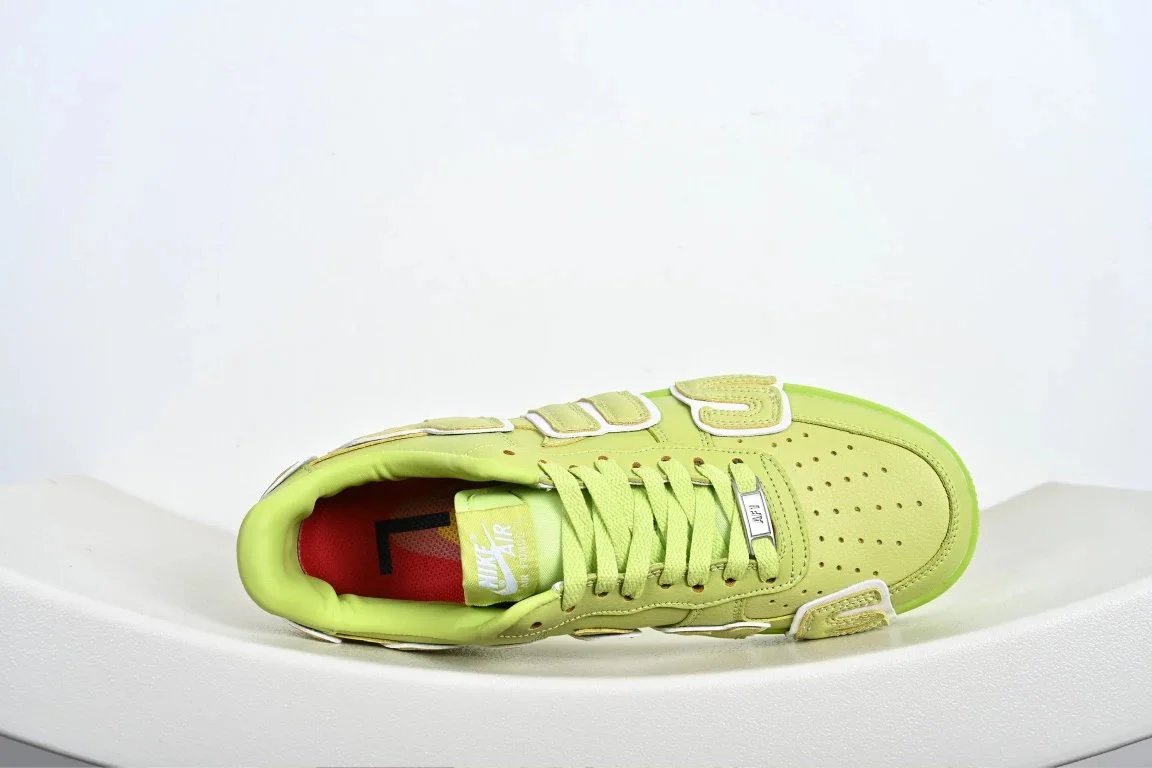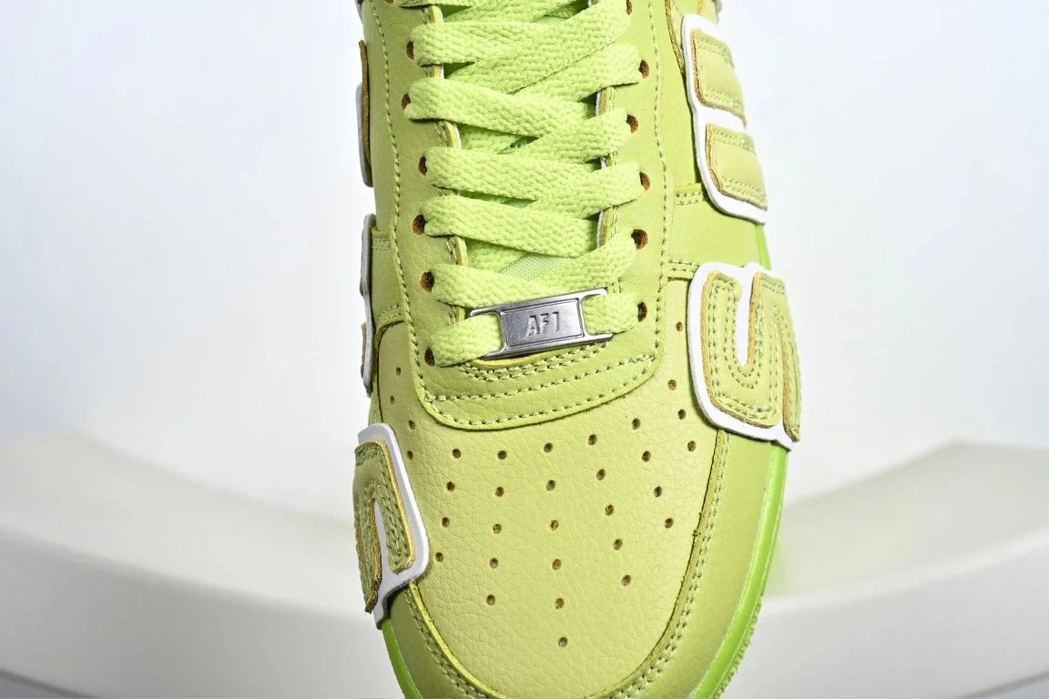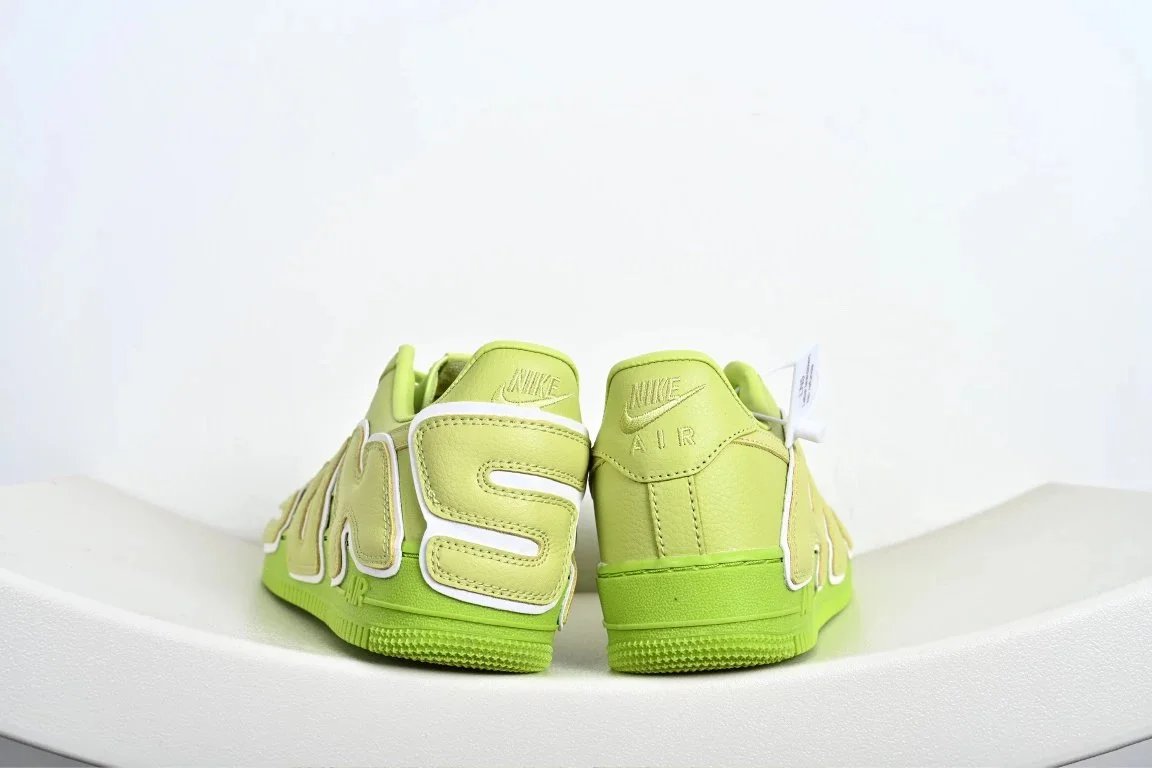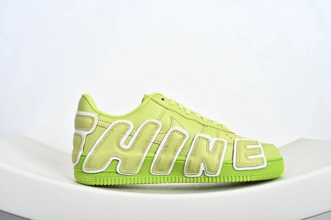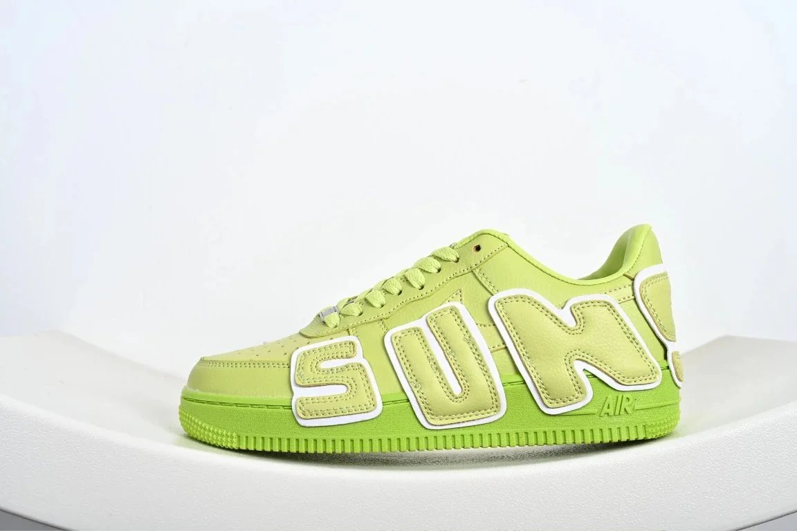 Bold lime green Nike Air Force 1 sneakers featuring oversized 'AIR SUN' lettering for a standout streetwear look.