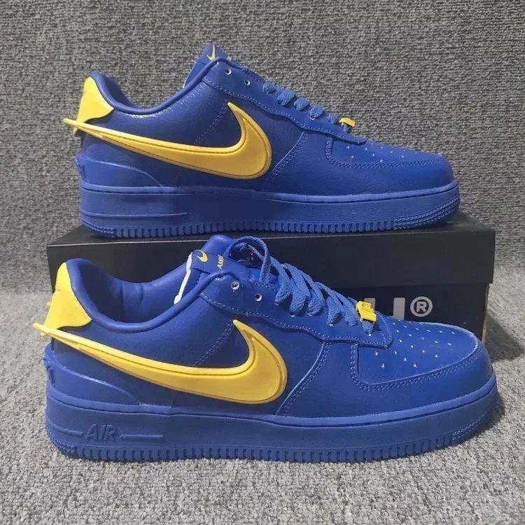 Shop classic Nike Air Force 1 Low sneakers in bold colorways including black/white, royal blue/yellow, neon yellow/black, and all-white. Perfect for everyday style.