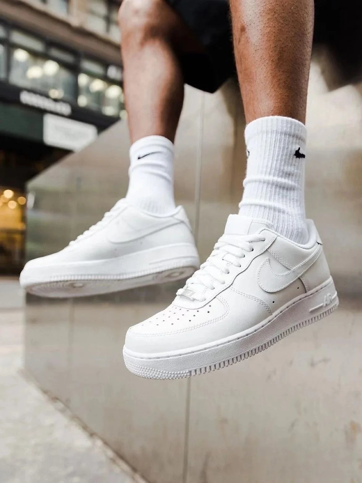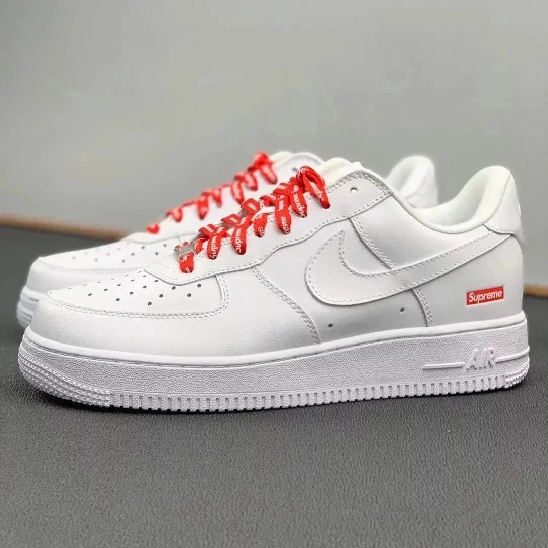 Authentic Nike Air Force 1 Low featuring the iconic Supreme box logo on the heel. Available in classic white, black, and beige colorways for streetwear style.