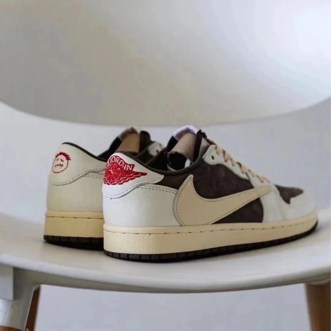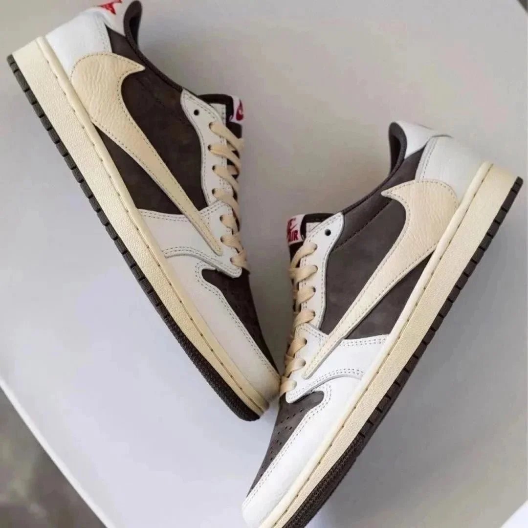 Classic Nike Air Jordan 1 Low in premium brown and white suede with vintage cream sole. Perfect for streetwear and everyday style.