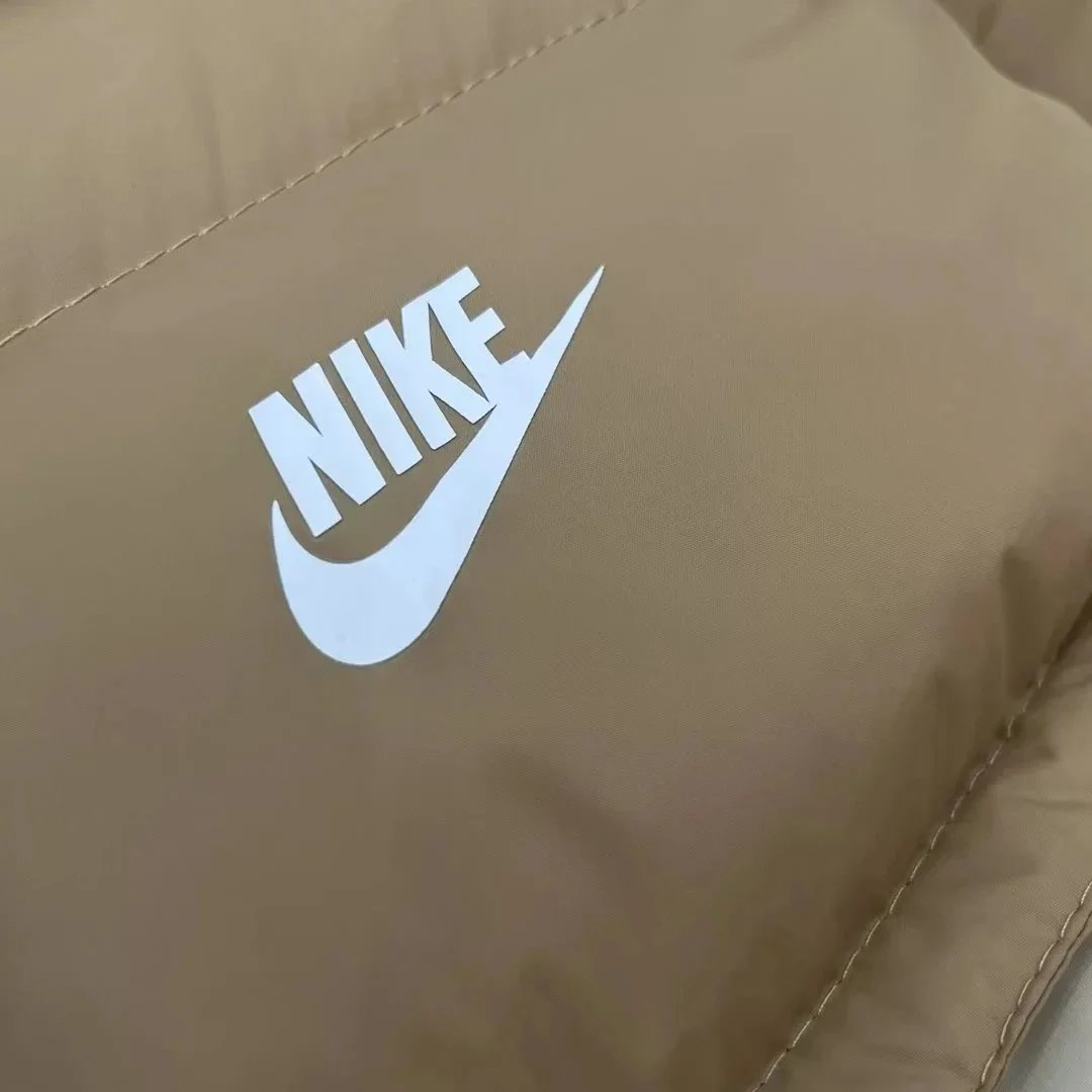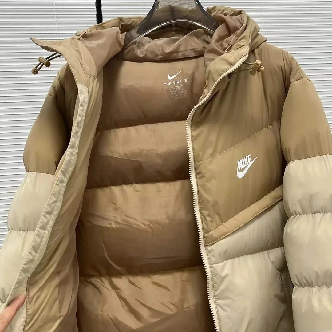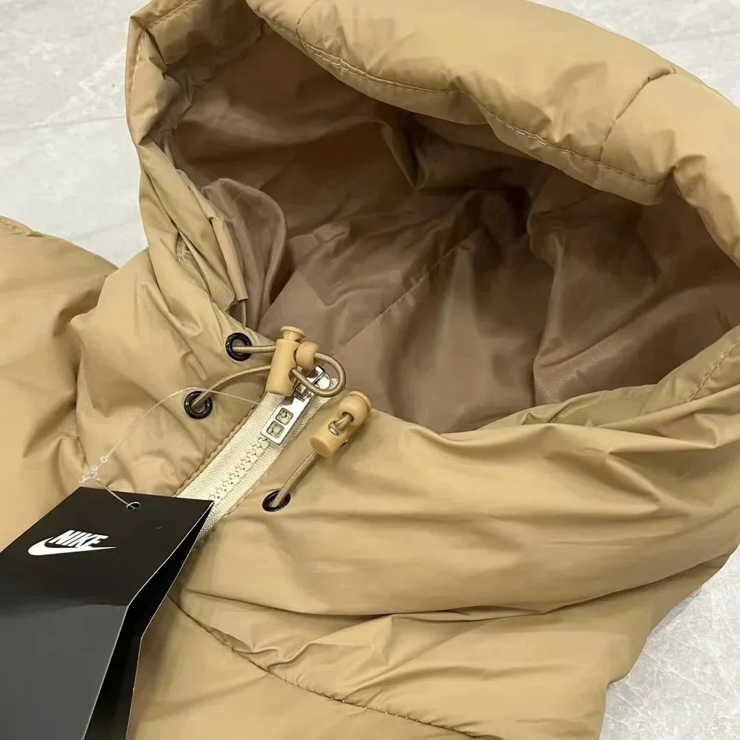 Stylish black Nike puffer jacket featuring a hood, front zipper, and iconic white Nike logo. Perfect for cold weather with a sleek, modern design.