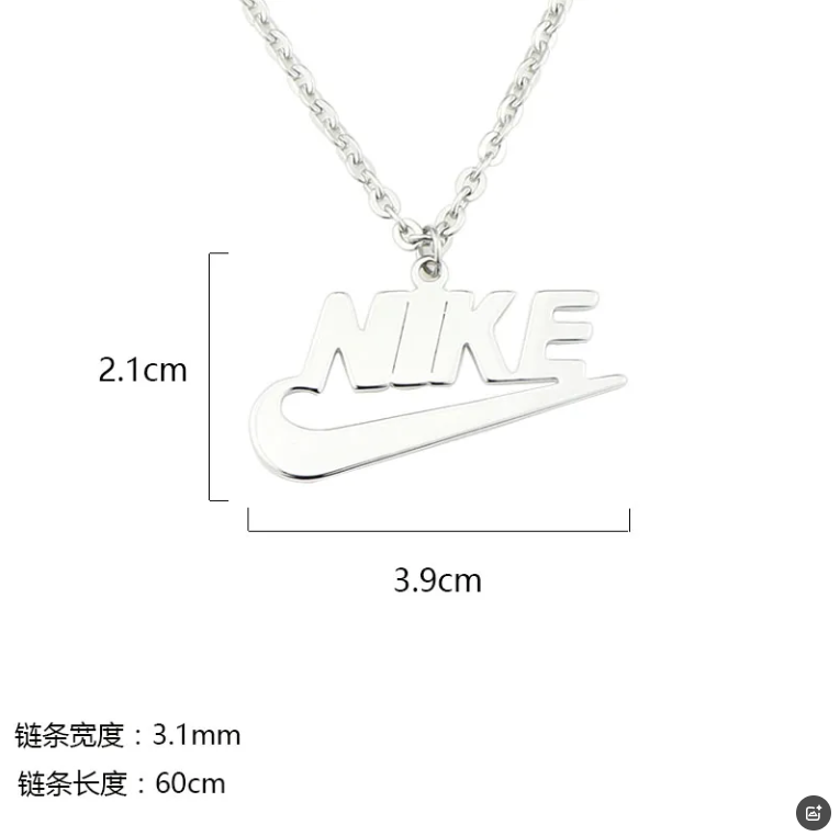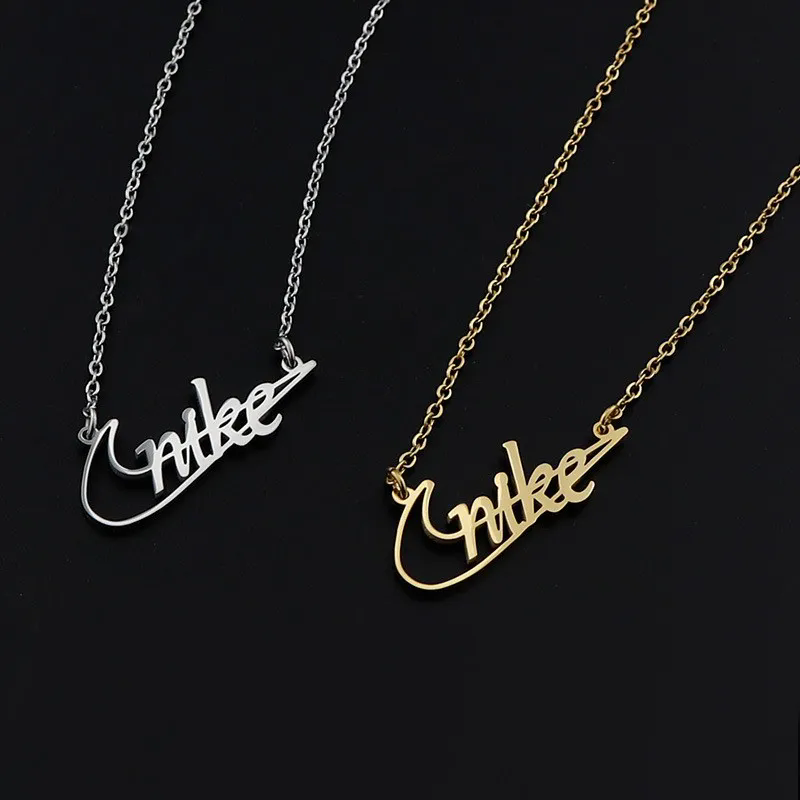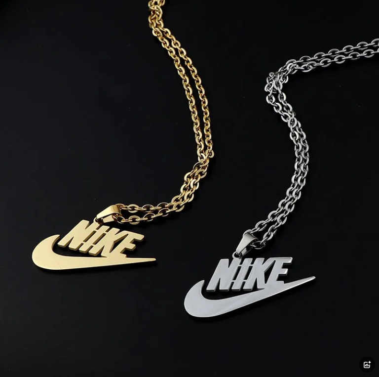 Stylish Nike logo necklaces in silver and gold finishes. Perfect for fans of the iconic brand, featuring a sleek script design on a delicate chain.