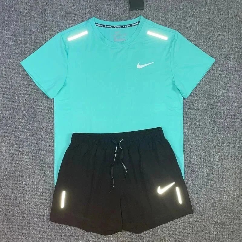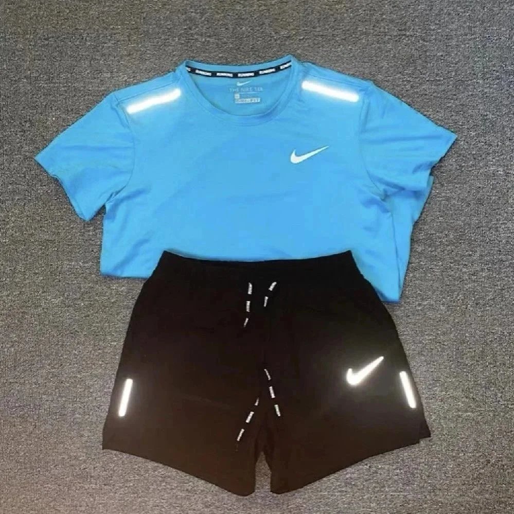 Complete Nike athletic sets featuring short sleeve t-shirts and matching shorts with reflective details for visibility during workouts. Ideal for running, training, or gym sessions.