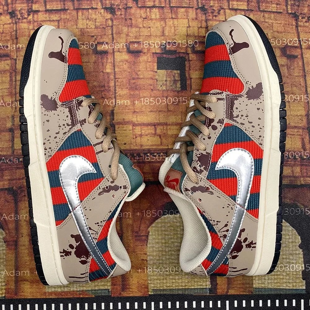 Boldly designed Nike SB Dunk Low featuring vibrant red and blue stripes with splatter detailing — perfect for skateboarding and streetwear style.