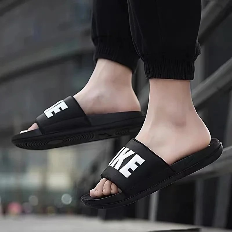 Comfortable Nike slide sandals in multiple colorways including black with white and yellow branding. Perfect for poolside or casual wear.