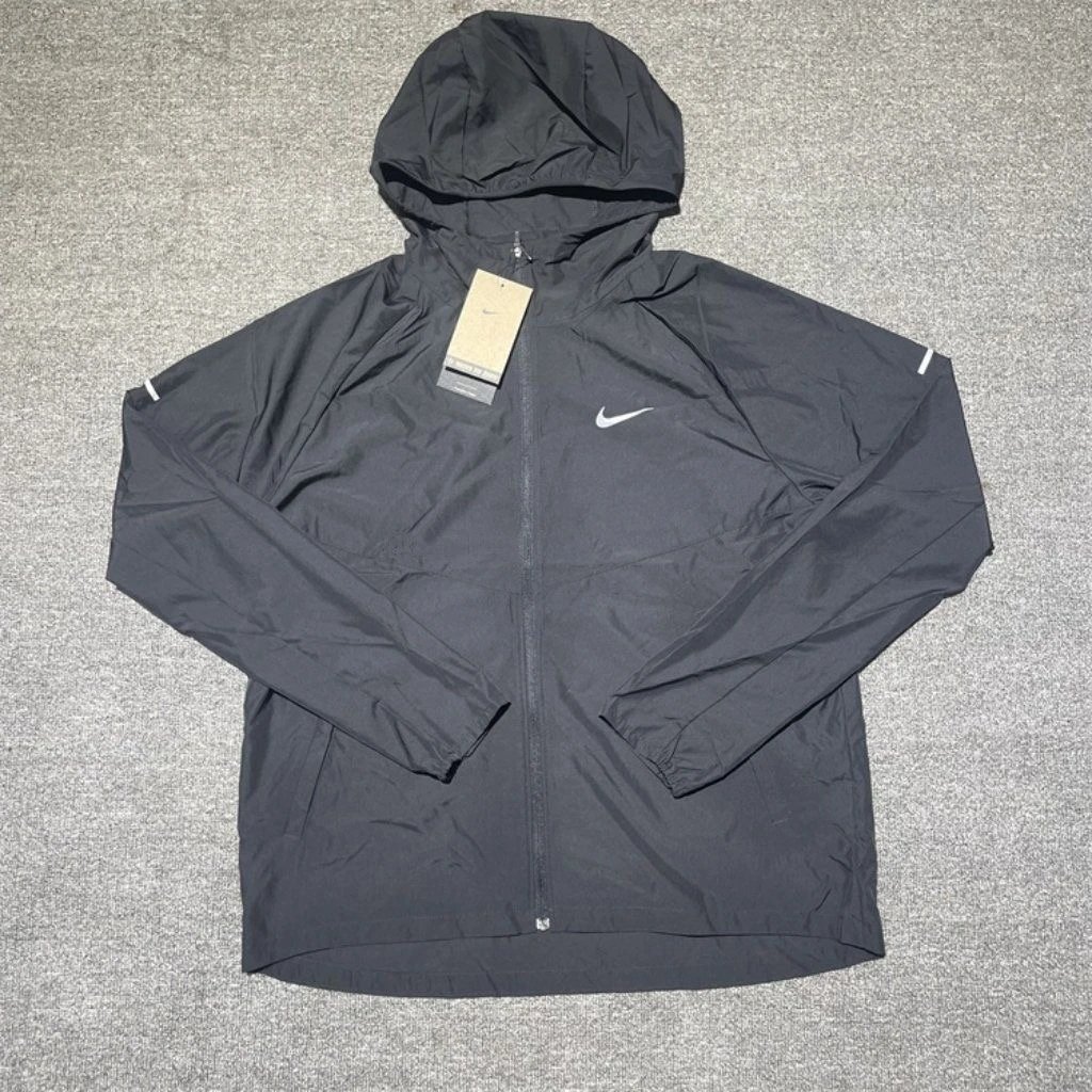 Stylish and functional Nike Windrunner hooded jacket in black with reflective trim for visibility. Perfect for outdoor activities and everyday wear.