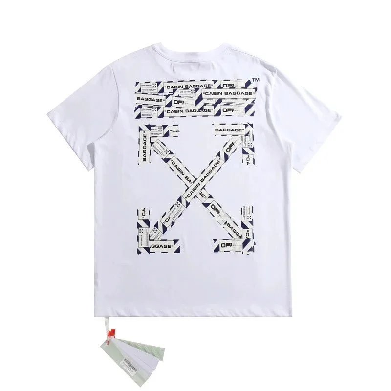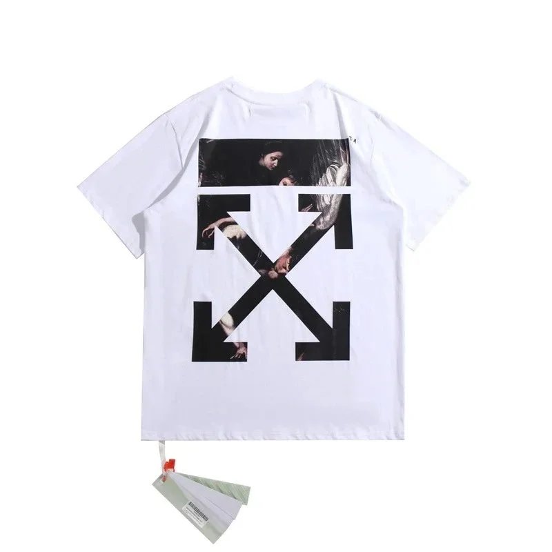 Explore the Off-White collection featuring iconic arrow logo designs on black cotton t-shirts. Each piece showcases unique artistic interpretations with spray paint, tape, and photographic elements for a bold streetwear statement.