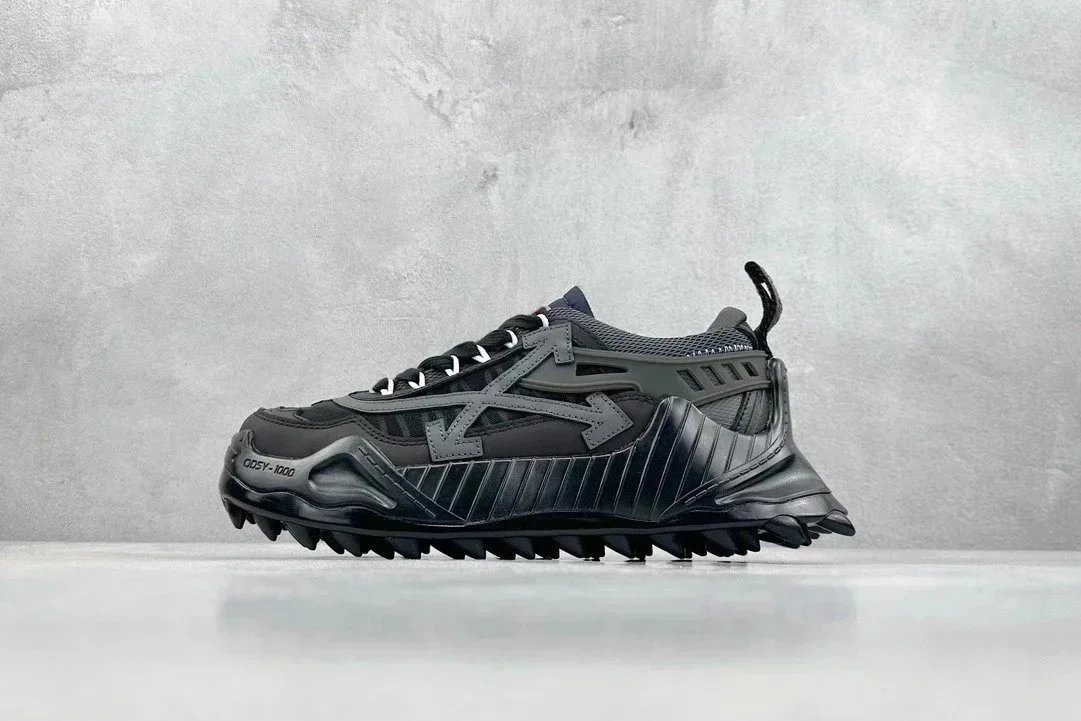 Stylish Off-White Arrow sneakers in white and grey with signature diagonal arrows and spiked sole. Perfect for streetwear enthusiasts.