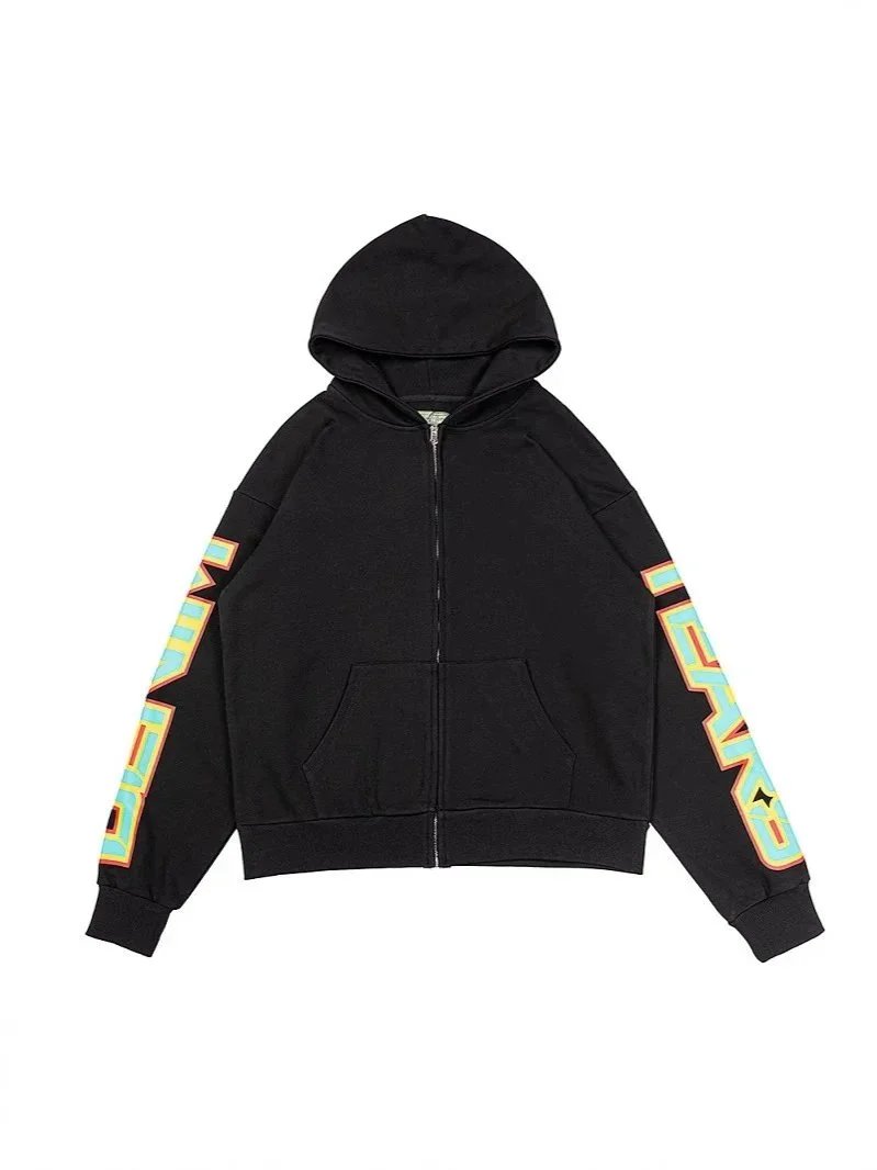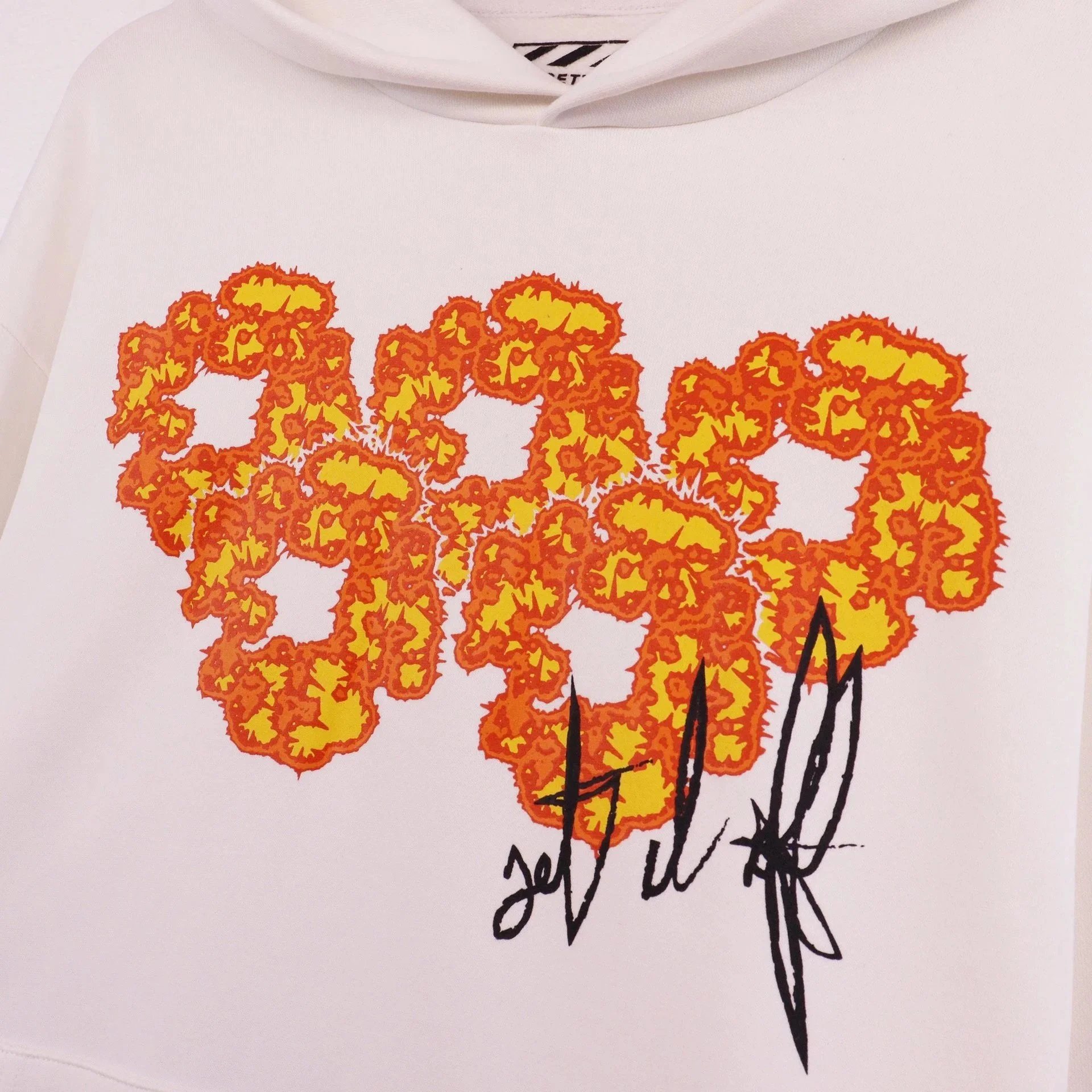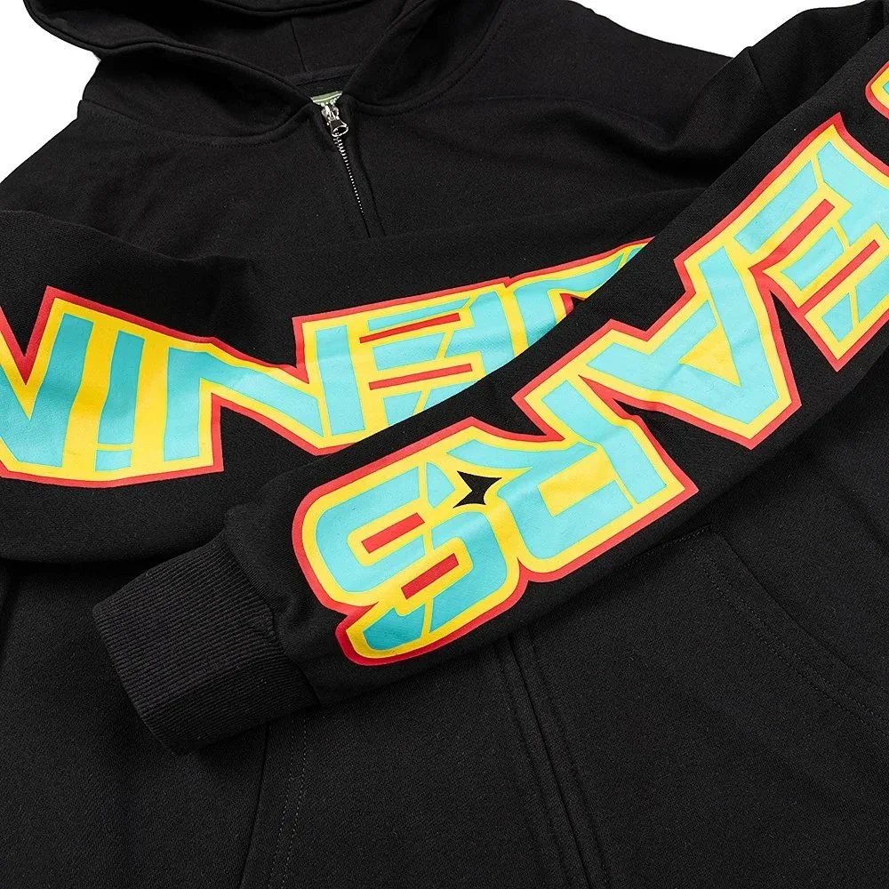 Bold black hoodie featuring a fiery heart graphic on front and graffiti-style back print by OFFSETTEARS. Perfect for streetwear lovers.