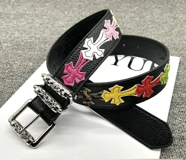 Stylish OUYUE leather belts featuring vibrant cross patterns and intricate metal buckles. Perfect for adding a bold punk or gothic flair to any outfit.