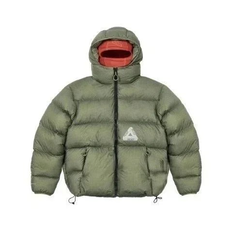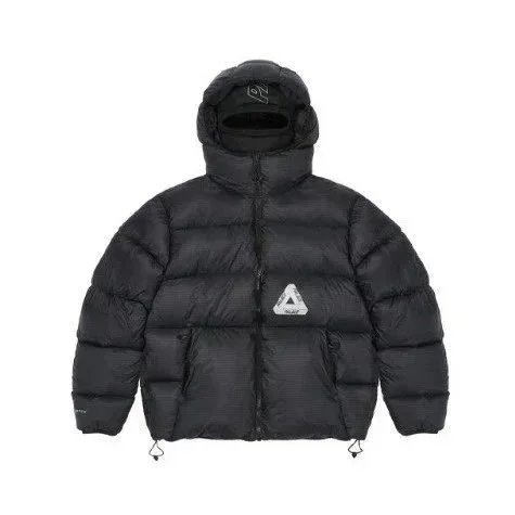 Stylish black Palace puffer jacket featuring a distinctive triangular logo patch. Perfect for cold weather with premium insulation and urban design.