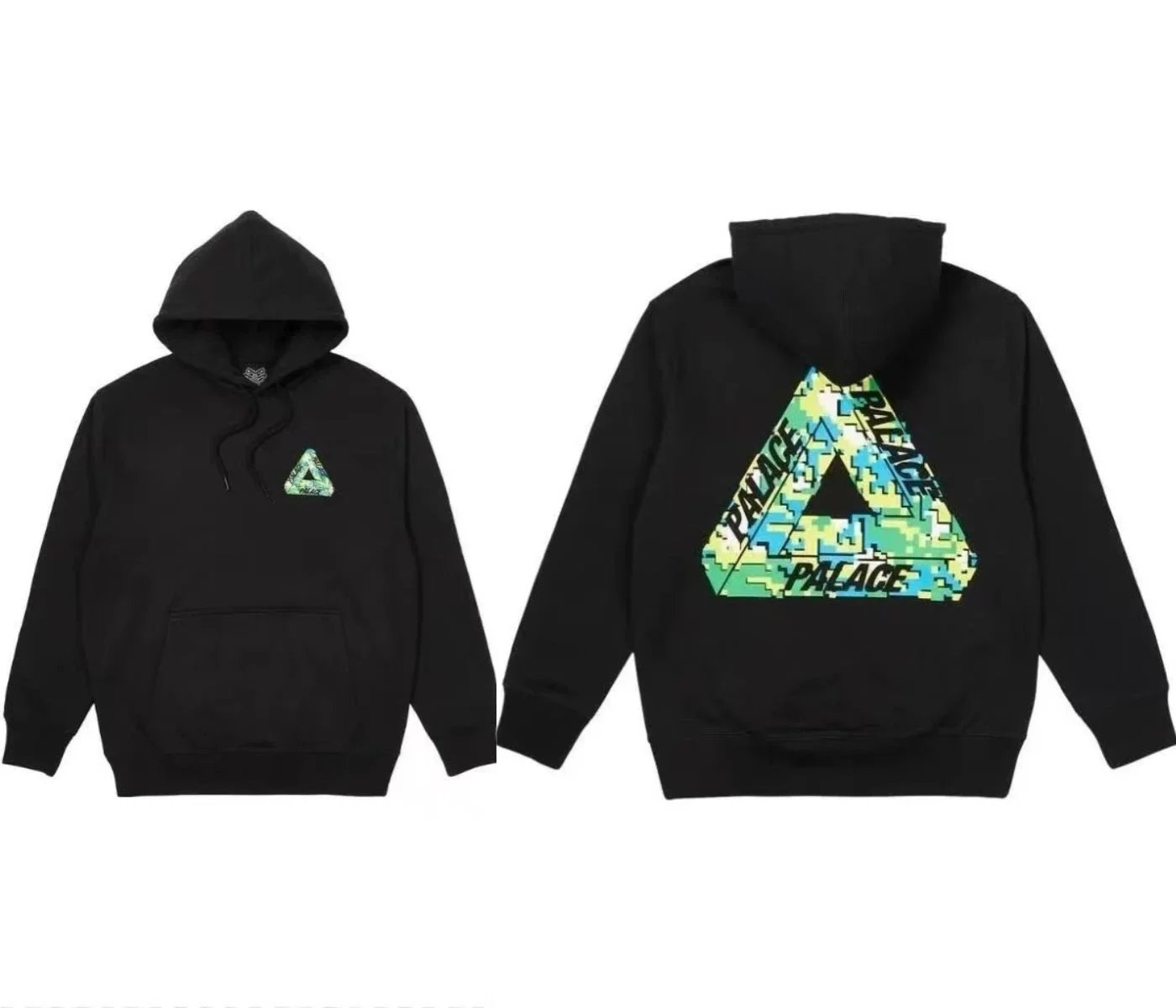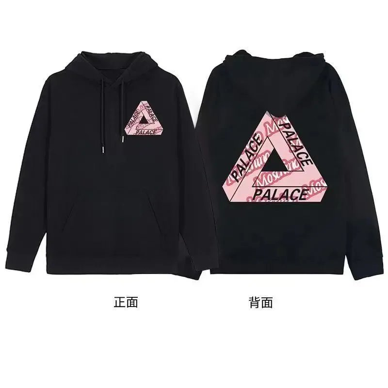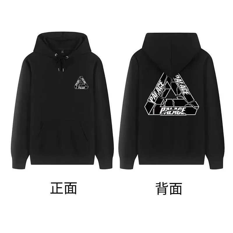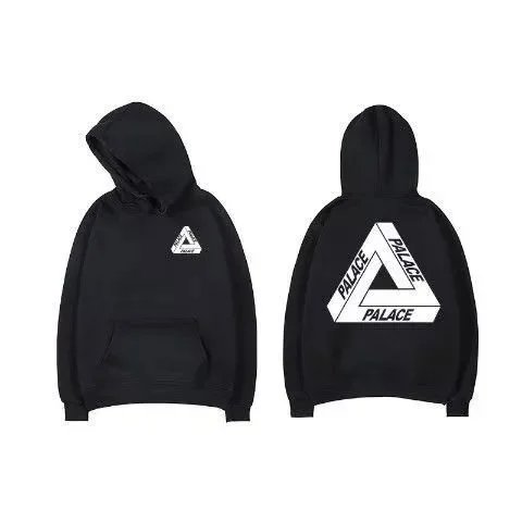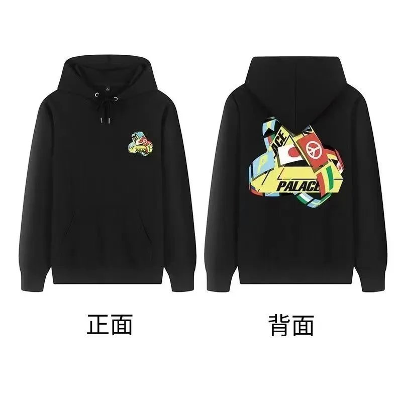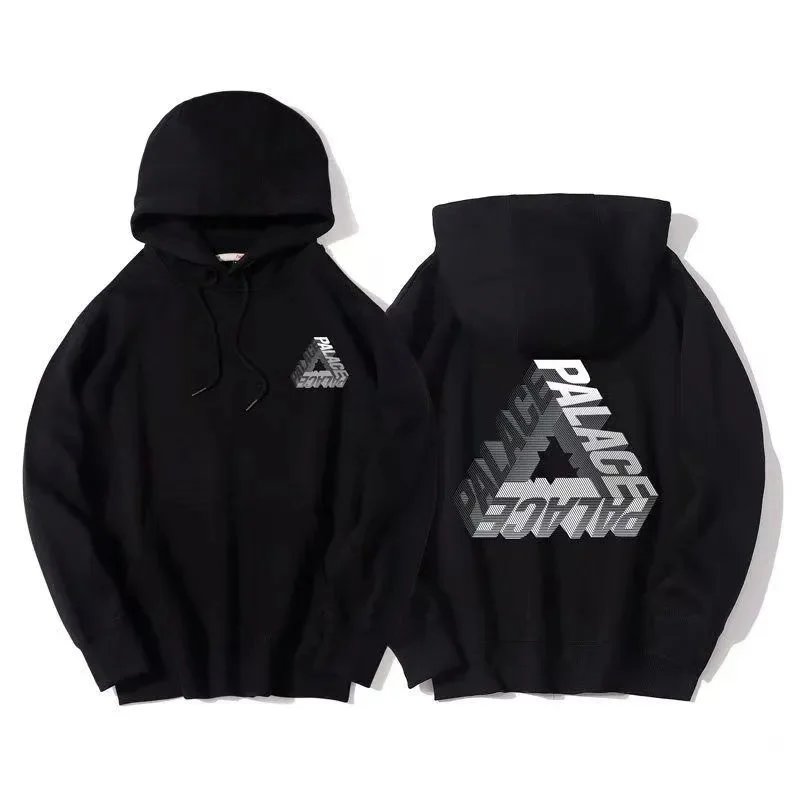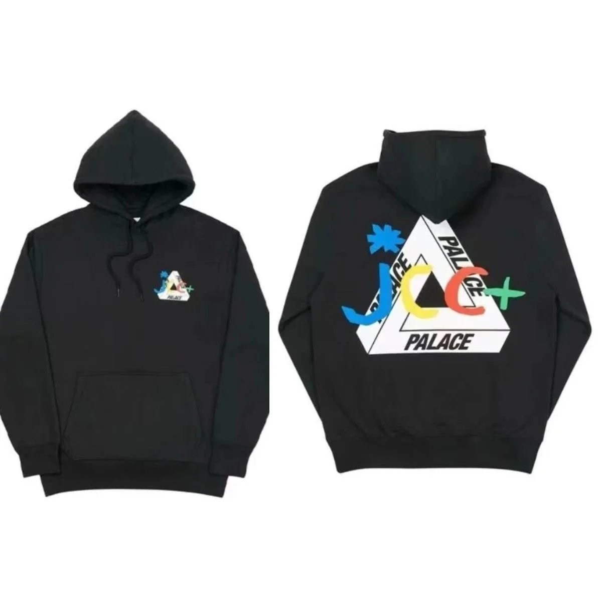 Black Palace Tri-Ferg hoodie featuring the iconic multicolor triangle logo on front and back. Perfect for streetwear and skate culture.