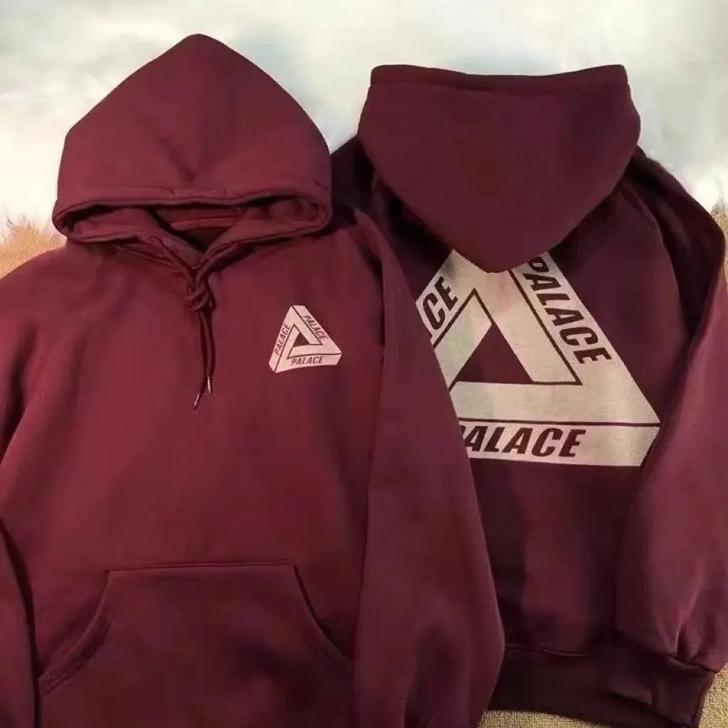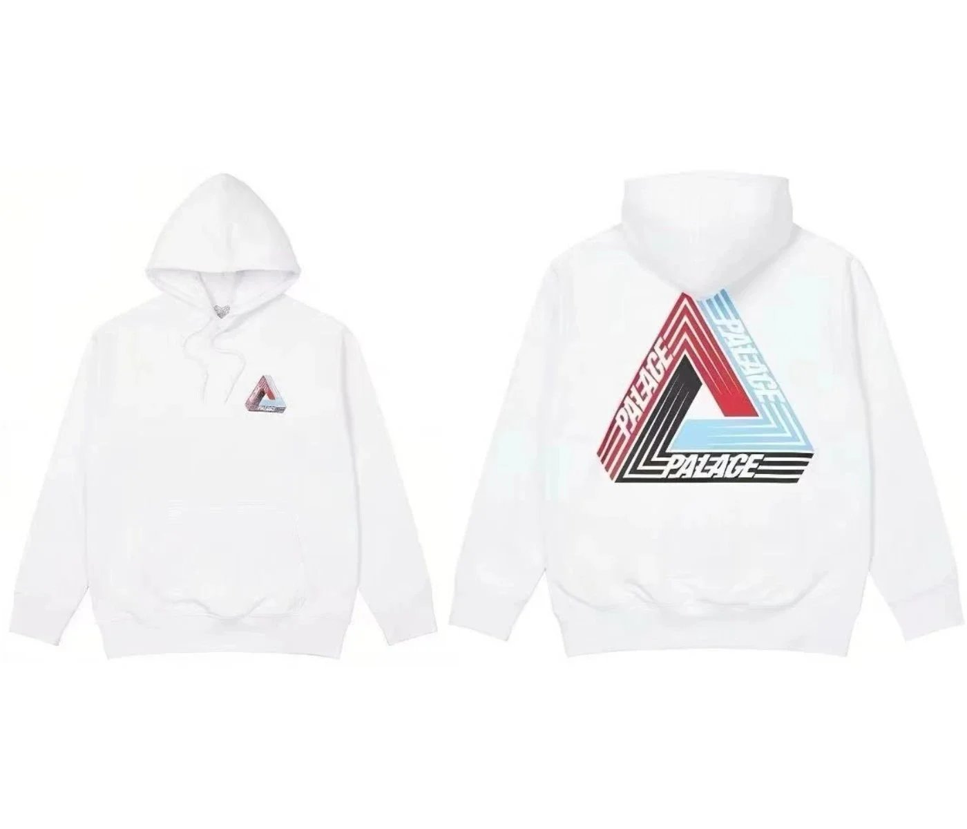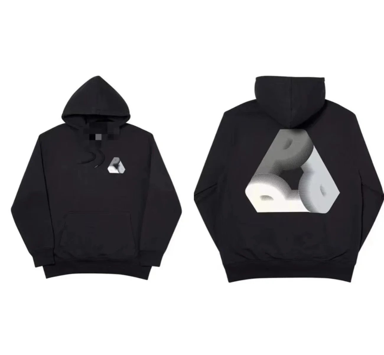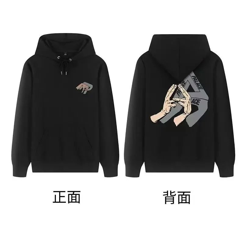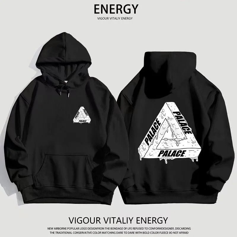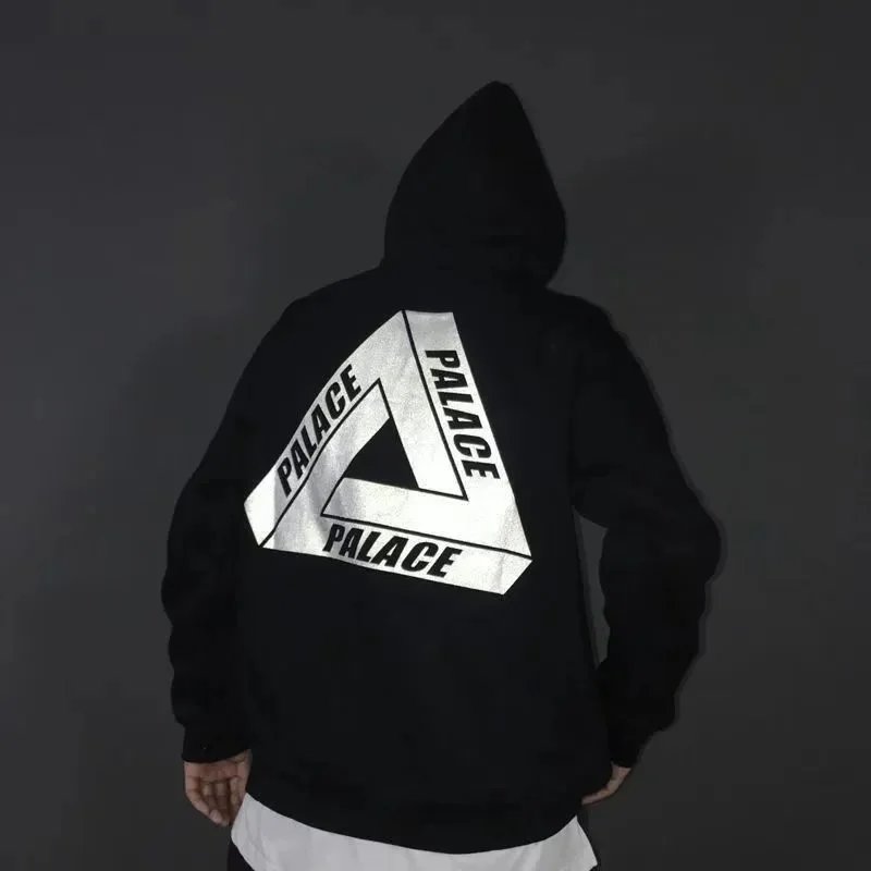 Black Palace Tri-Ferg hoodie featuring the iconic multicolor triangle logo on front and back. Perfect for streetwear and skate culture.