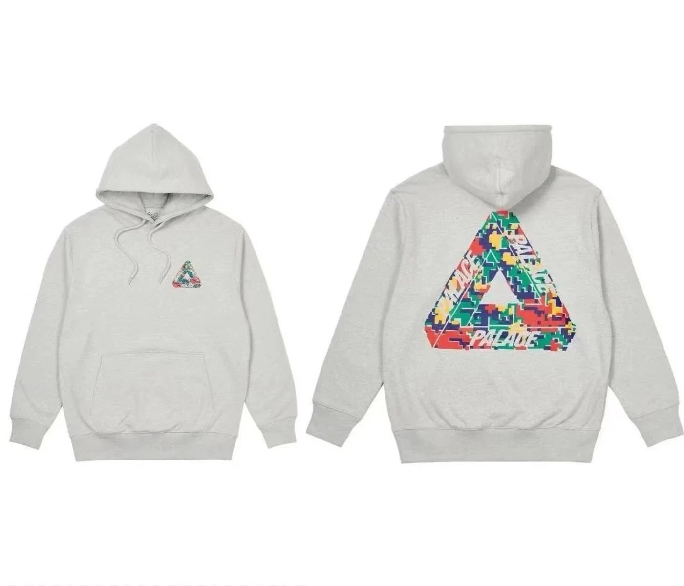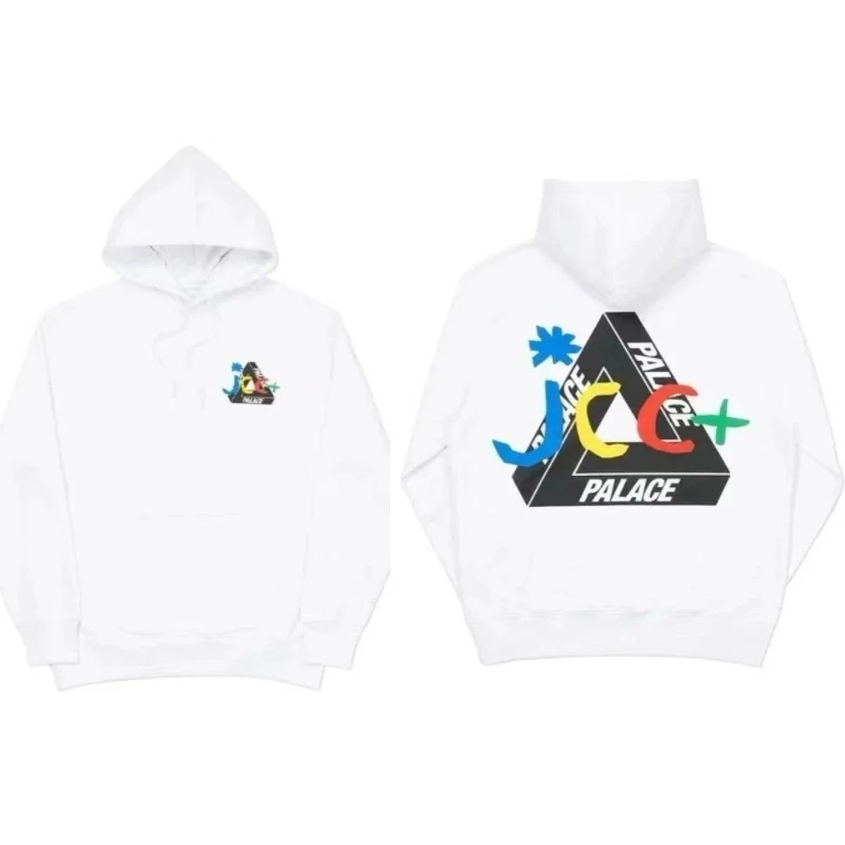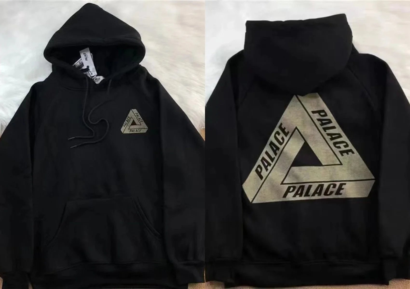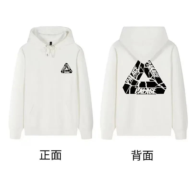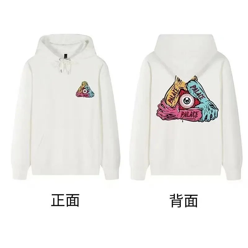 Black Palace Tri-Ferg hoodie featuring the iconic multicolor triangle logo on front and back. Perfect for streetwear and skate culture.