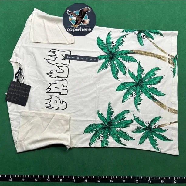 This black Palace t-shirt features a bold white flame-style logo and vibrant green palm trees adorned with skull motifs. Perfect for streetwear enthusiasts seeking a distinctive, edgy look.