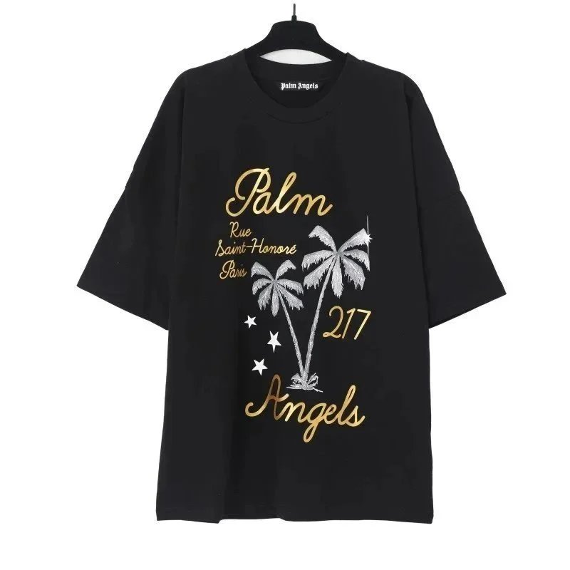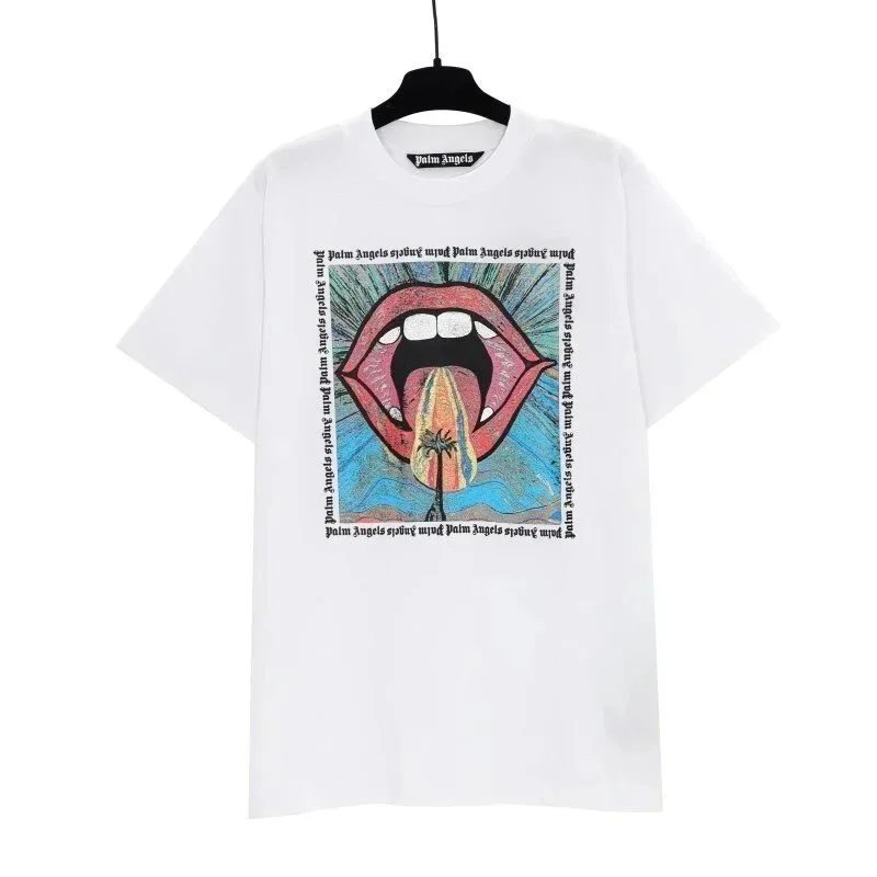 White Palm Angels t-shirt featuring a vibrant rainbow and starburst graphic with bold lettering. Ideal for urban streetwear enthusiasts seeking statement pieces.