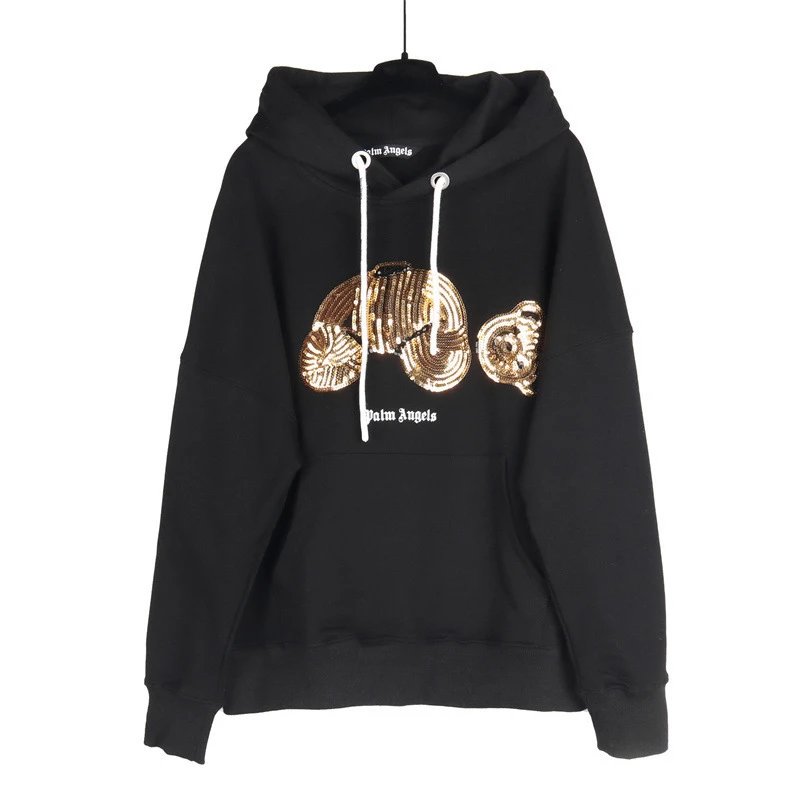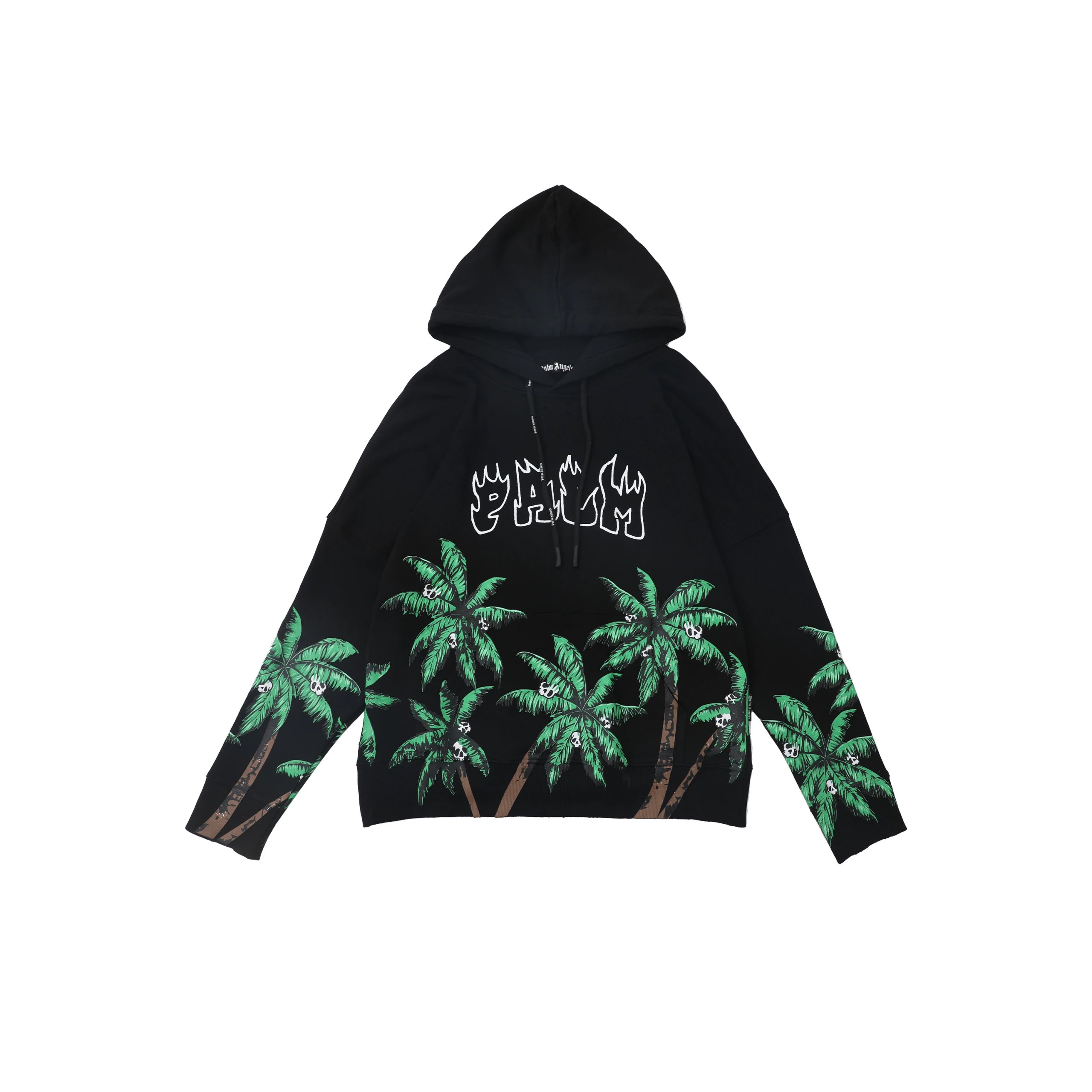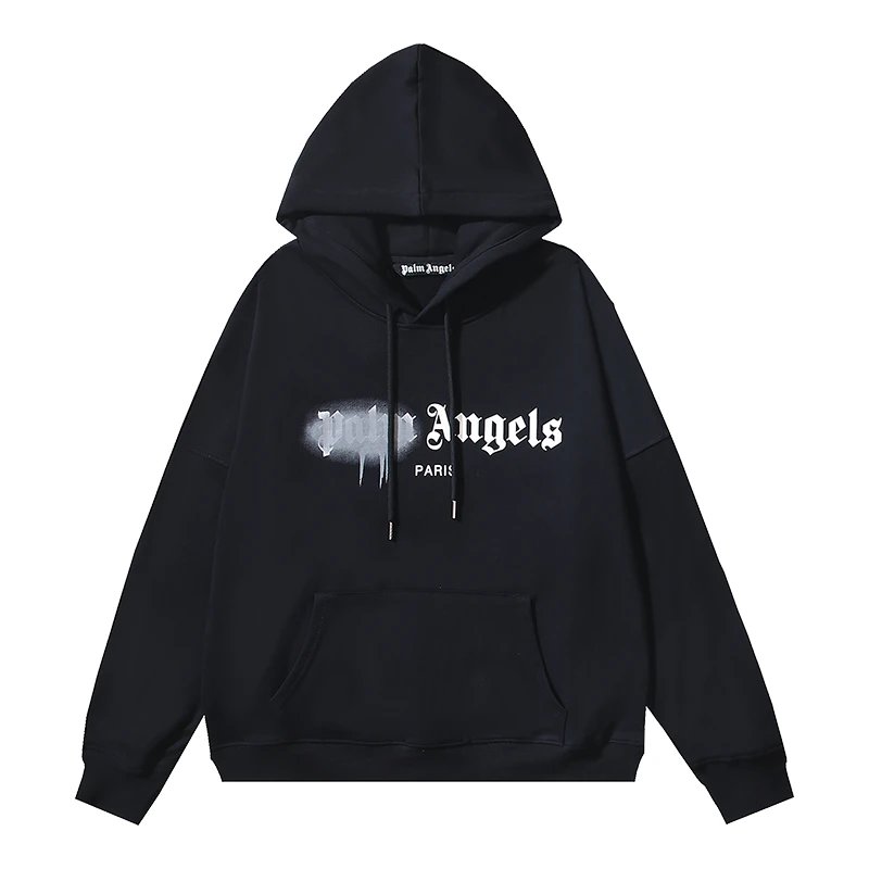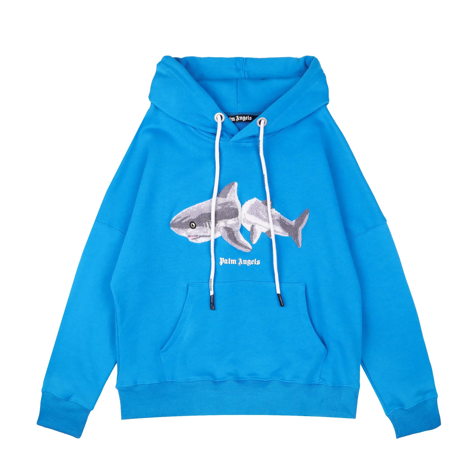 Palm Angels black hoodie featuring a bold shark graphic and brand logo. Perfect for streetwear lovers seeking premium urban style.