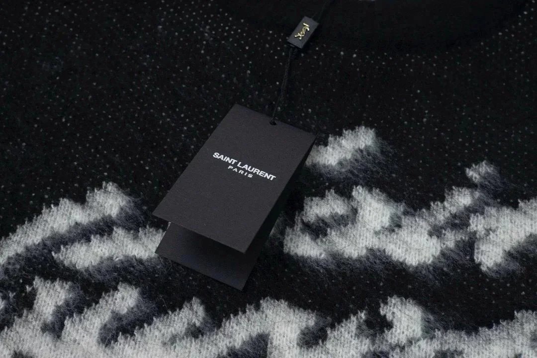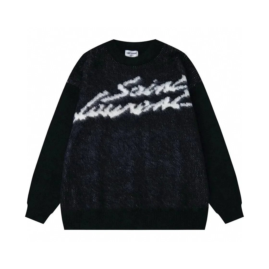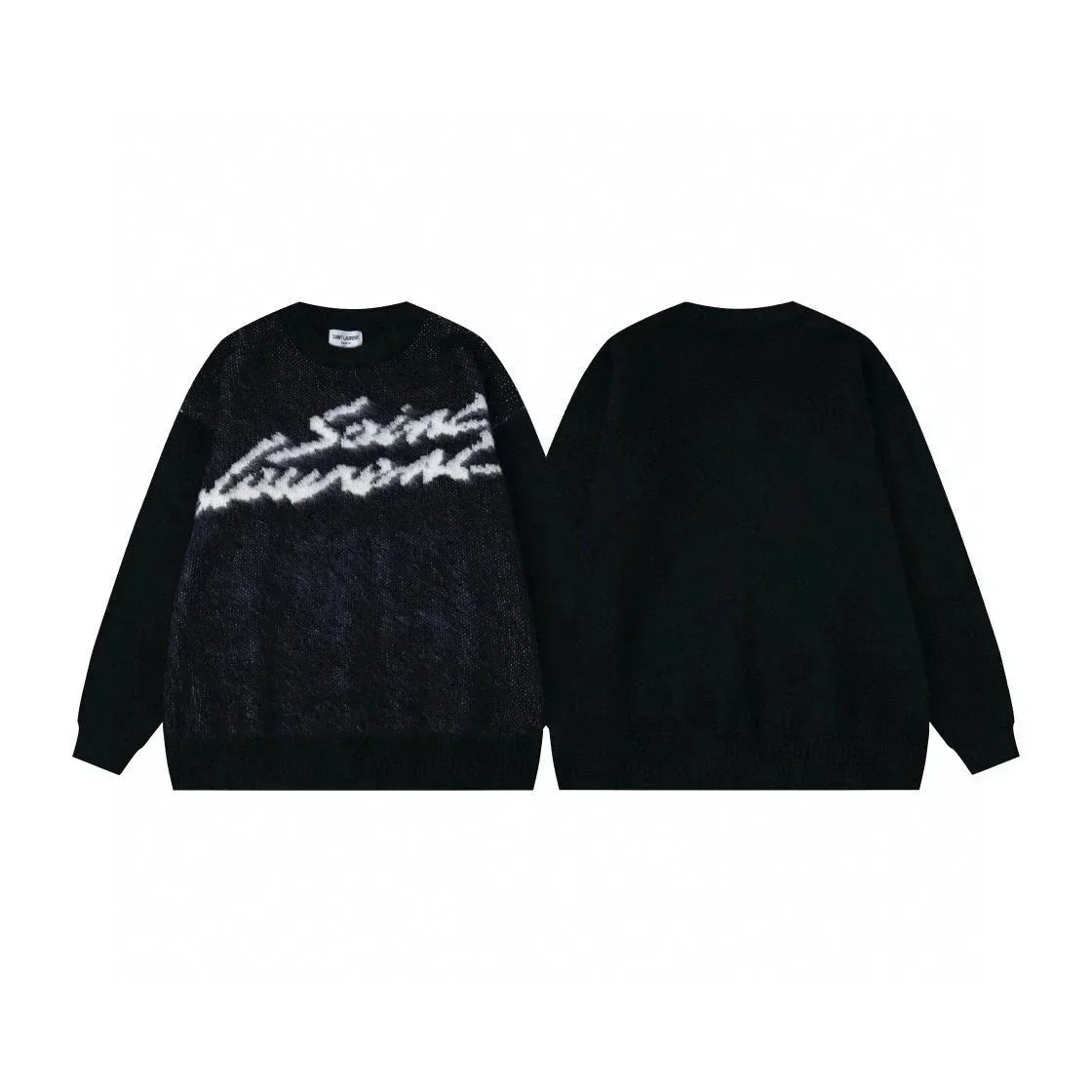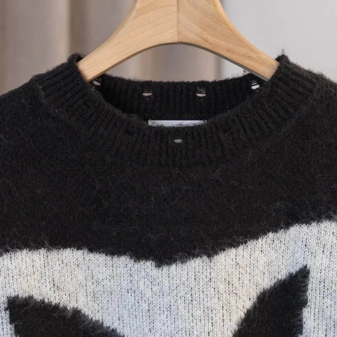 A cozy black fuzzy knit sweater featuring a bold white Playboy bunny logo on the back. Perfect for casual and streetwear looks.
