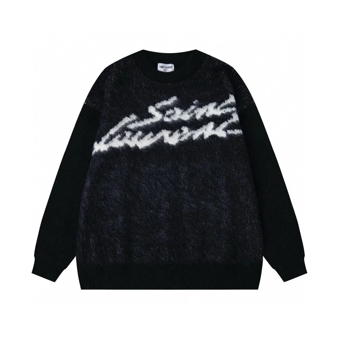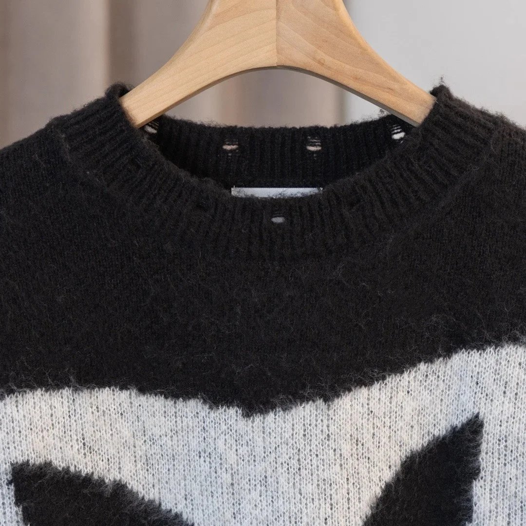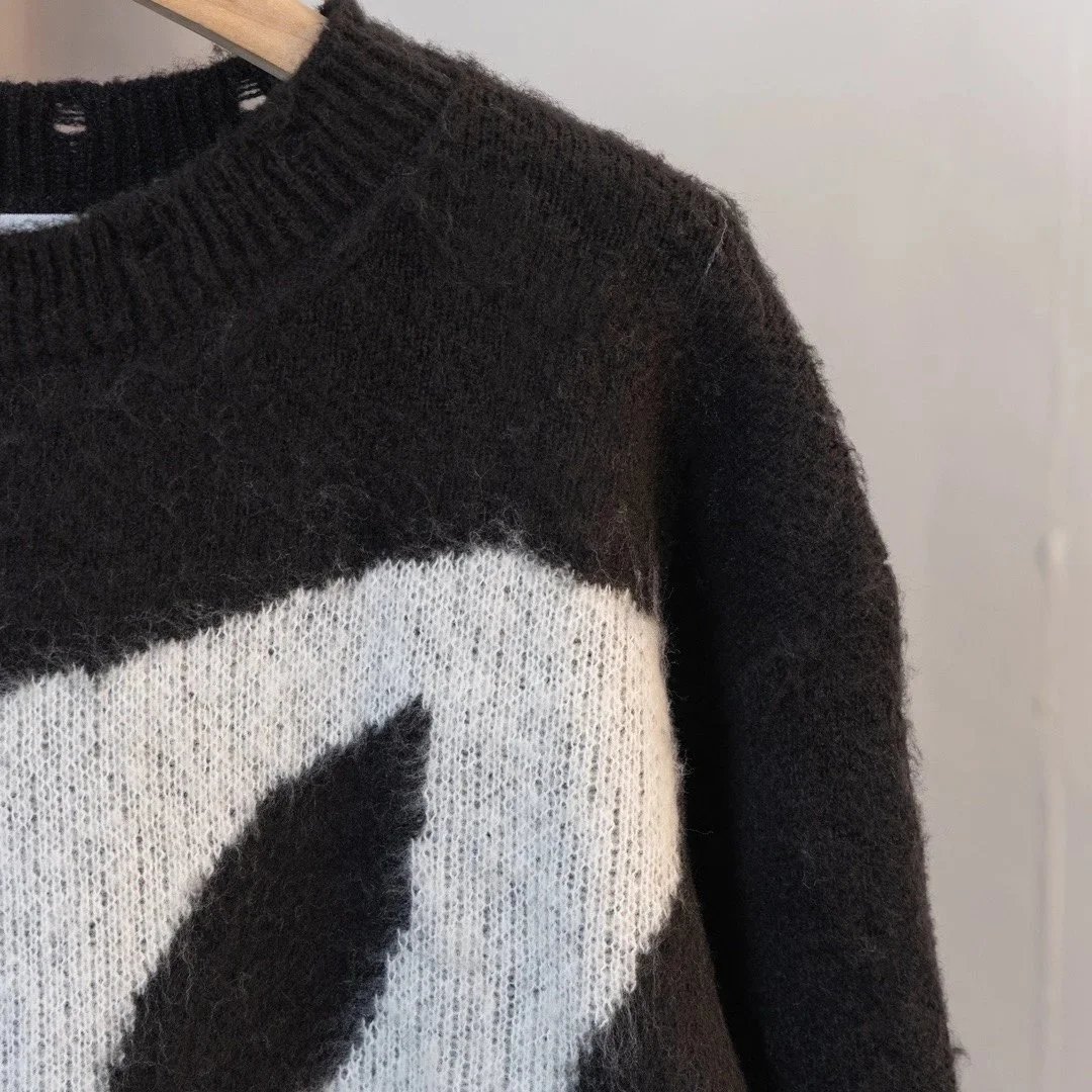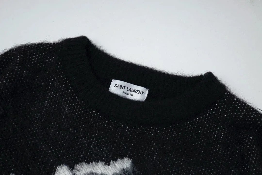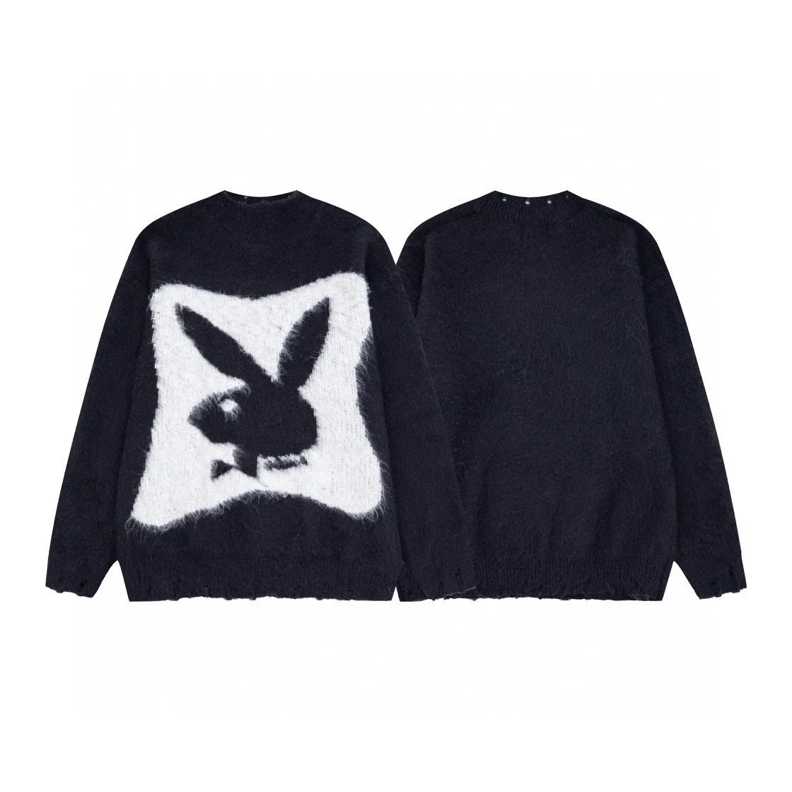 Bold Playboy bunny logo on a fuzzy black knit sweater with white contrast. Perfect for streetwear lovers seeking iconic branding and cozy texture.