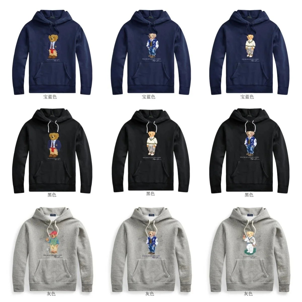 Classic Polo Ralph Lauren bear graphic hoodies in navy, black, and grey. Soft cotton blend with front pouch pocket and drawstring hood.