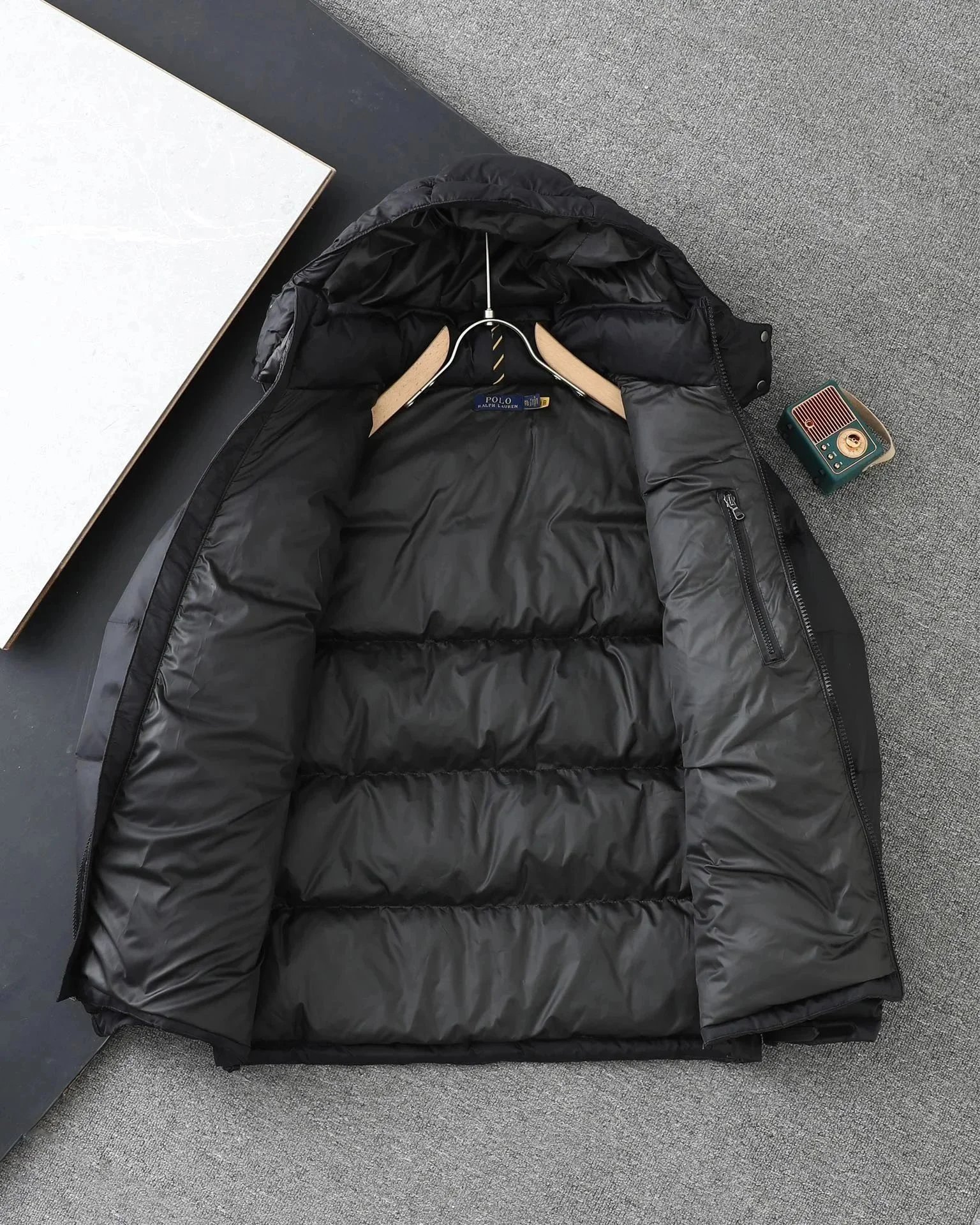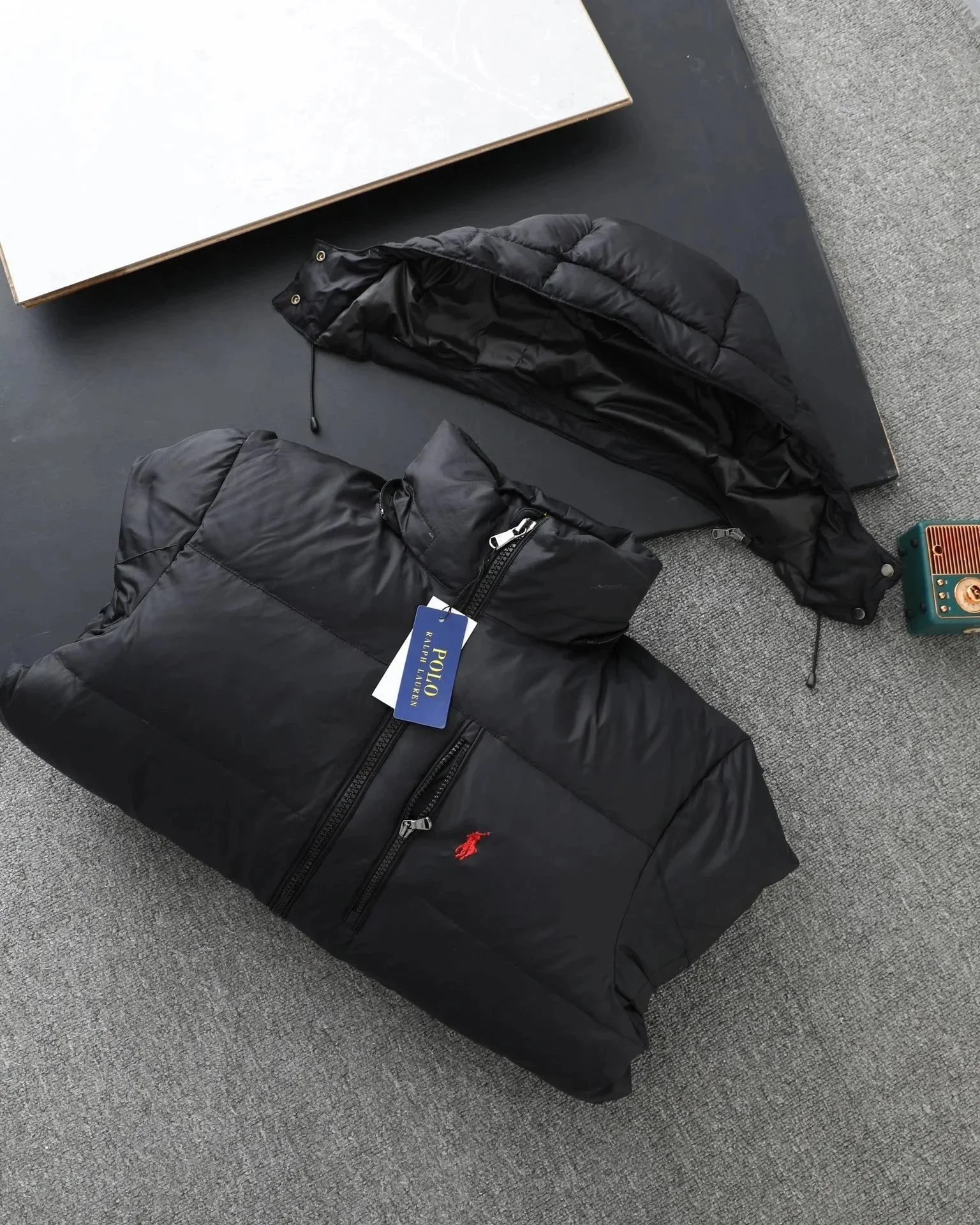 Stylish black hooded puffer jacket from Polo Ralph Lauren featuring a bold red logo and full-zip front. Perfect for cold weather with superior insulation and modern design.