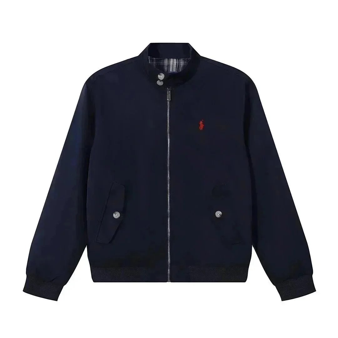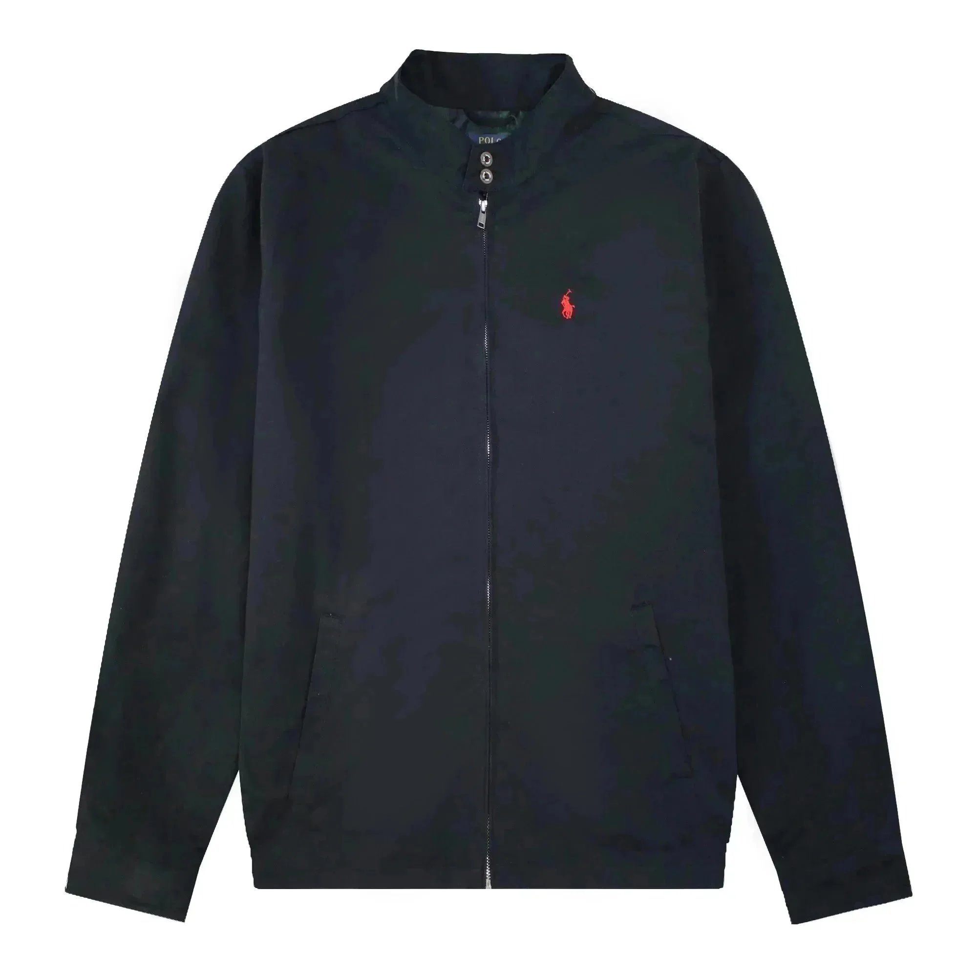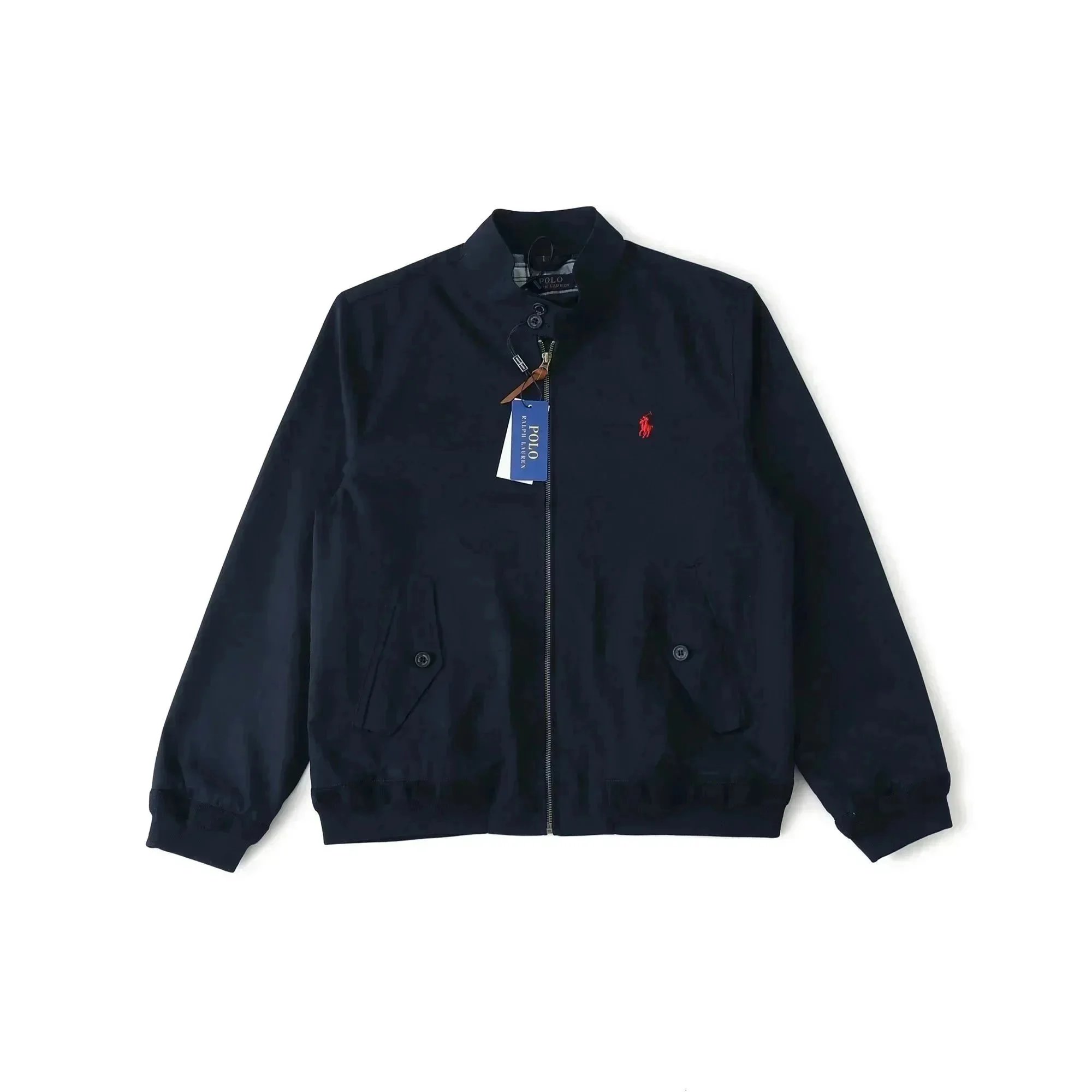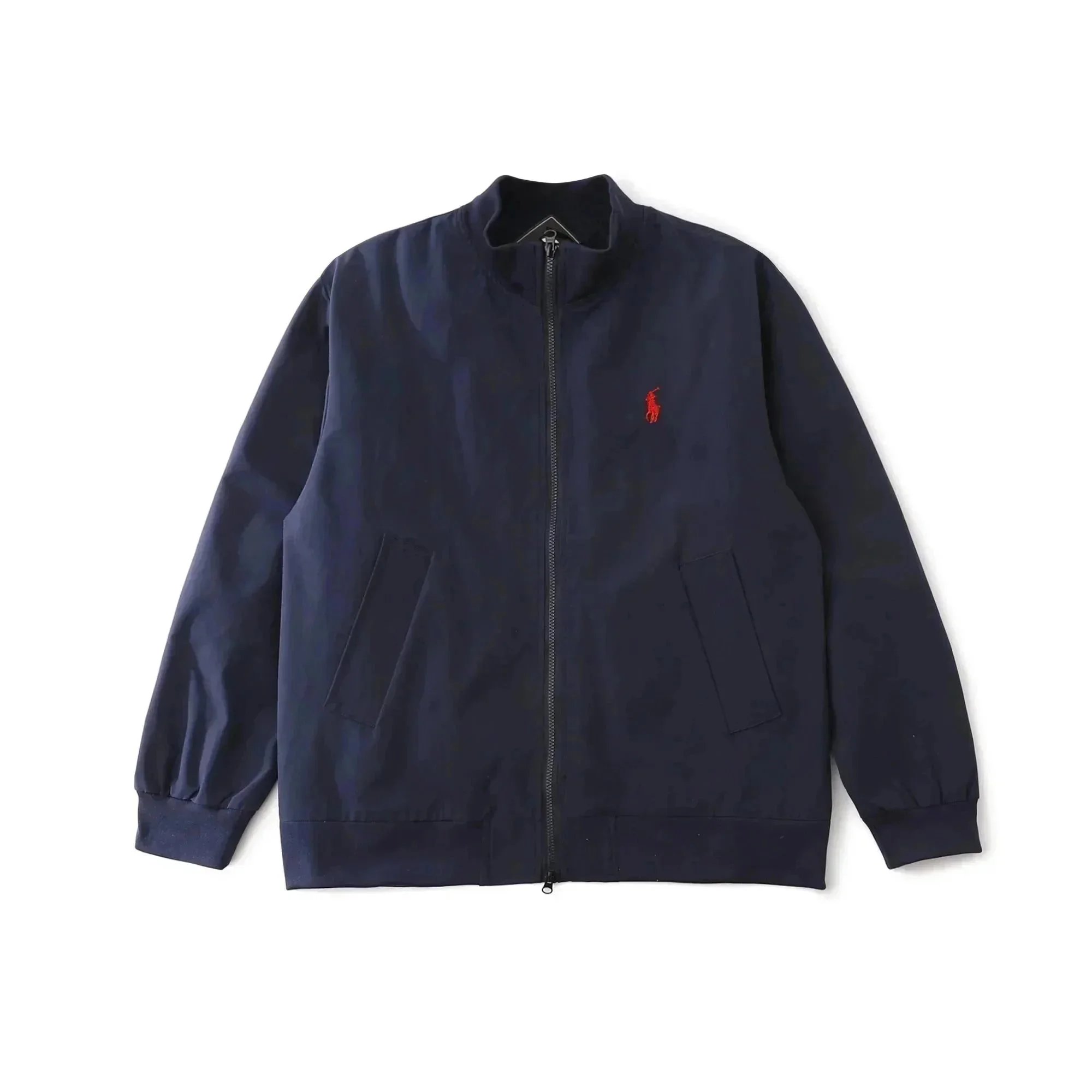Classic Polo Ralph Lauren bomber jacket in navy blue with iconic red pony logo. Features a zip-up front, ribbed cuffs, and a timeless design perfect for casual wear.