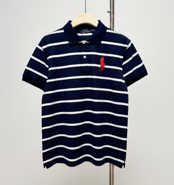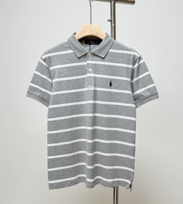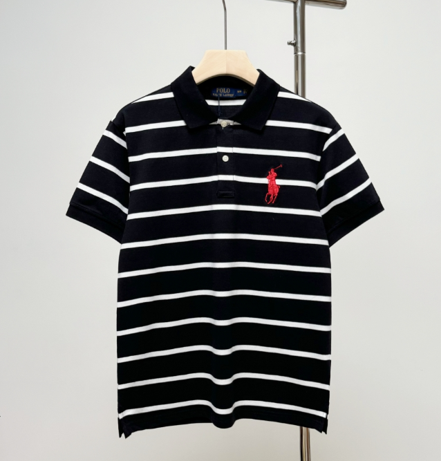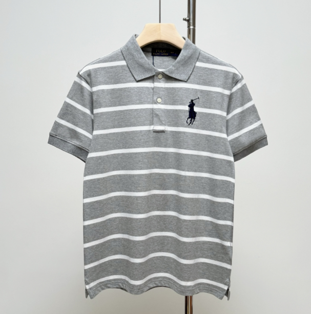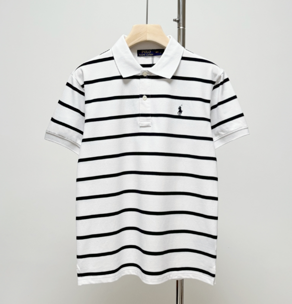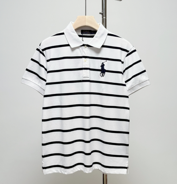Classic green and white striped Polo Ralph Lauren polo shirt featuring the iconic embroidered pony logo on the chest. Perfect for casual or smart-casual occasions.