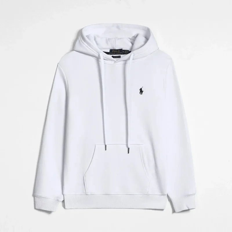 Classic white Polo Ralph Lauren hoodie featuring the iconic black pony logo on the chest. Soft cotton blend with front pouch pocket and adjustable drawstring hood.