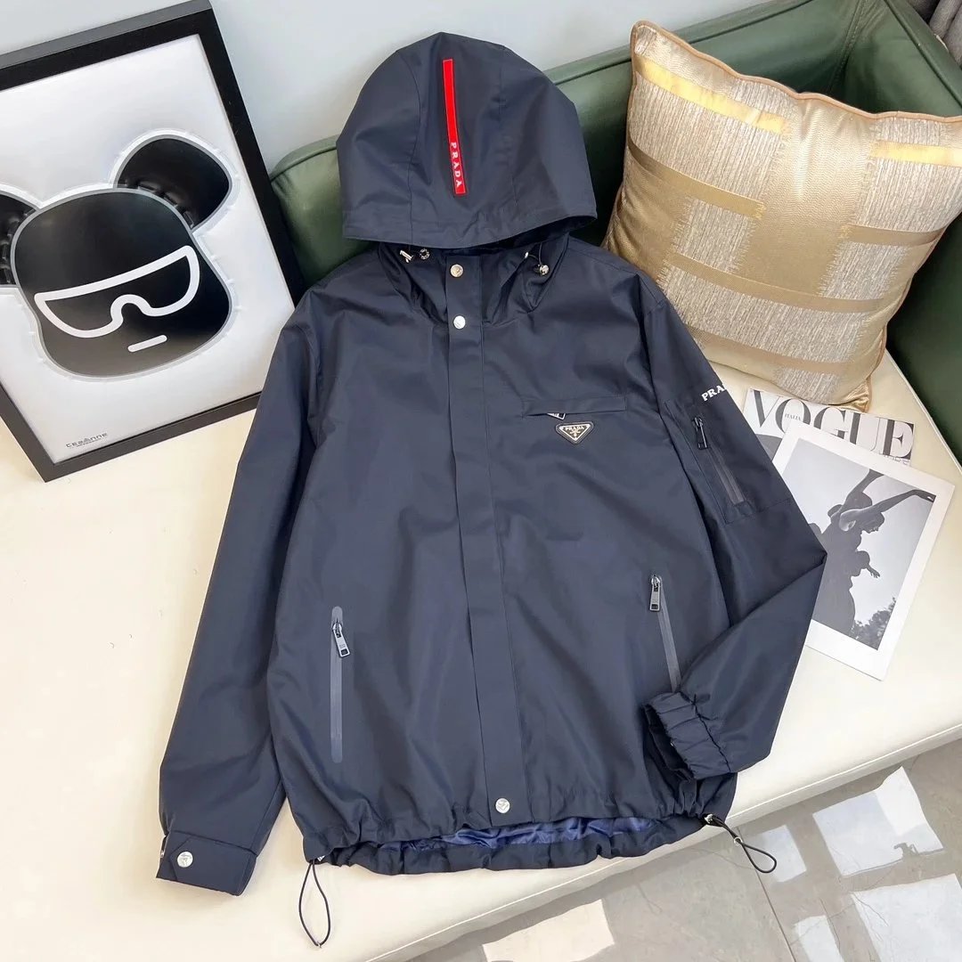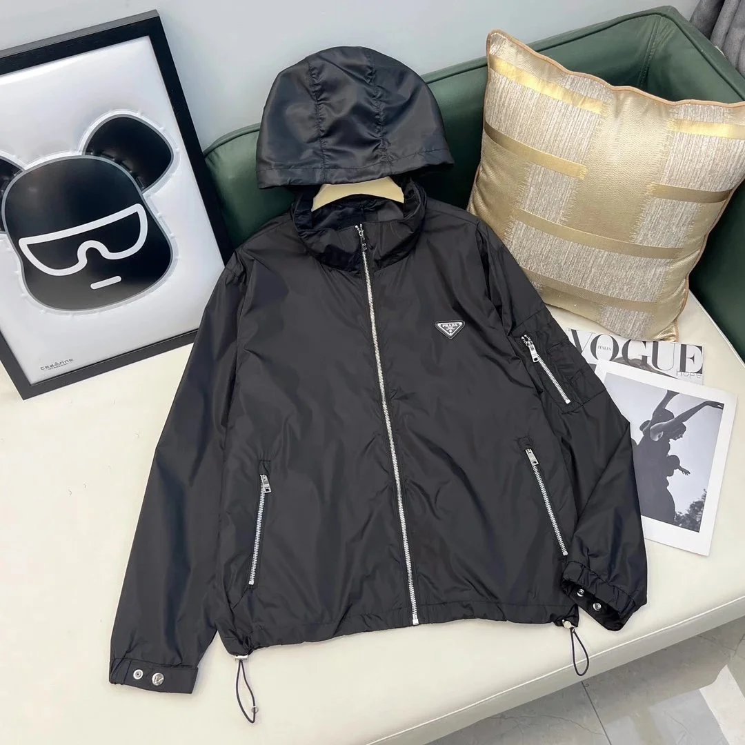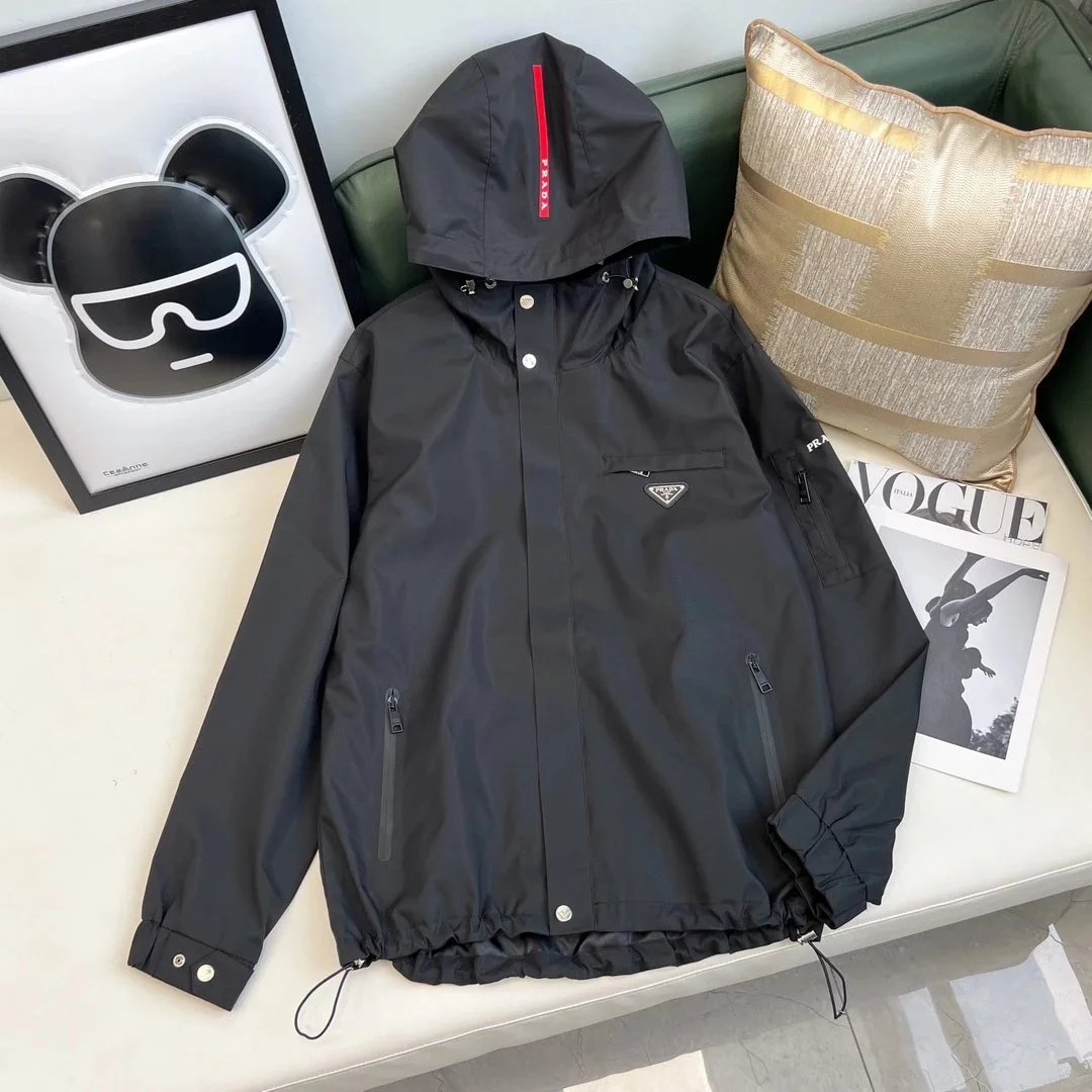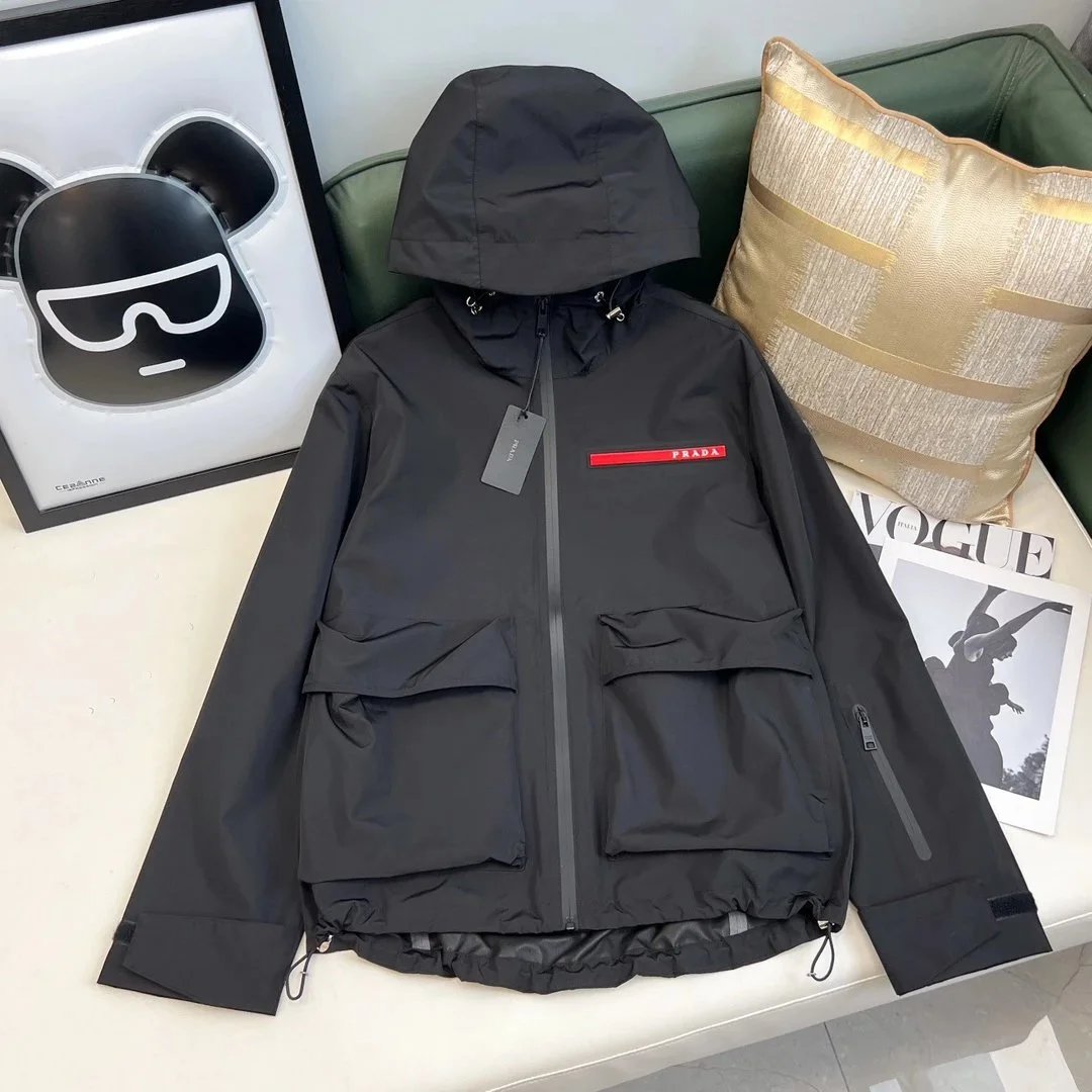 Stylish black Prada hooded jacket featuring a bold red logo stripe and functional pockets. Perfect for modern urban wear with premium design and comfort.