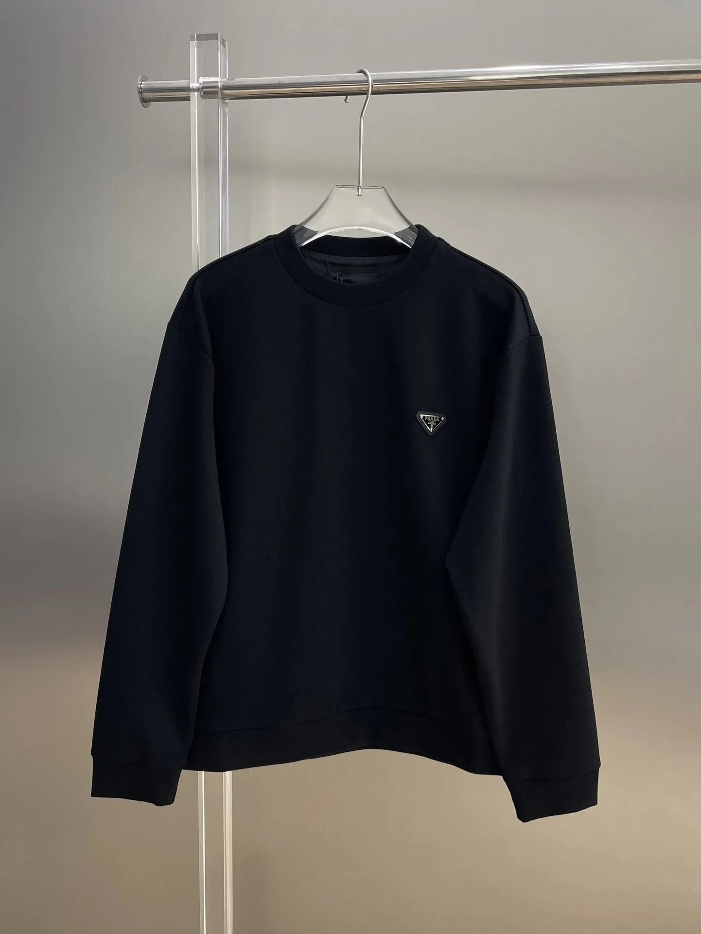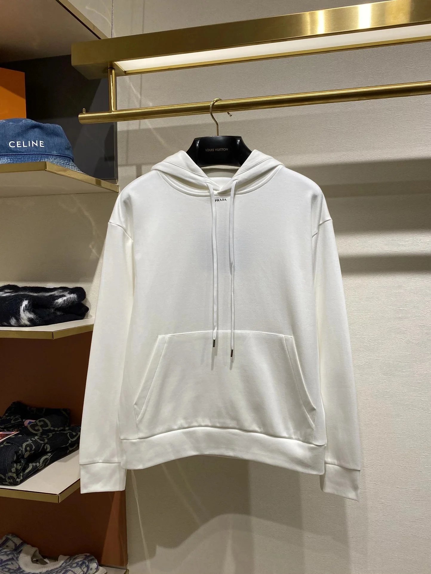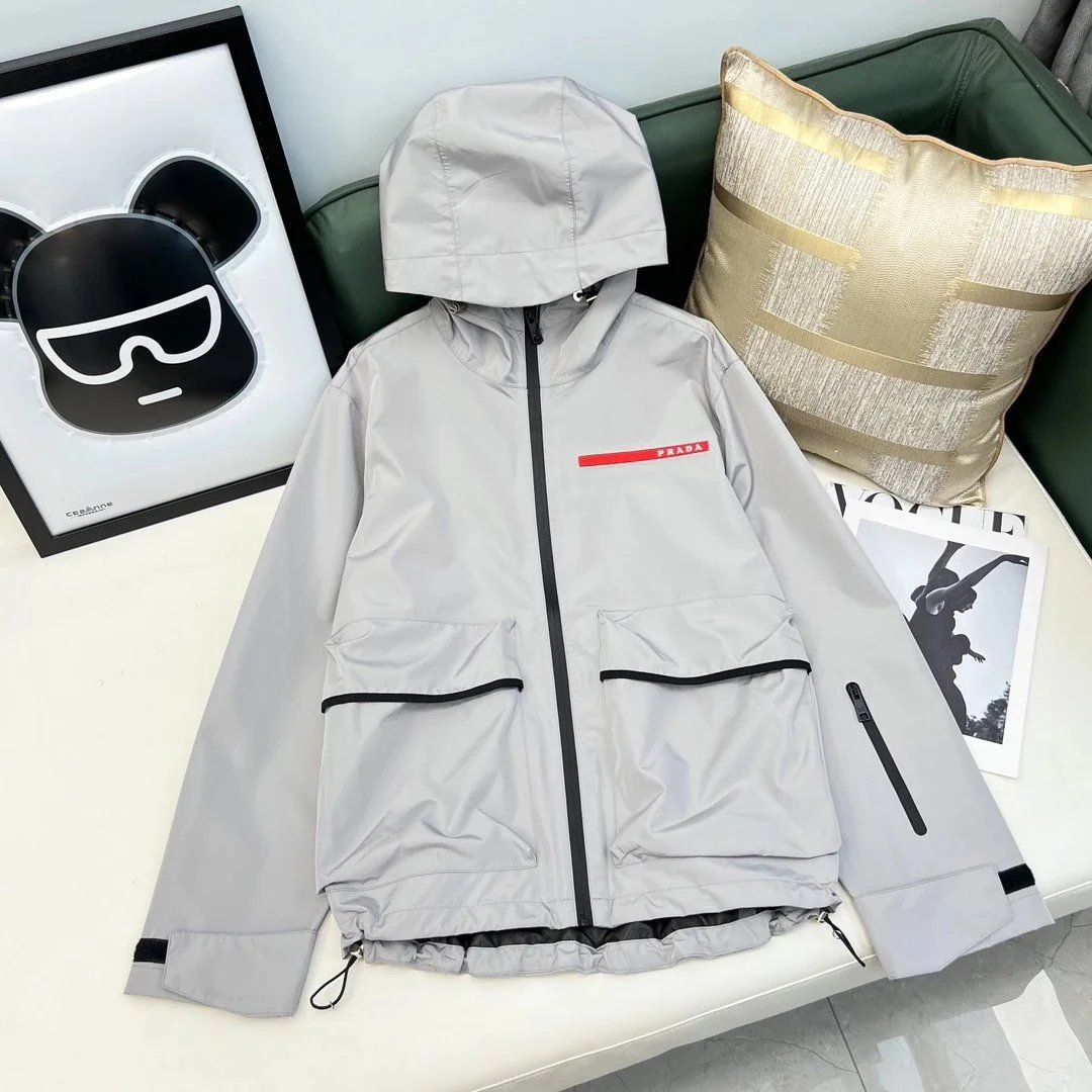 Stylish black Prada hooded jacket featuring a bold red logo stripe and functional pockets. Perfect for modern urban wear with premium design and comfort.