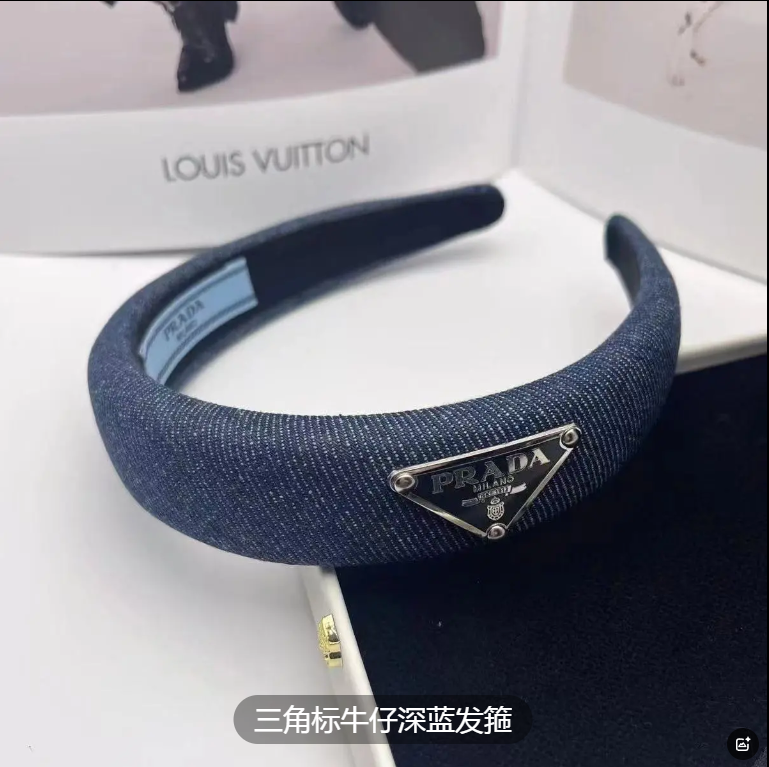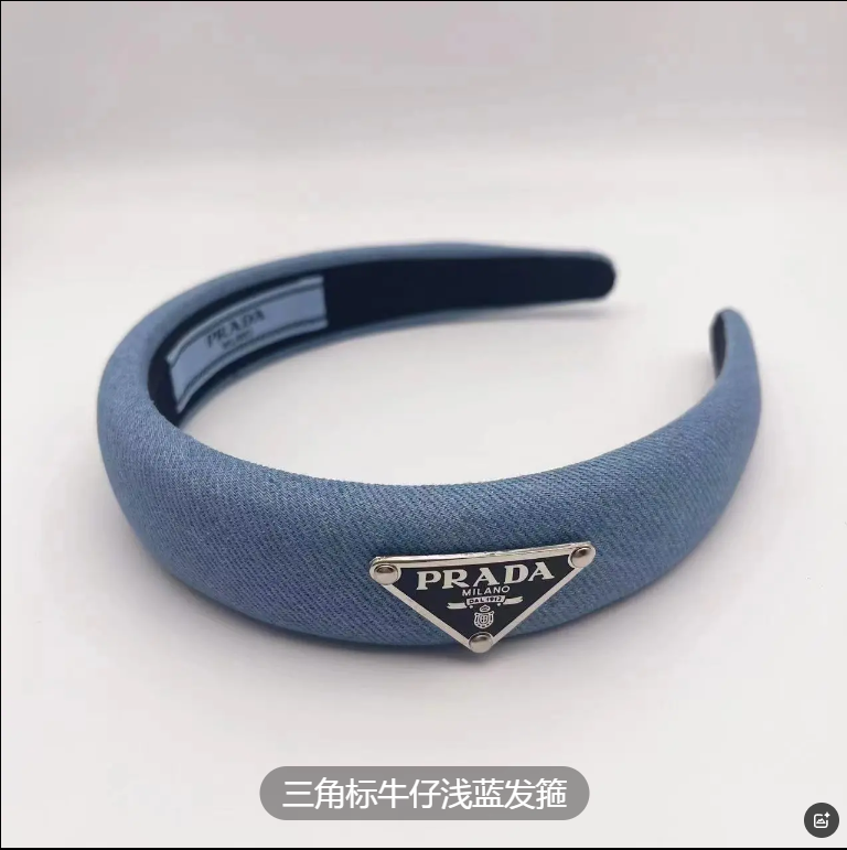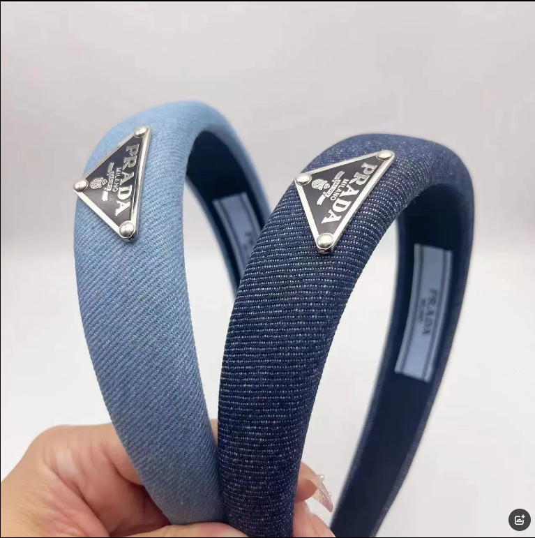 Elegant denim headbands featuring the iconic Prada triangular metal logo. Available in light and dark blue denim for a chic, luxurious look.