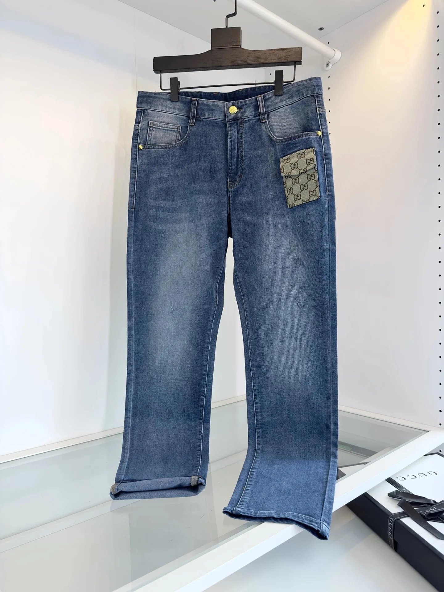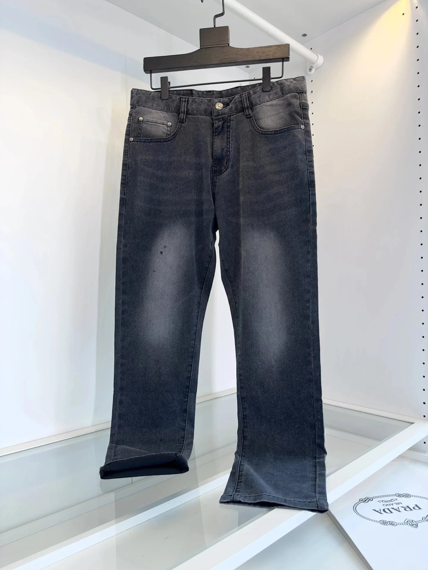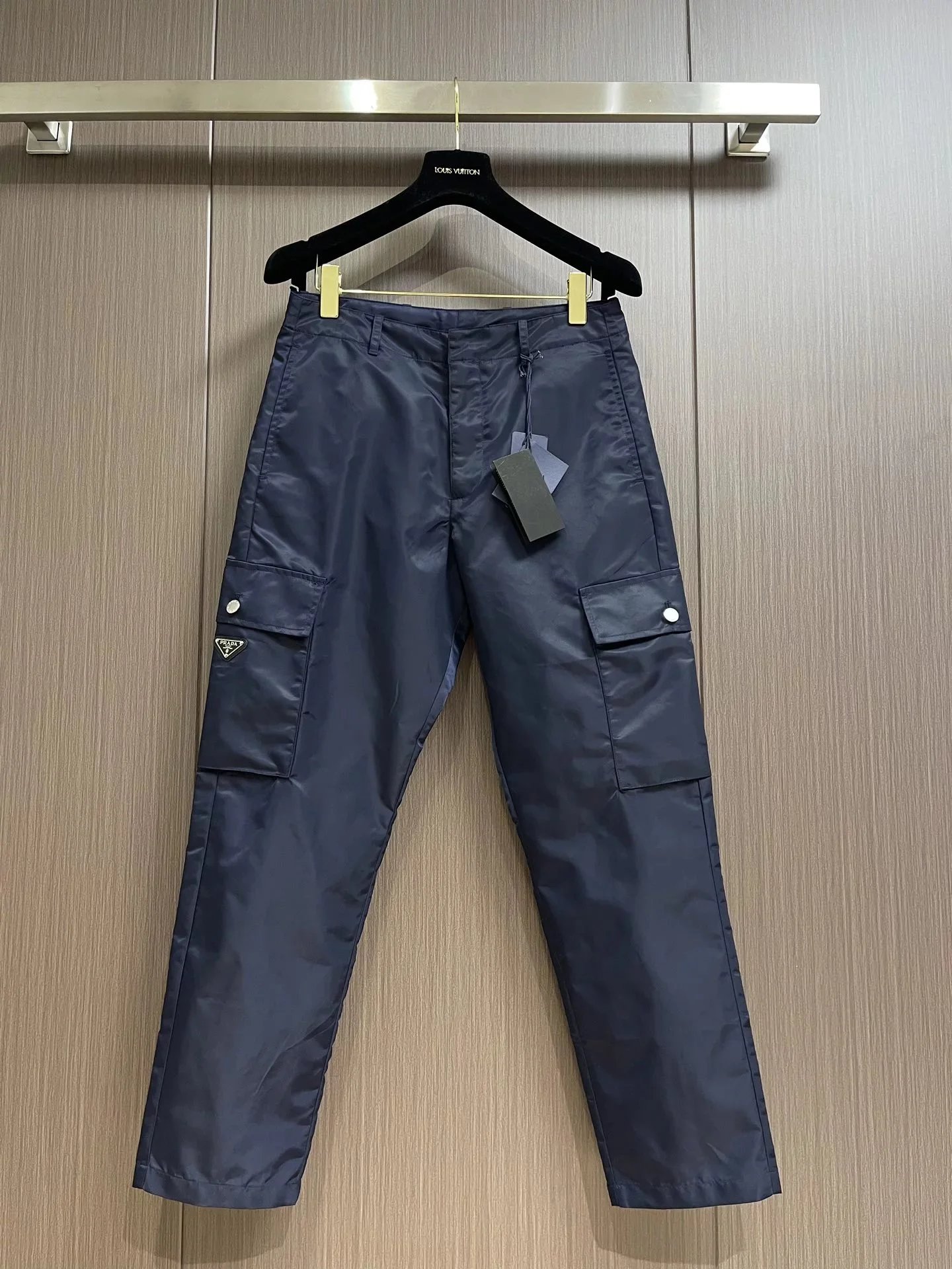 Stylish gray Prada cargo pants featuring a distinctive triangular logo patch on the side pocket. Crafted for modern elegance and comfort.