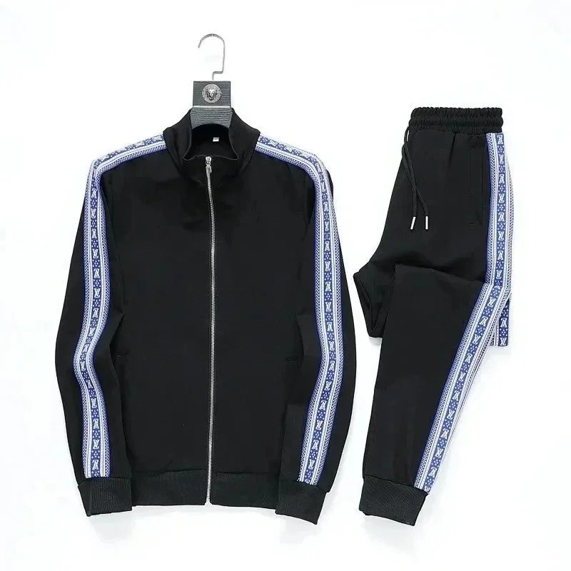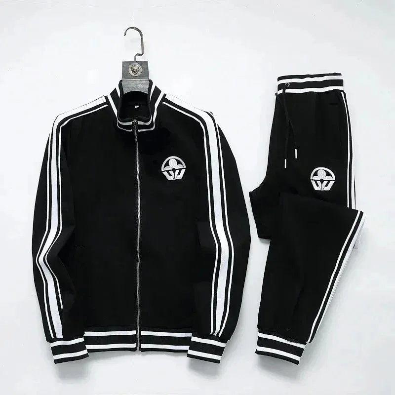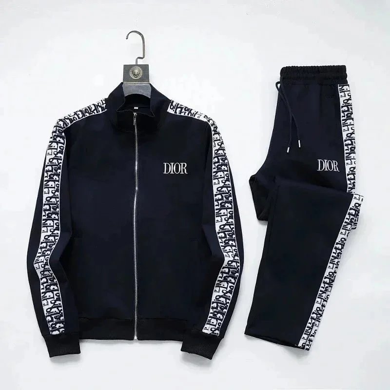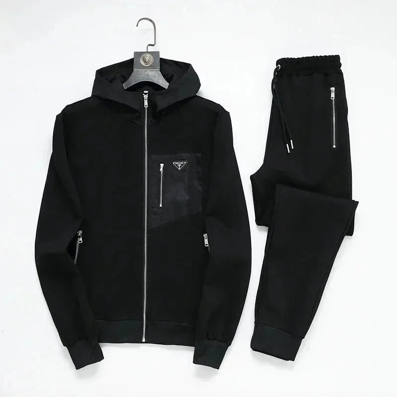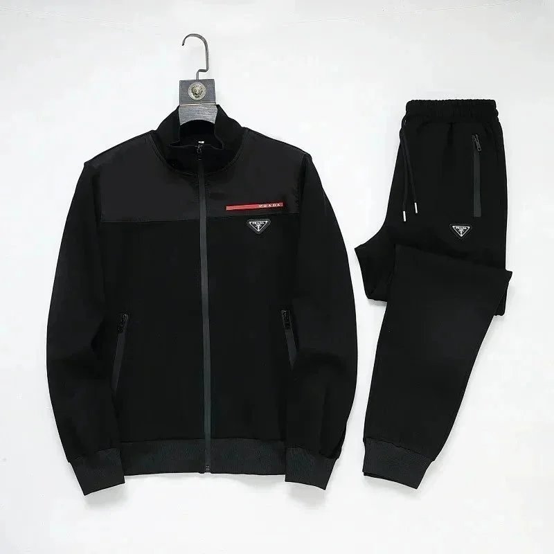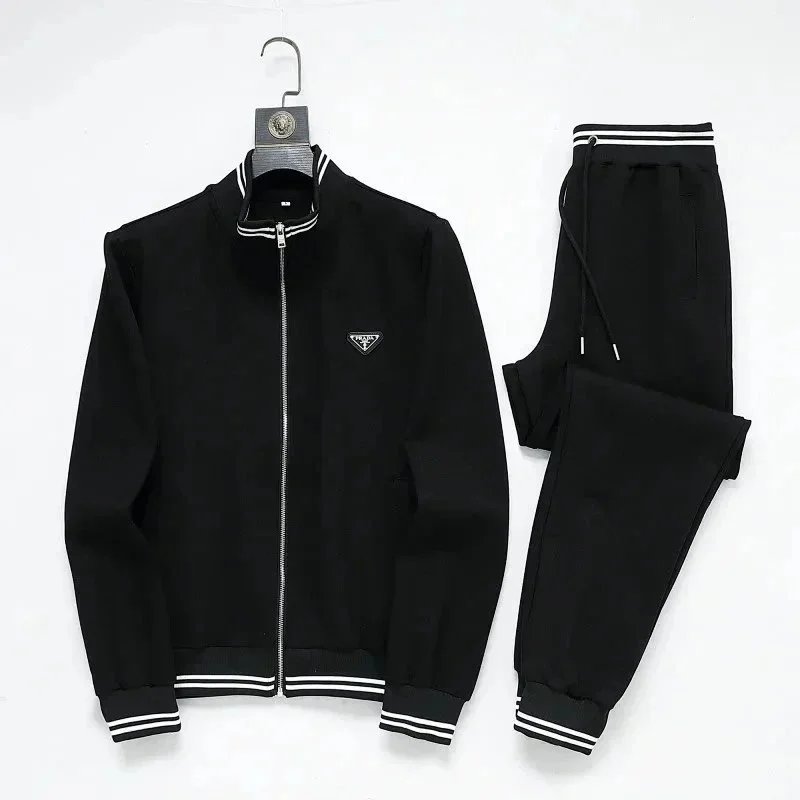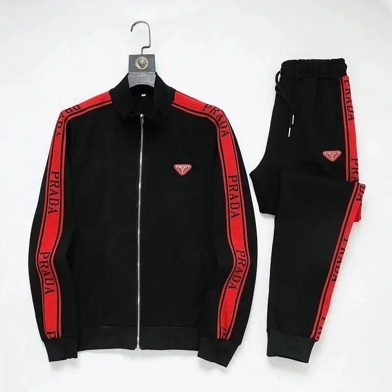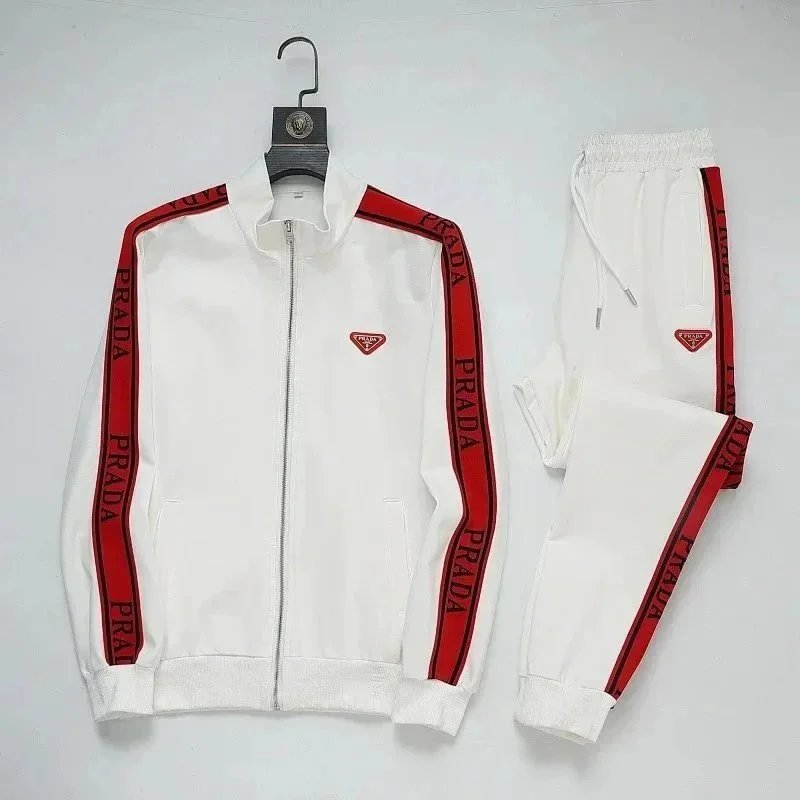 High-end Prada navy blue tracksuit featuring bold white stripes and signature branding. Includes a full-zip jacket and matching joggers with ribbed cuffs and waistband.