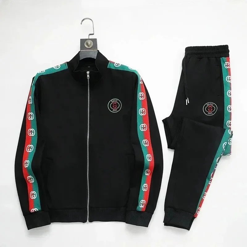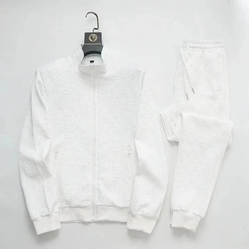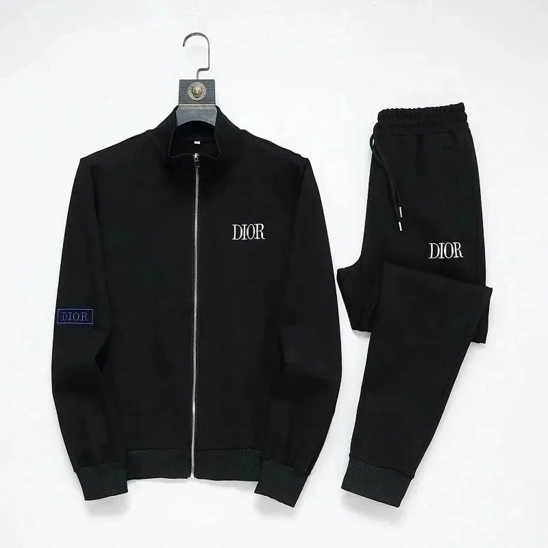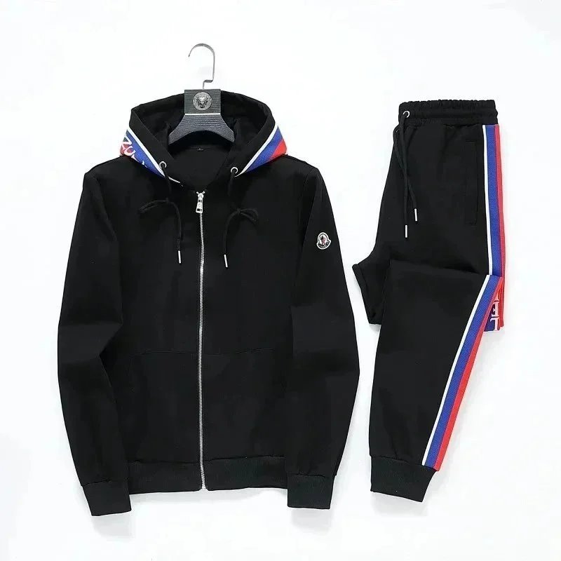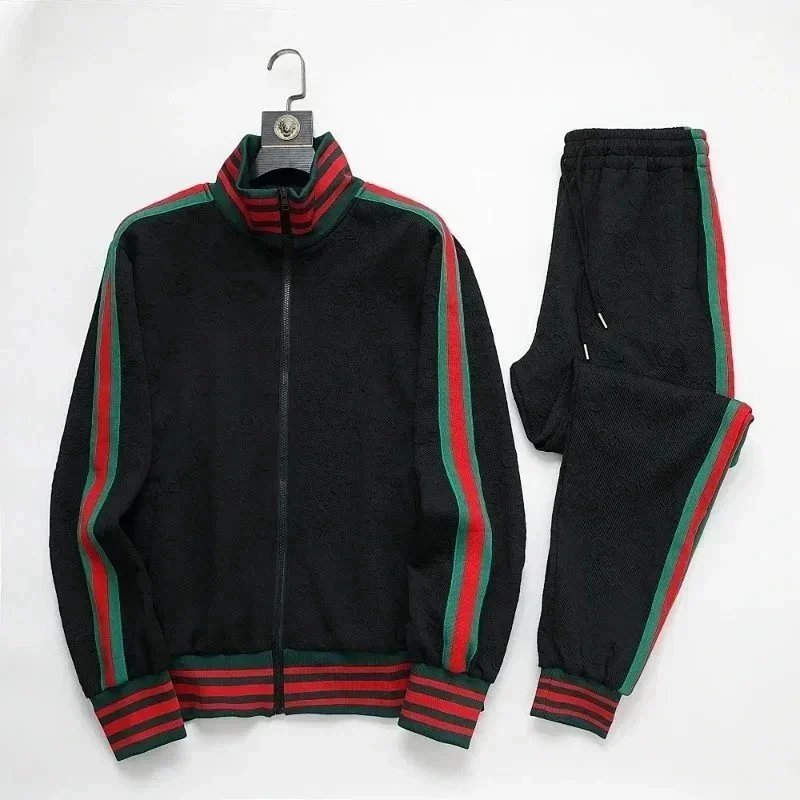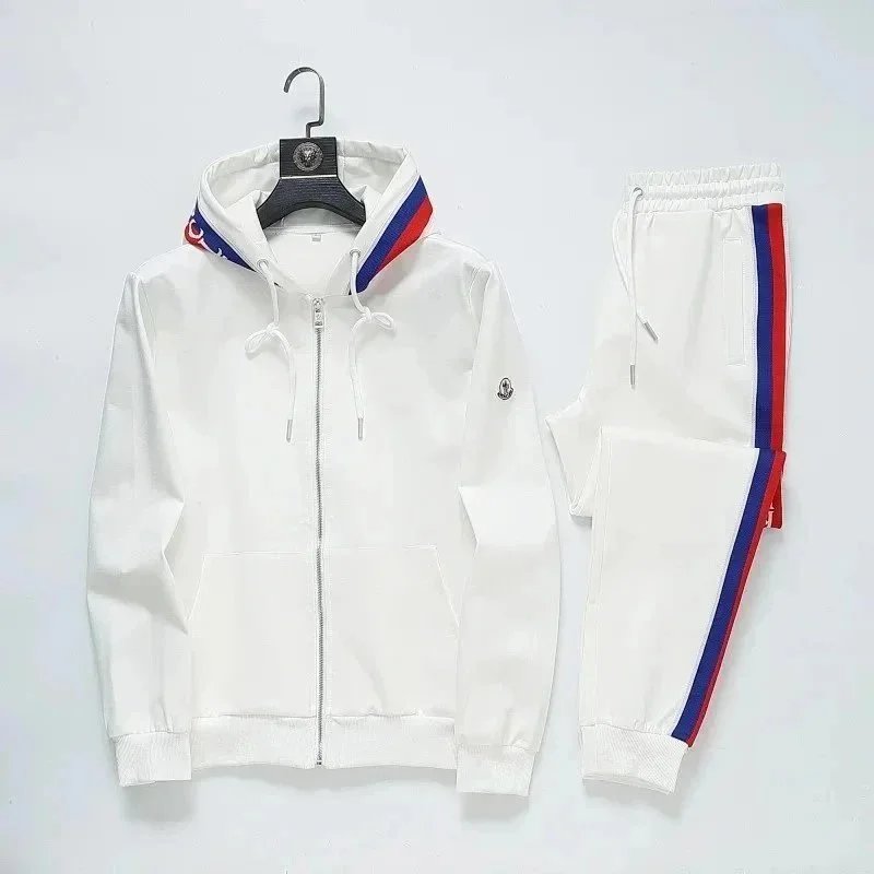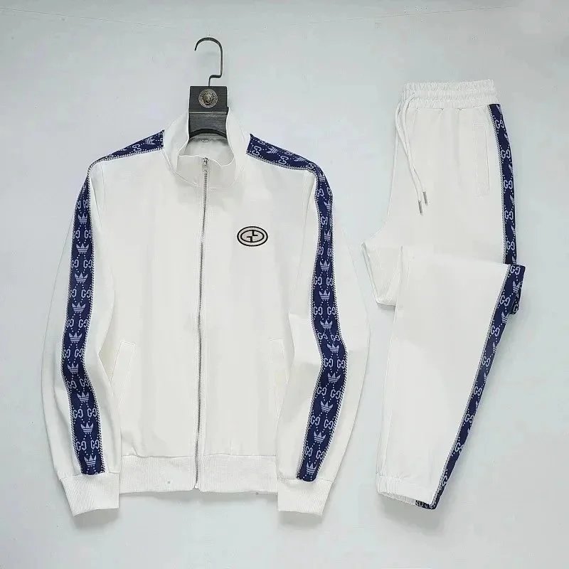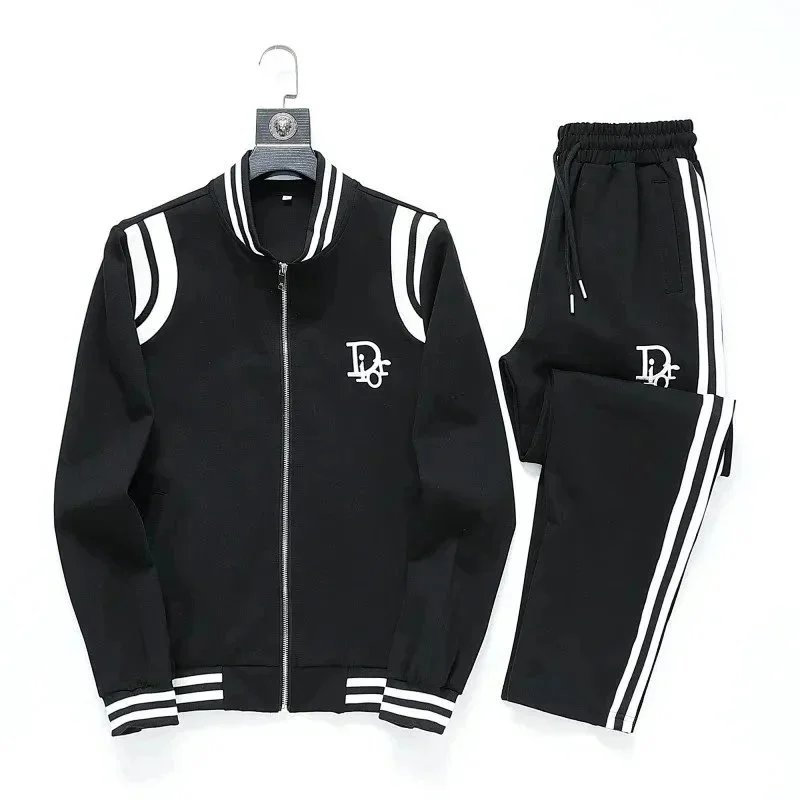 High-end Prada navy blue tracksuit featuring bold white stripes and signature branding. Includes a full-zip jacket and matching joggers with ribbed cuffs and waistband.