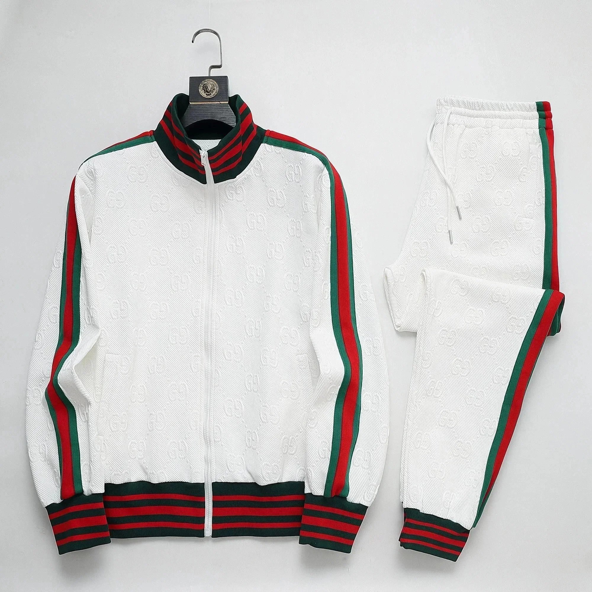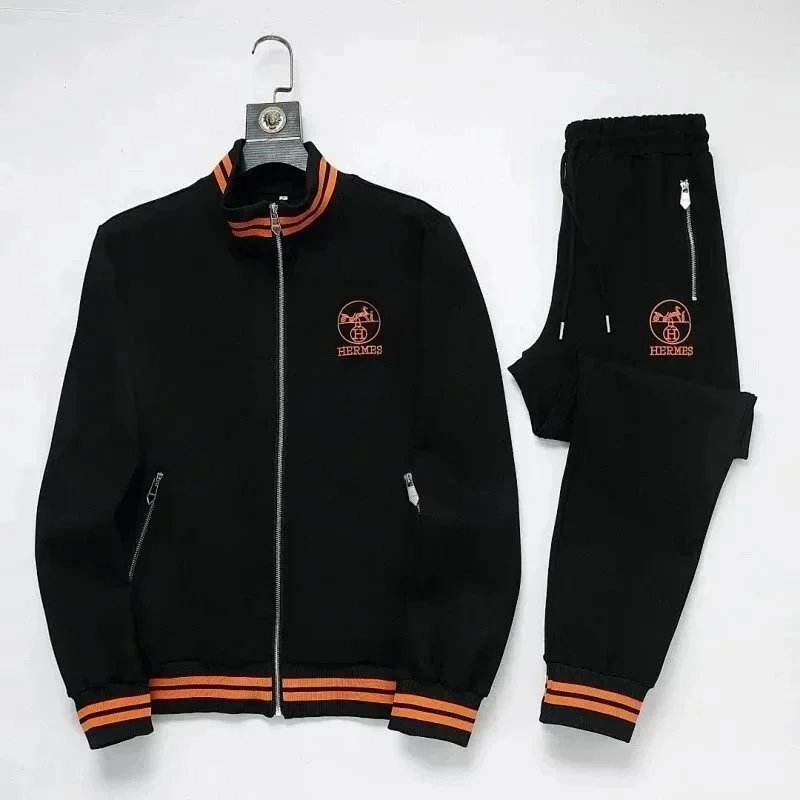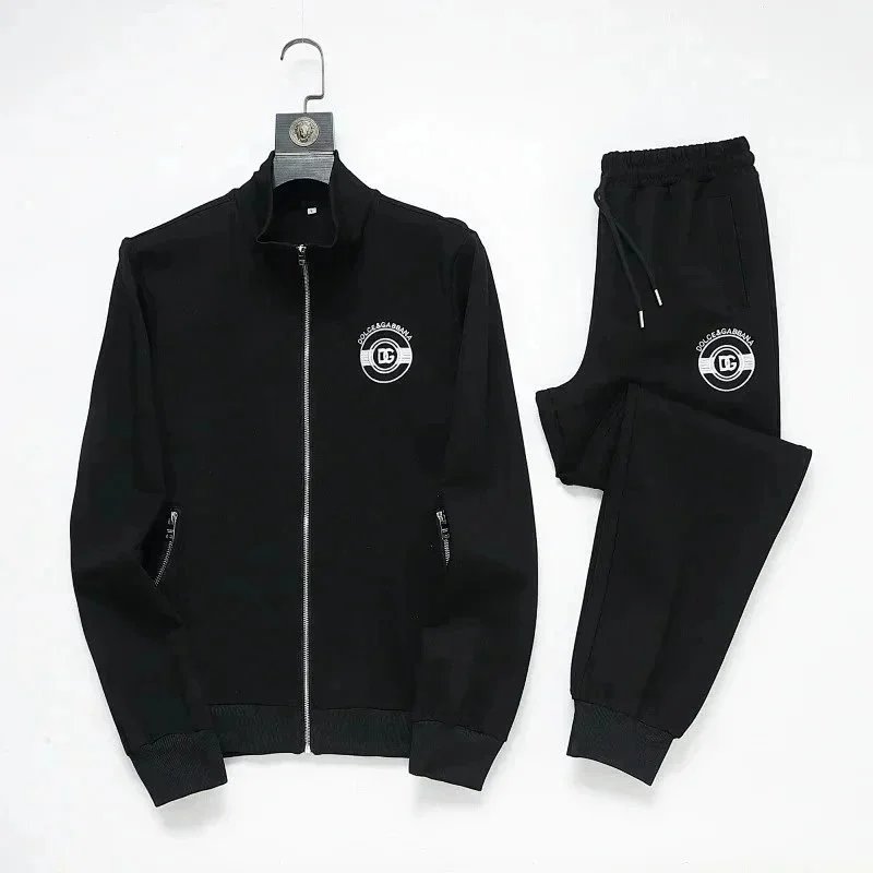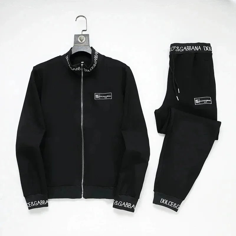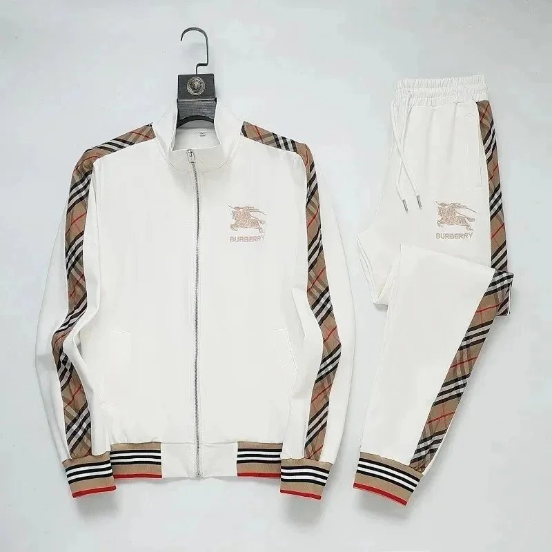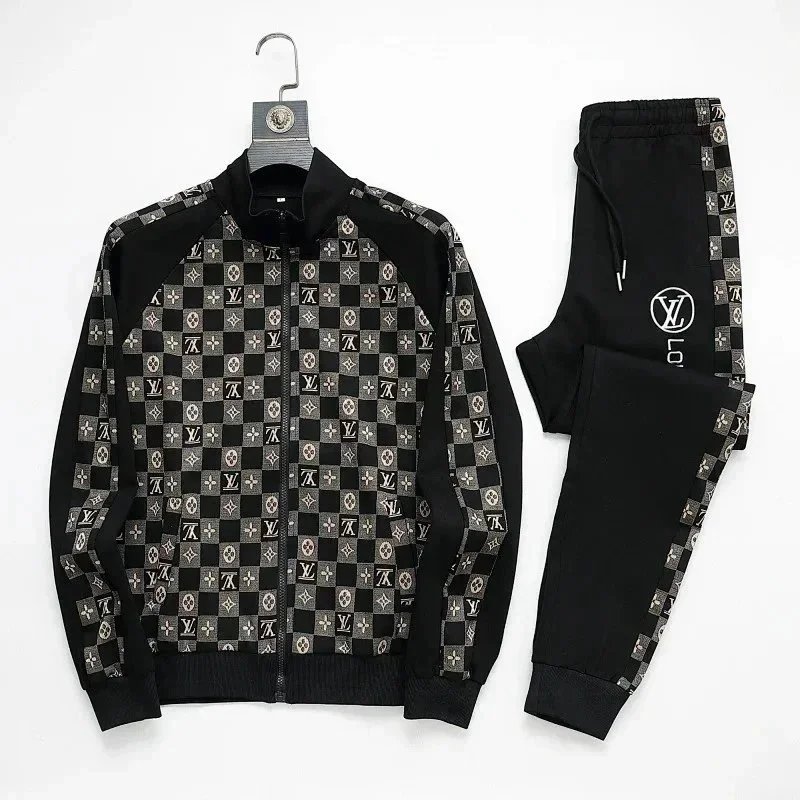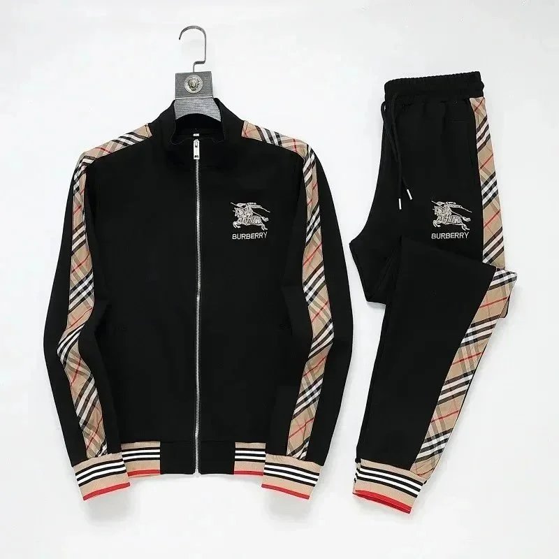 High-end Prada navy blue tracksuit featuring bold white stripes and signature branding. Includes a full-zip jacket and matching joggers with ribbed cuffs and waistband.