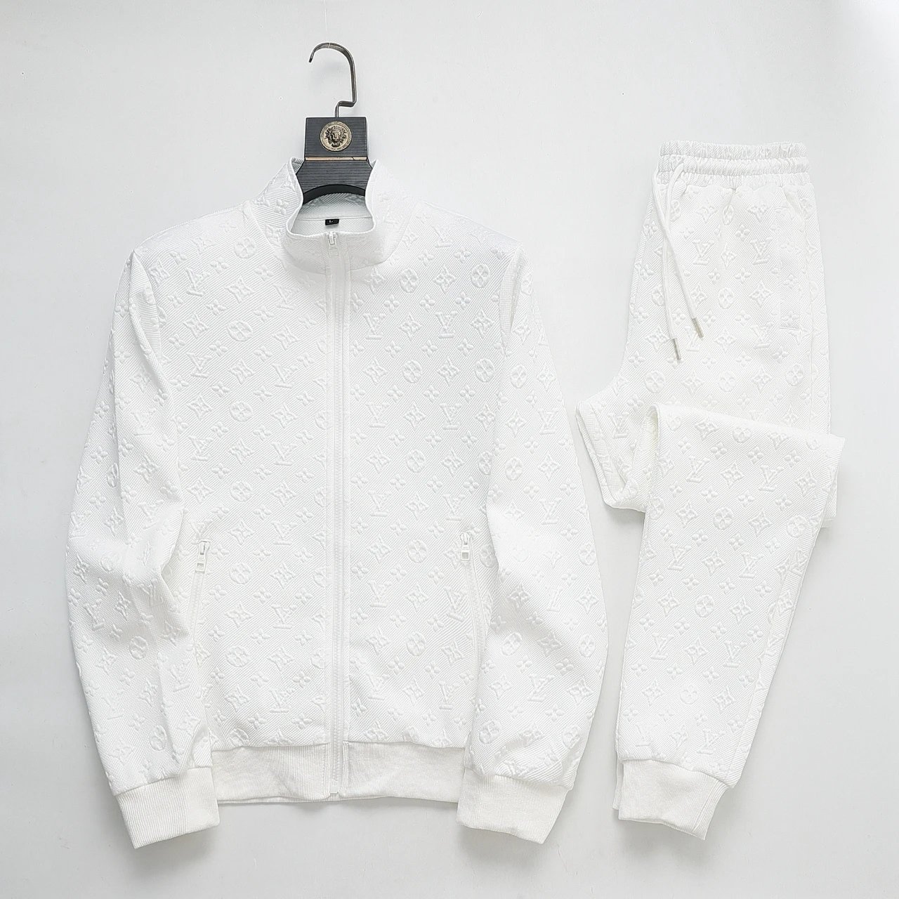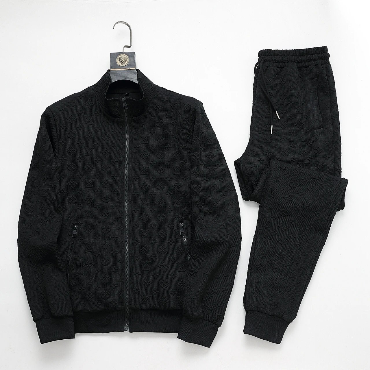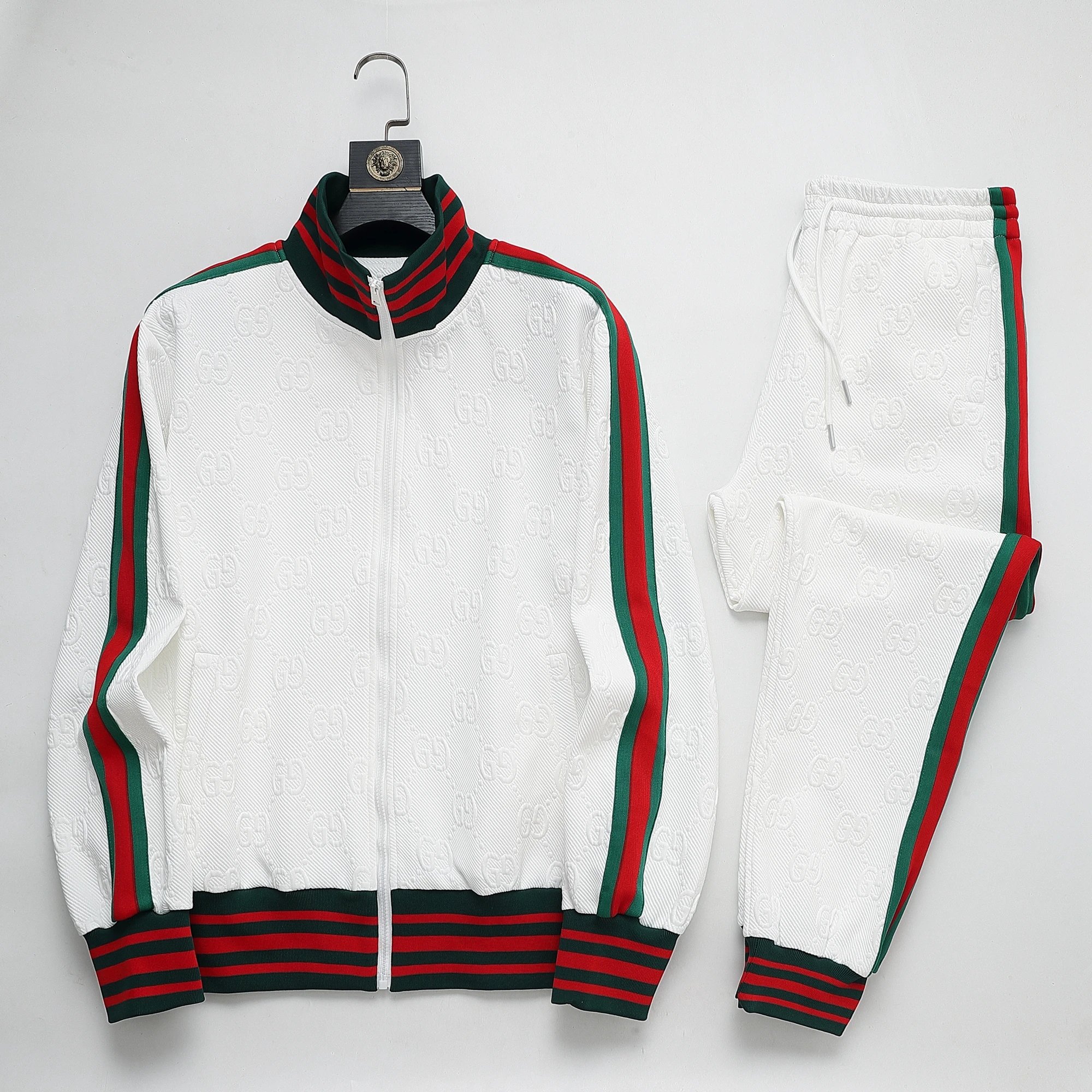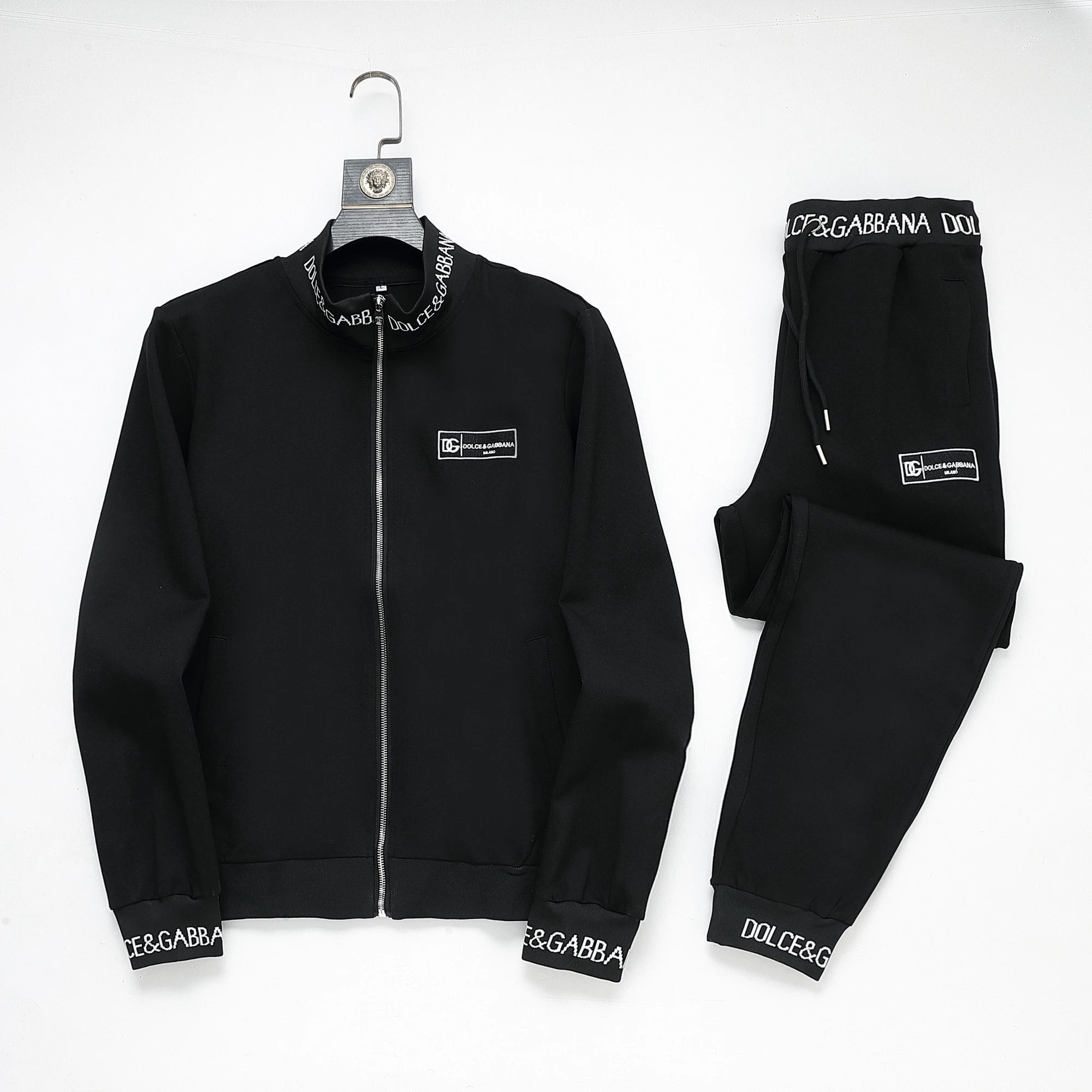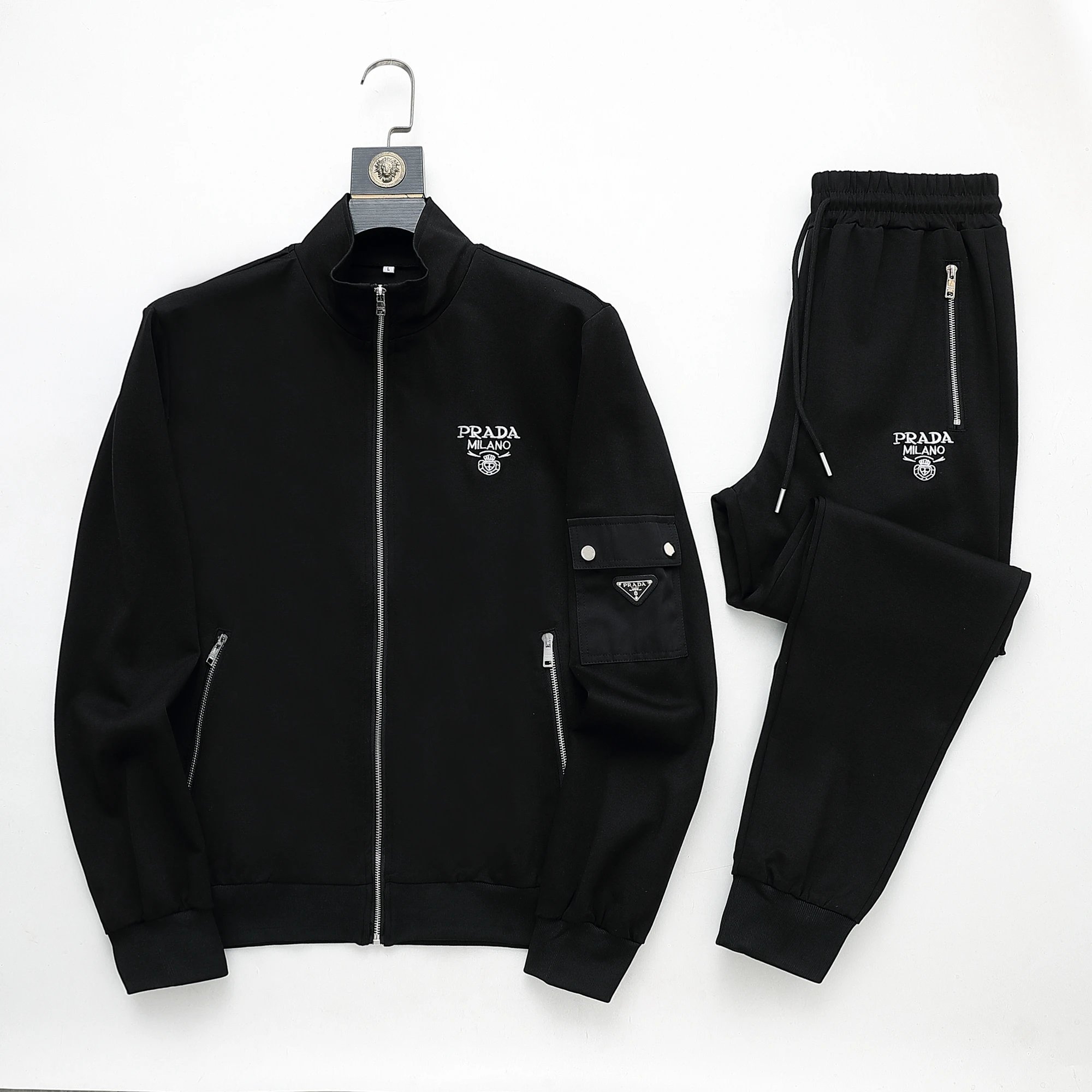 Stylish Prada navy blue track suit featuring white and black stripes, full-zip jacket with bold branding, and matching joggers with side stripes for a modern athletic look.