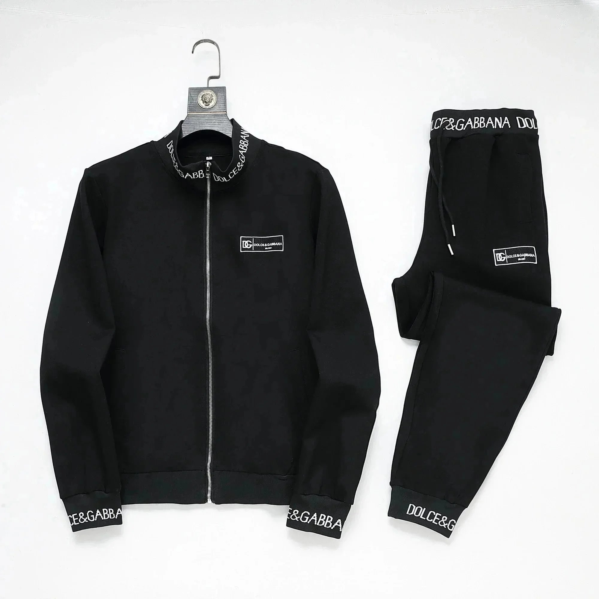 Stylish Prada navy blue track suit featuring bold white and black stripes, full-zip jacket, and matching pants with logo detailing. Perfect for casual elegance.