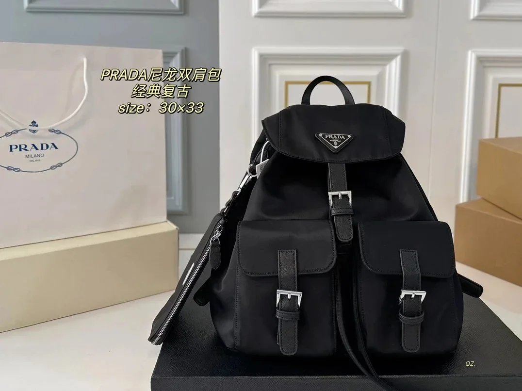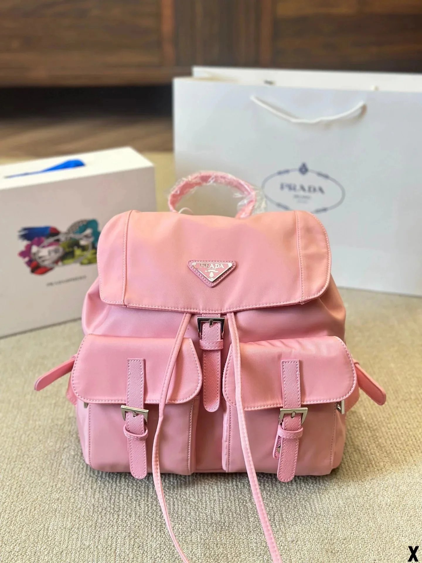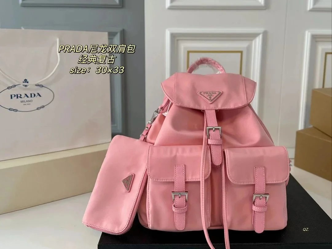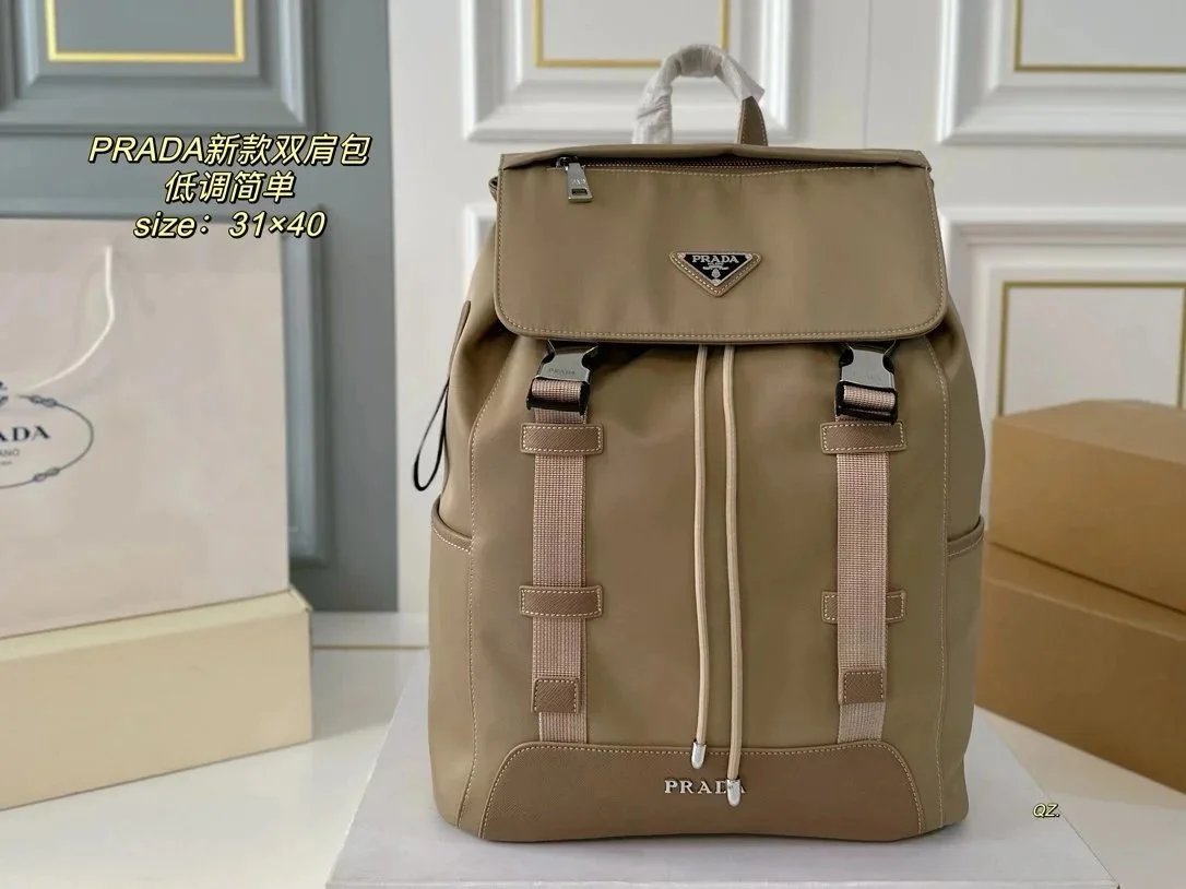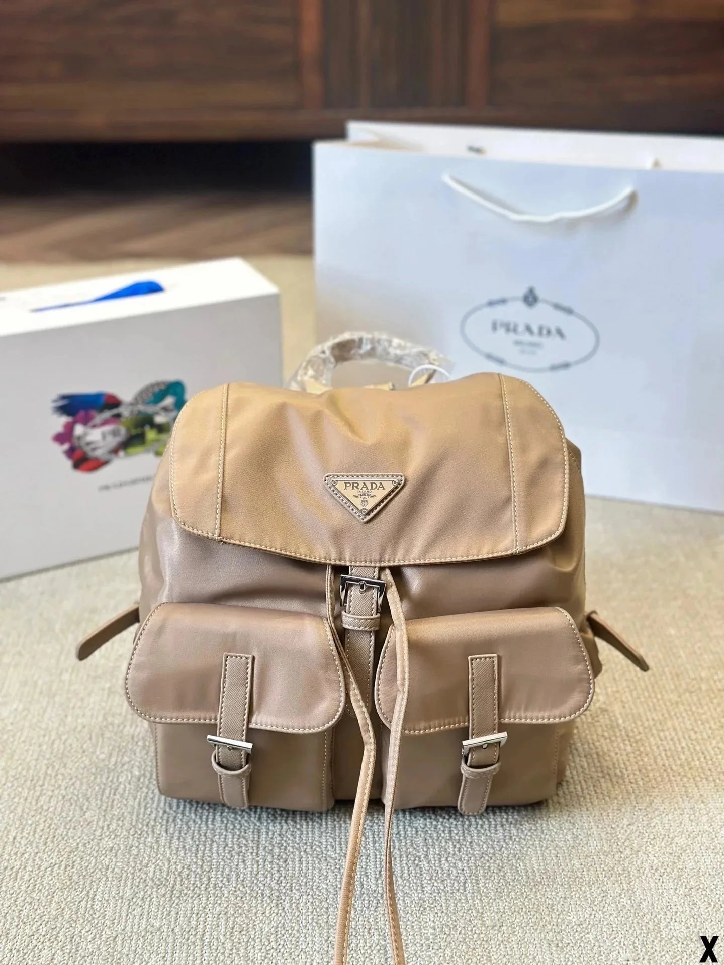 Stylish Prada nylon backpack in beige with classic vintage design, featuring dual front pockets and drawstring closure. Perfect for everyday use with timeless elegance.